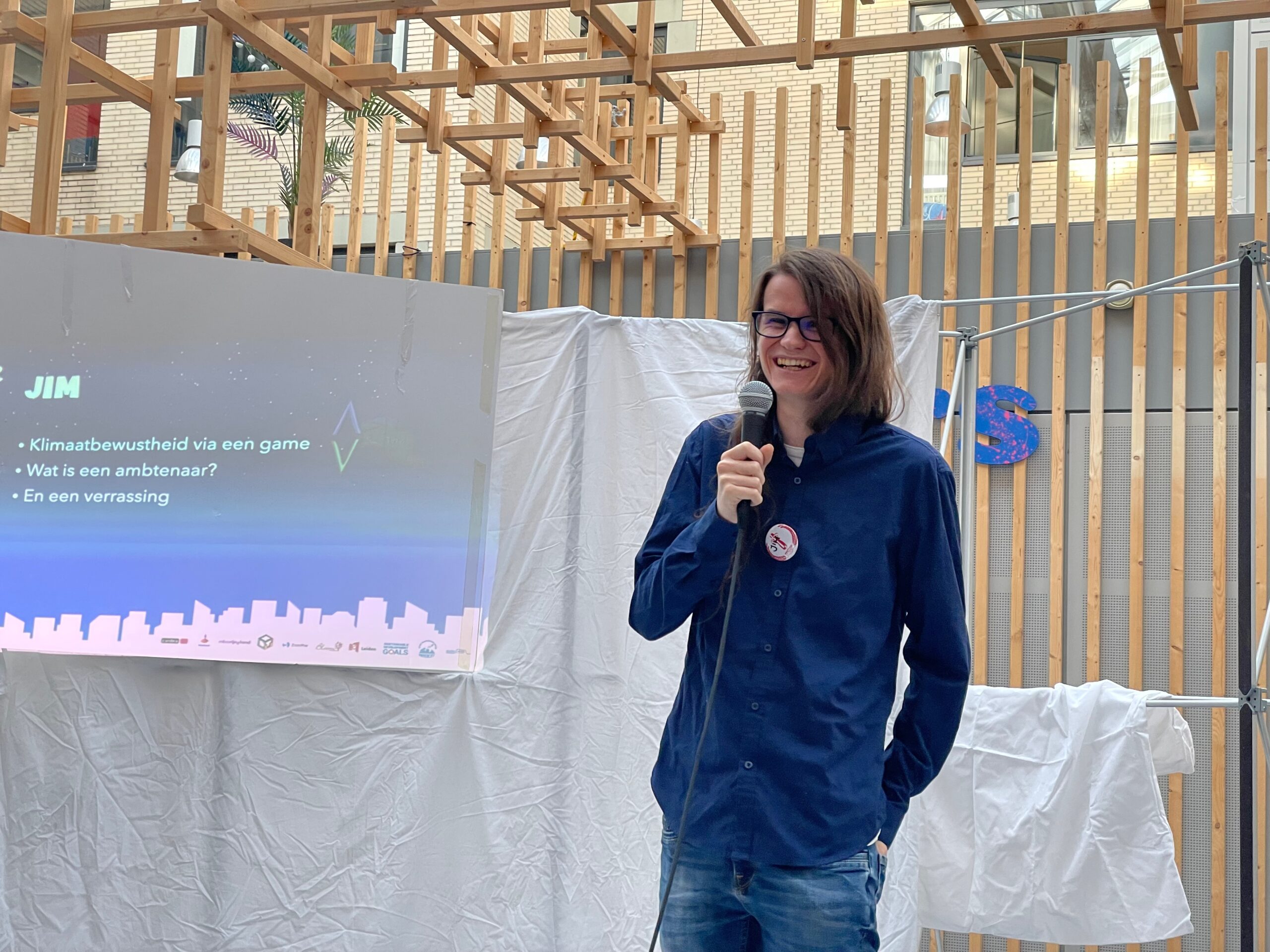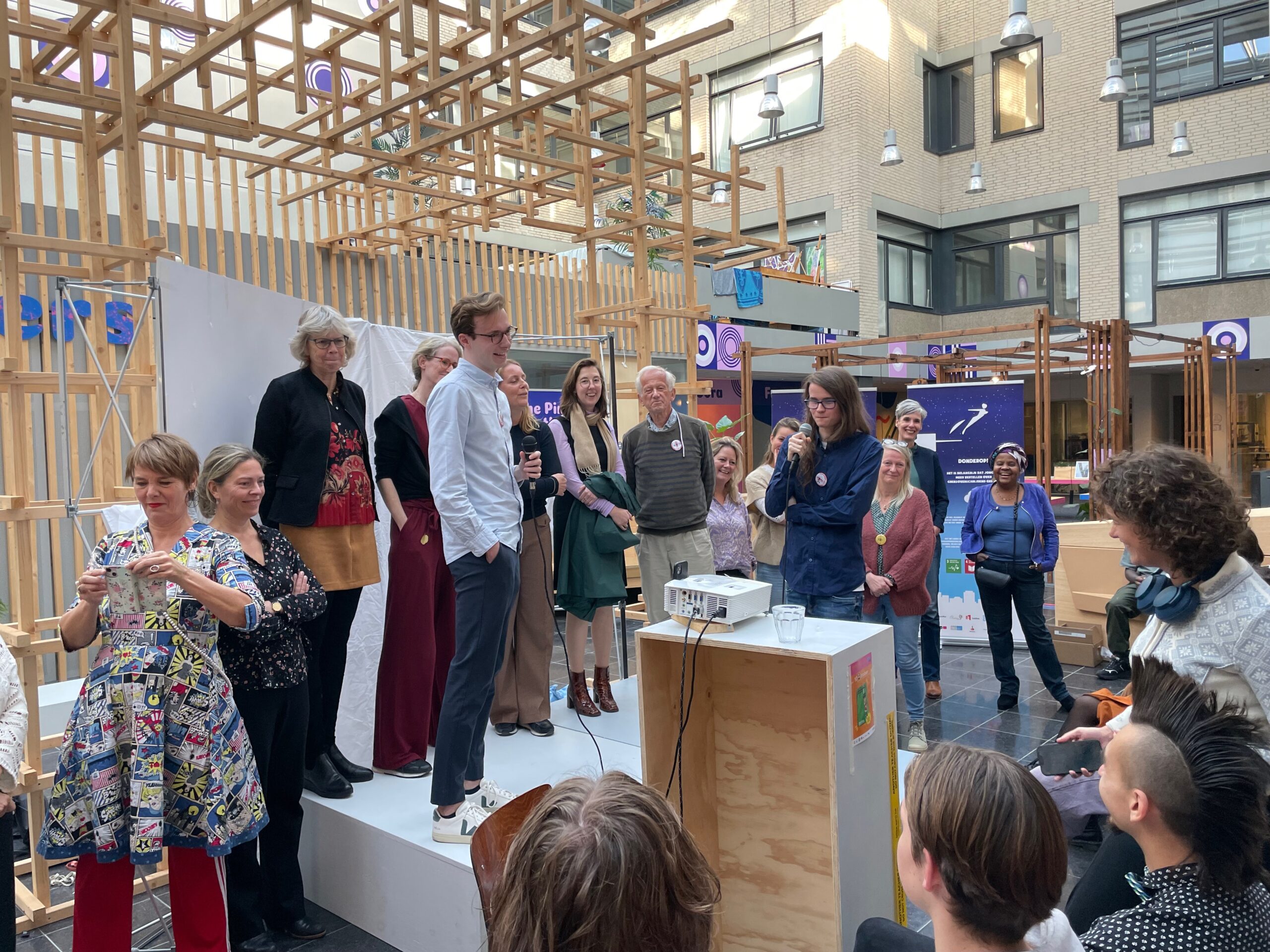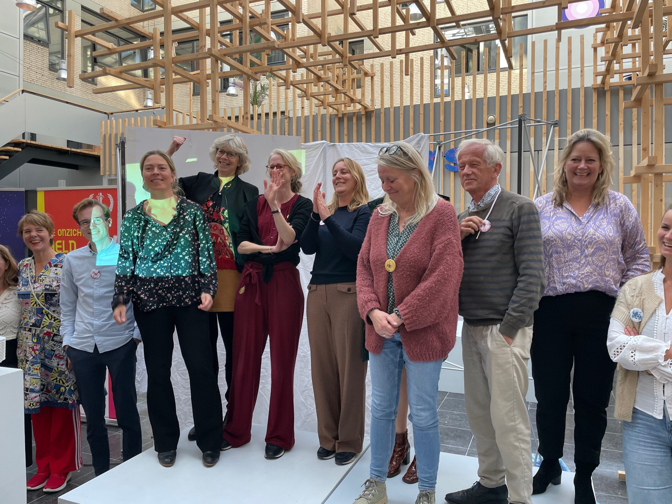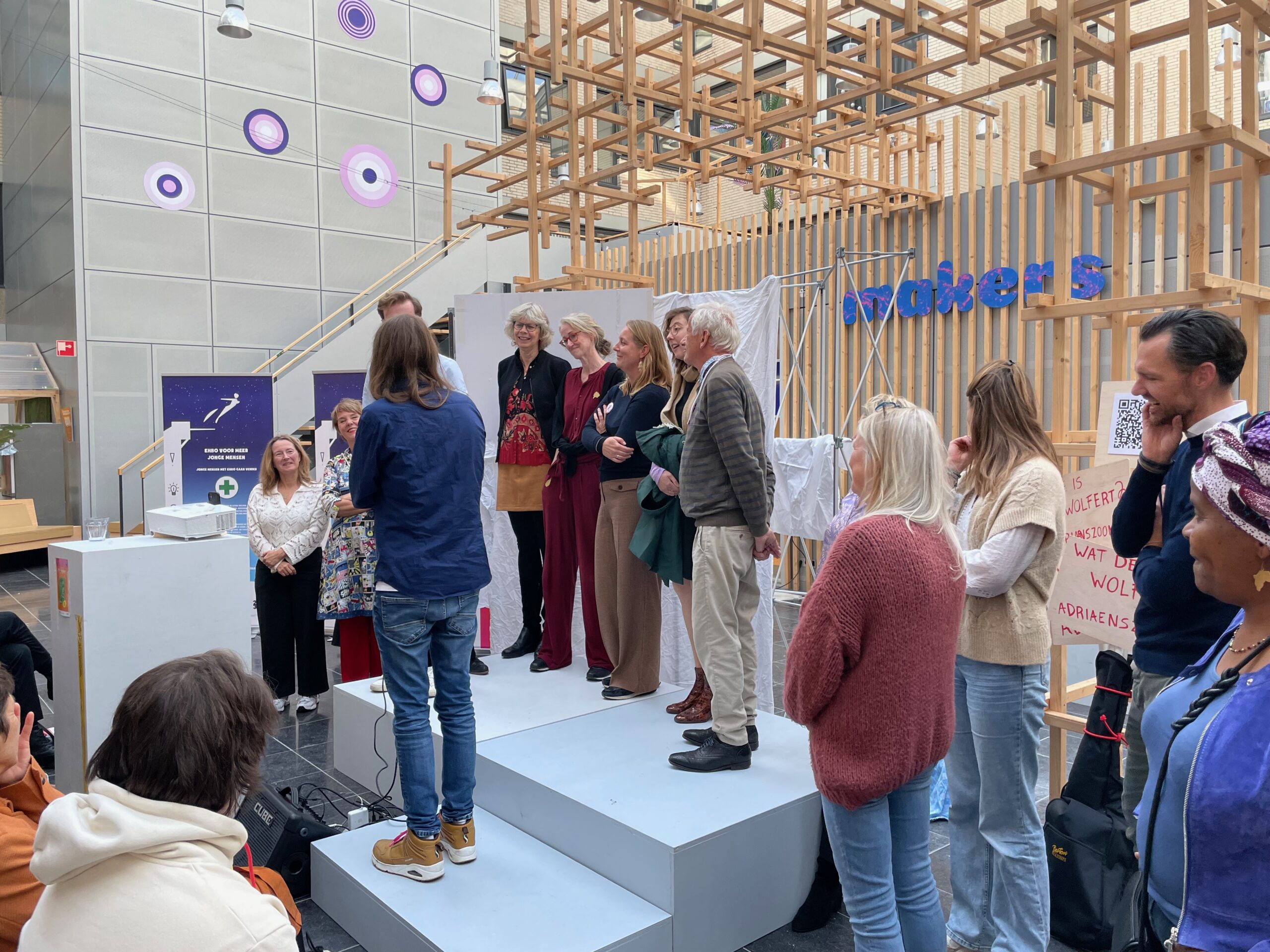 Jessica Hilhorst is er vanuit de gemeente Leiden bij betrokken. En praat de middag in de Makerscentrale aan de Langegracht aan elkaar. Al meteen in het begin zegt ze: “Er staat ook nog een verrassing op het programma, maar daar kan ik nog niks over zeggen. Omdat ik ook niet weet wat het is.” Wel ziet Hilhorst haar dochter binnenlopen en ook steeds meer collega’s. Na de prijsuitreiking verzucht Hilhorst een beetje beduusd. “Toen dacht ik wel, ze is iets van plan.” En die ‘ze’ is dan natuurlijk Nathalie Lecina.