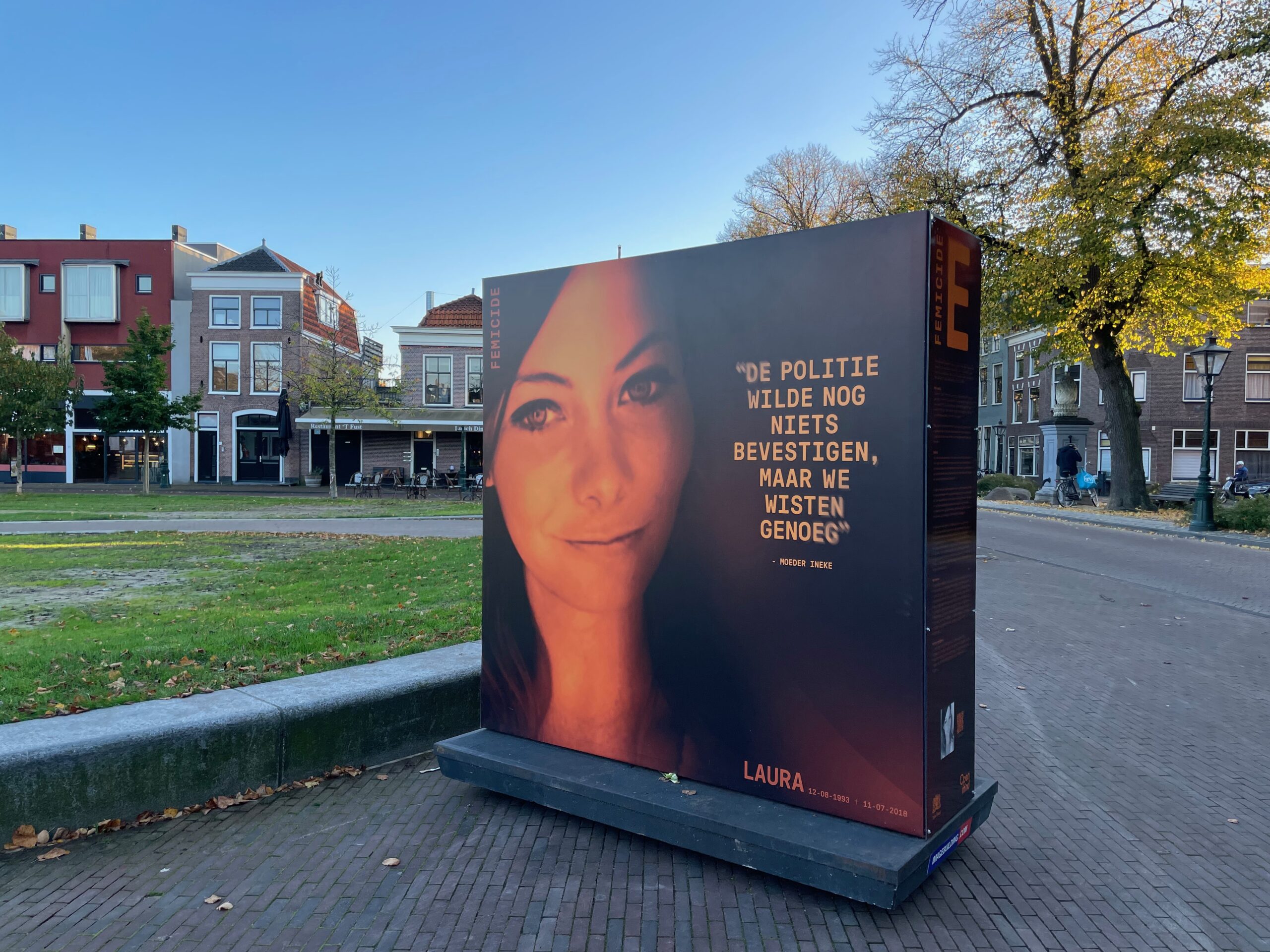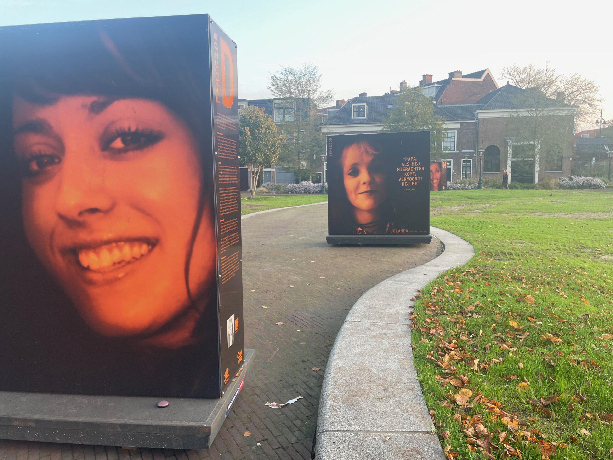 Op grote panelen op het Garenmarktplein staan niet alleen de portretten van vermoorde vrouwen, maar ook de verhalen van hun nabestaanden. Een moeder, een vader, een zus. Ze hadden allemaal wel rode vlaggen gezien, maar hun dochter of zus toch niet kunnen helpen. “Jaap, een van die nabestaanden, geeft als tip om en soort dossier op te bouwen als je denkt dat bij iemand in je omgeving te zien”, zegt Veenhoven. “Dan heb je bewijs in handen als je naar de politie stapt voor stalking of bedreiging.”