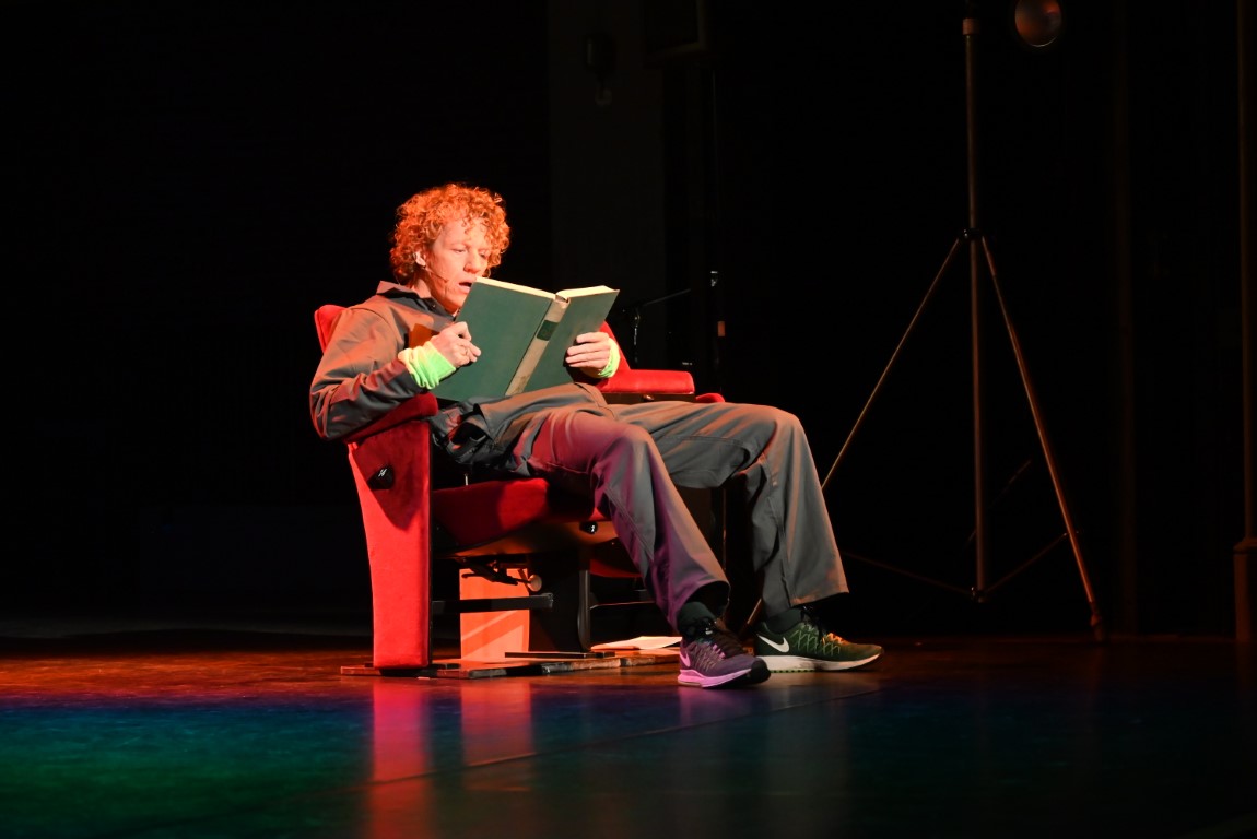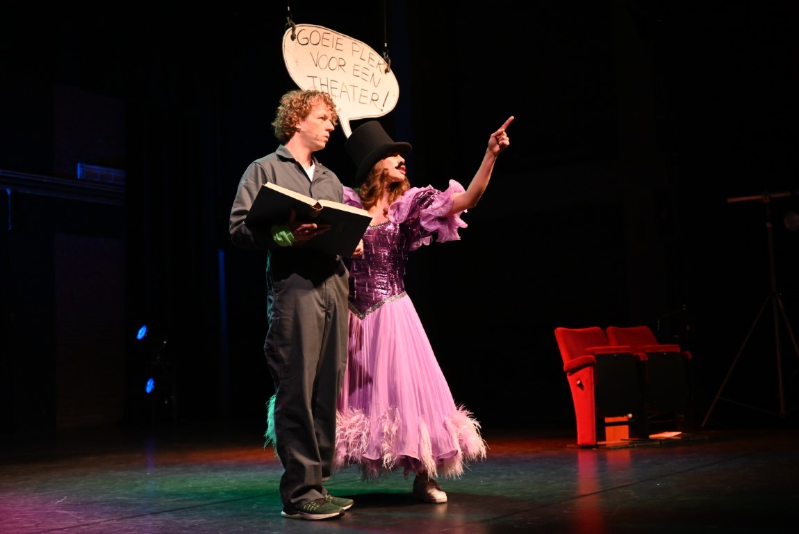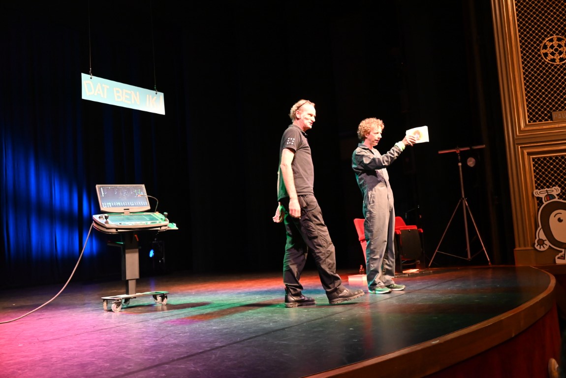 Het verhaal begon met de geschiedenis en het ontstaan van de Leidse Schouwburg. Alle facetten van de Schouwburg kwamen aan bod, waarbij verschillende medewerkers op het podium iets over hun werk kwamen vertellen en laten zien. Een video nam de kinderen mee naar plekken waar het publiek nooit komt, zoals de visagiste en de kleedkamers. Daar zat Jochem Myjer zich net voor te bereiden.