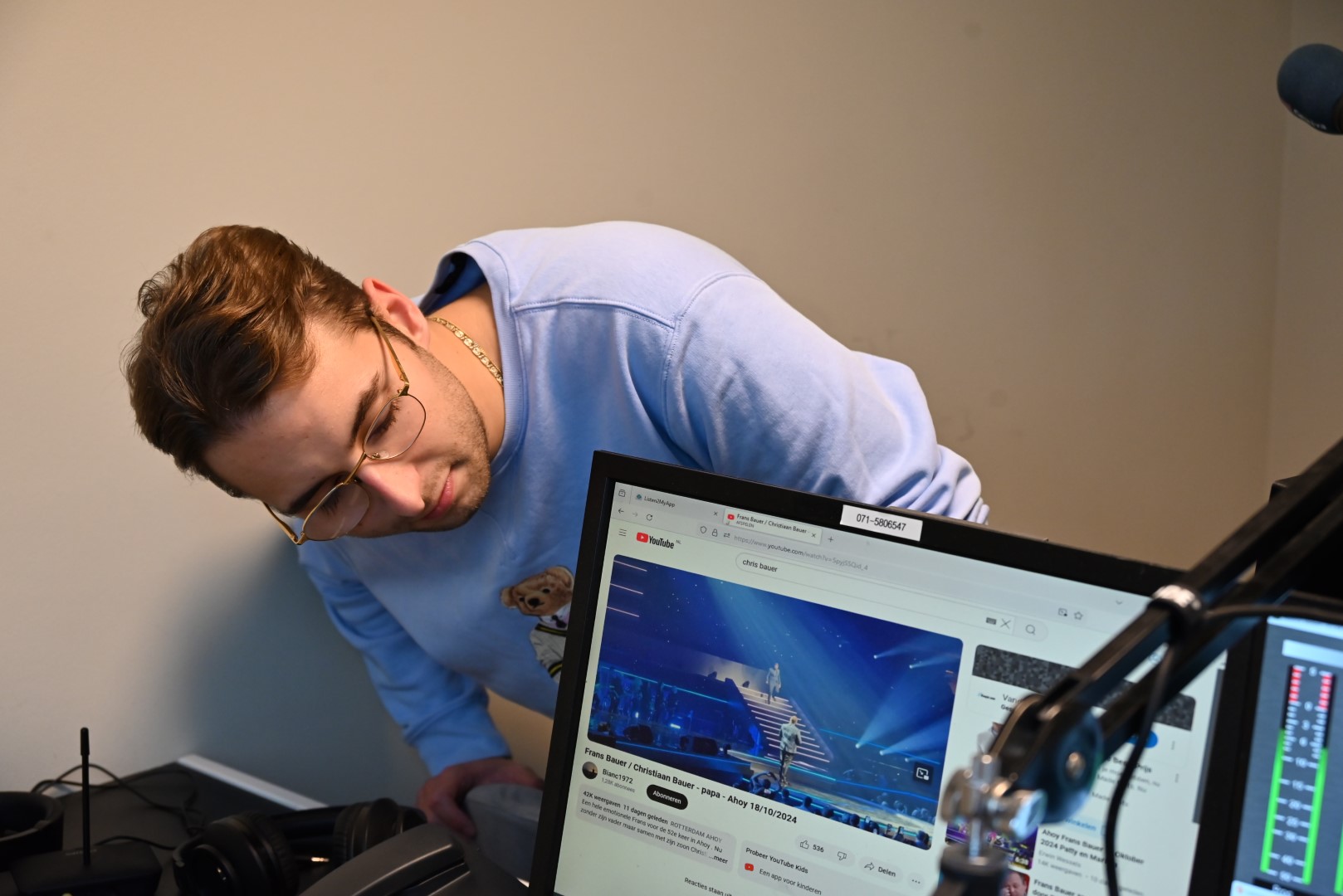 Een uur lang praatte Chris Bauer voluit over zijn plannen als zanger en zijn bijna afgeronde studie Belastingrecht. Bauer studeert in Leiden, maar woont nog bij zijn ouders in het Brabantse Fijnaart. DJ Tim kreeg overal antwoord op, zelfs op de eetgewoontes van de familie. “Om de week wordt er op zondagavond Chinees gegeten en de andere week frietjes.”