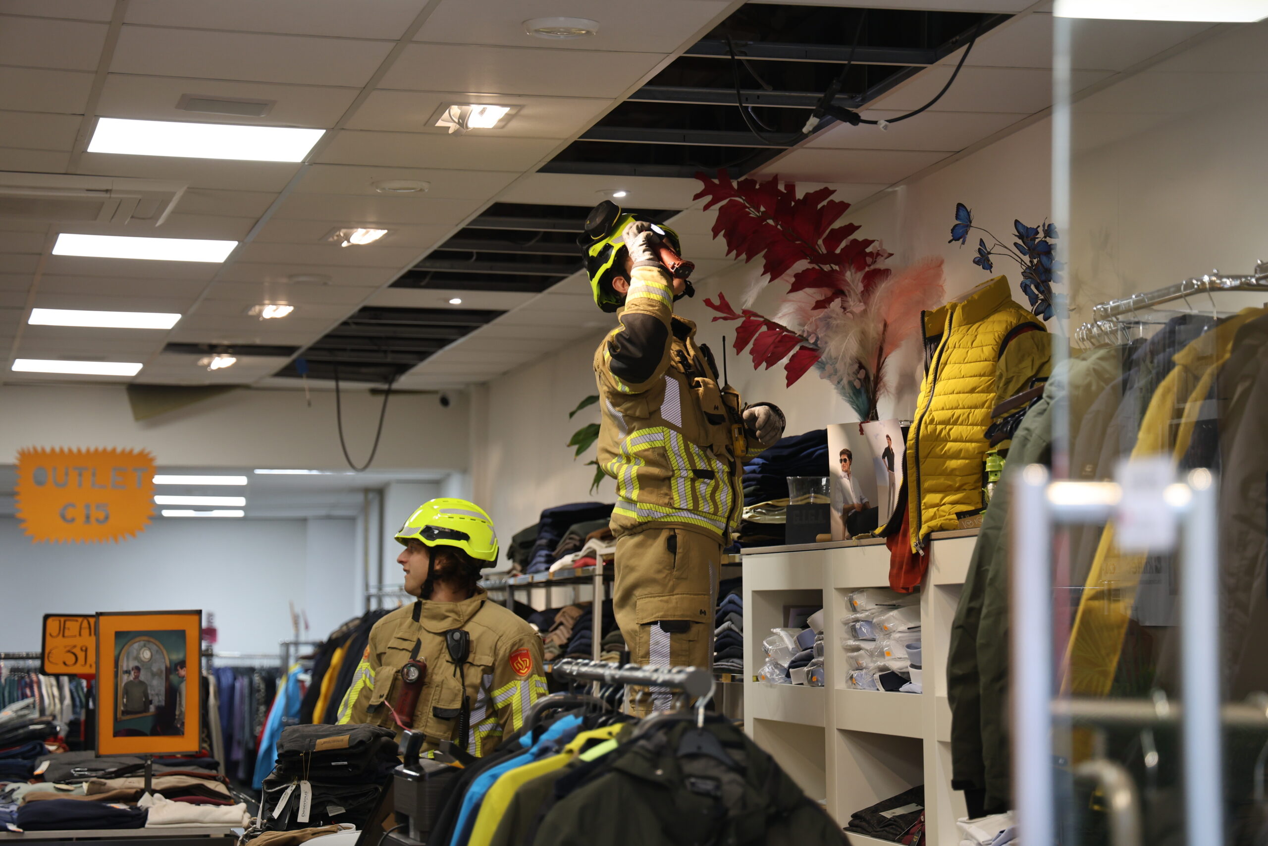 Een groot en zwaar plafonddeel van zo’n twee bij twee meter is donderdagmiddag naar beneden gestort in een kledingwinkel aan de Breestraat 111 in Leiden.