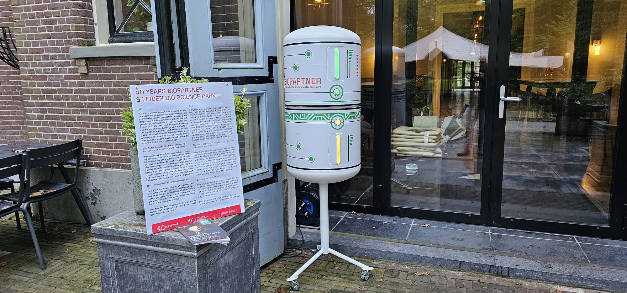 Dorpsmarketeer Marjolijn van der Jagt zocht contact met Bio Partner, dat op het Bio Science Park gevestigd is. Bio Partner heeft de futuristisch ogende tijdcapsule gemaakt.