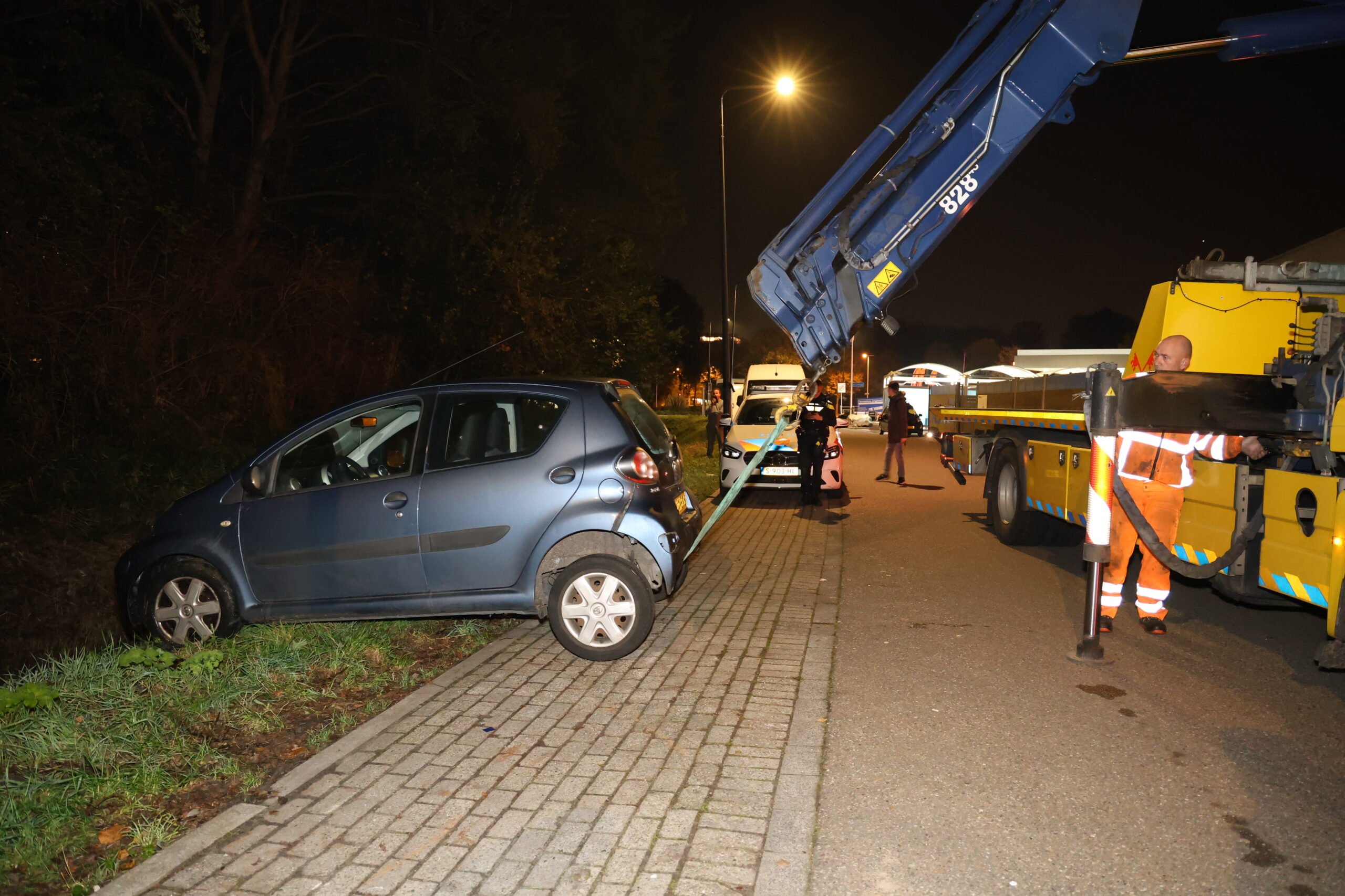 De bestuurder was vergeten om de auto op de handrem te zetten, waardoor de auto het via het talud het water in kon rollen. De brandweer heeft de auto weer op de kant getakeld.