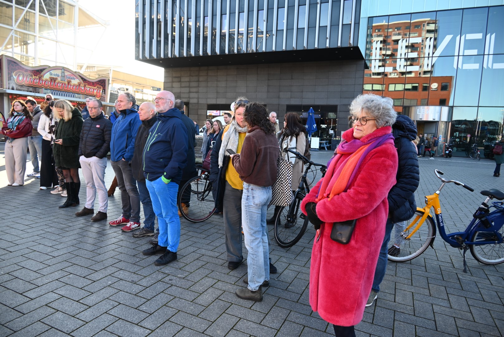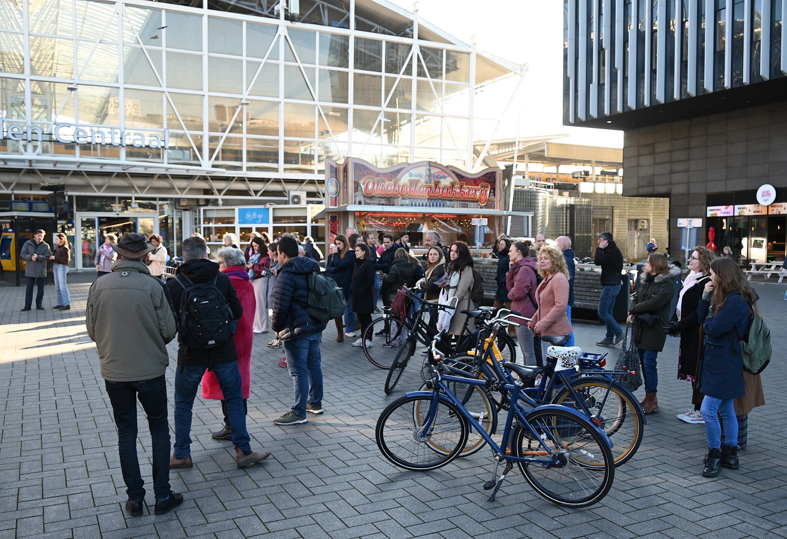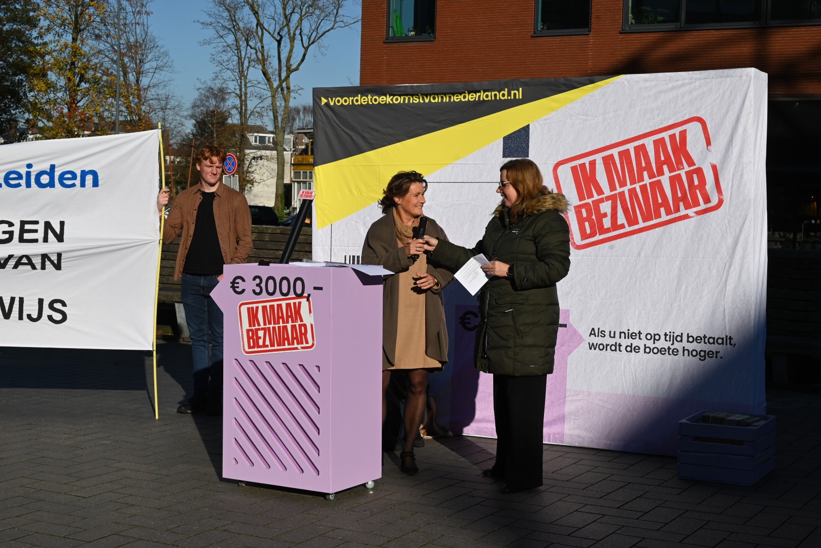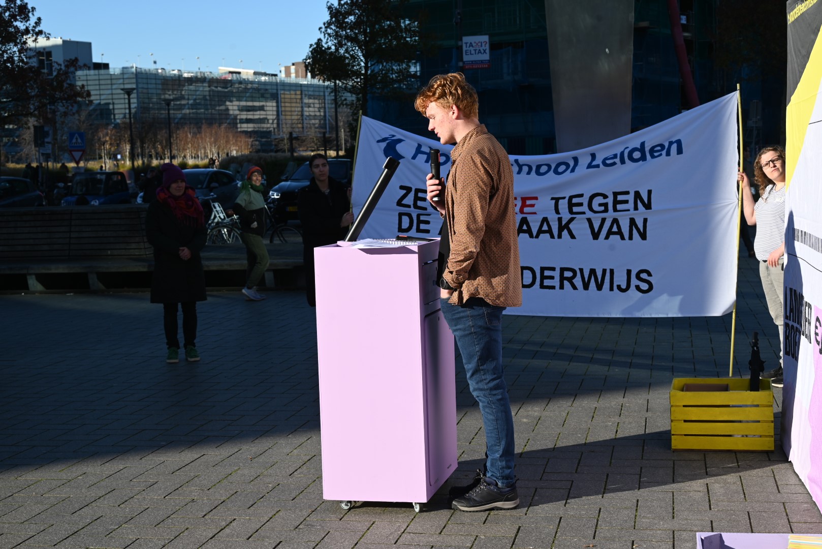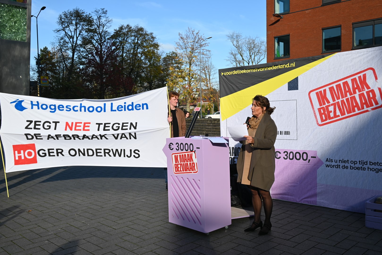 Het bestuur, studenten en docenten van de Hogeschool Leiden hebben dinsdagmiddag op het stationsplein aan de LUMC-kant van Leiden geprotesteerd tegen de onderwijsbezuinigingen en de langstudeerboete. Dit deden ze door enkele van in totaal zo’n 25.000 bezwaarschriften tegen de voorstellen voor te lezen.