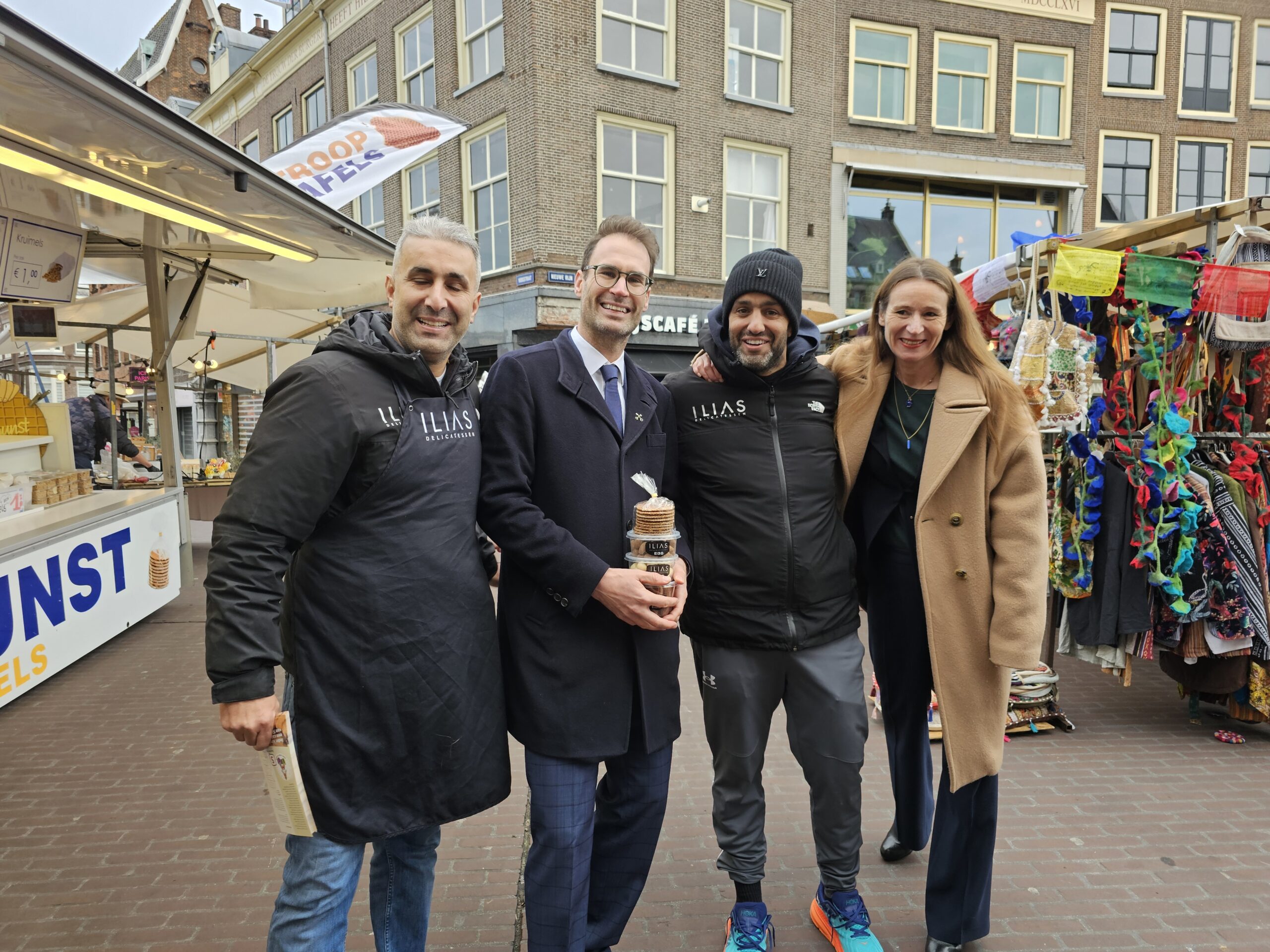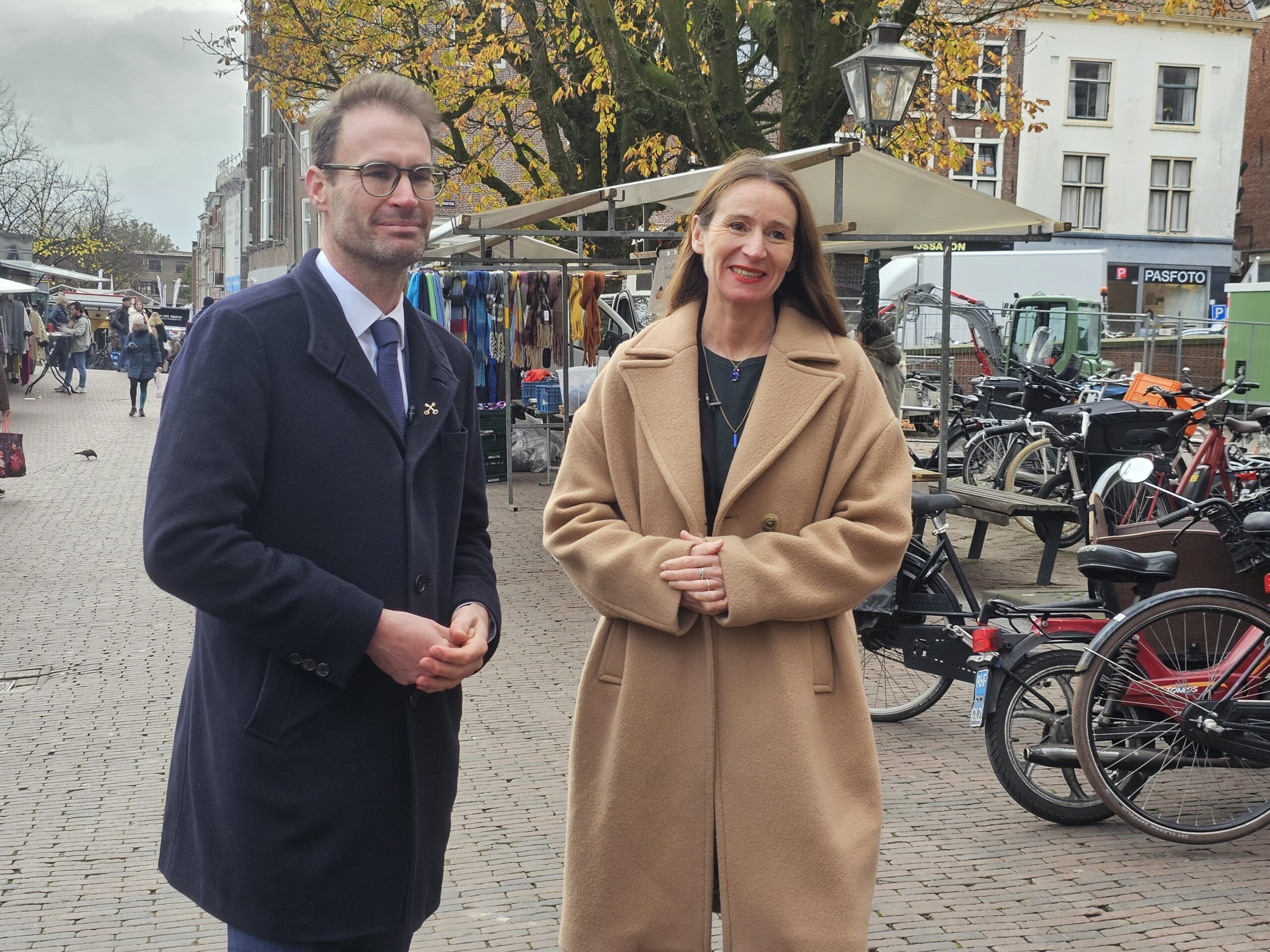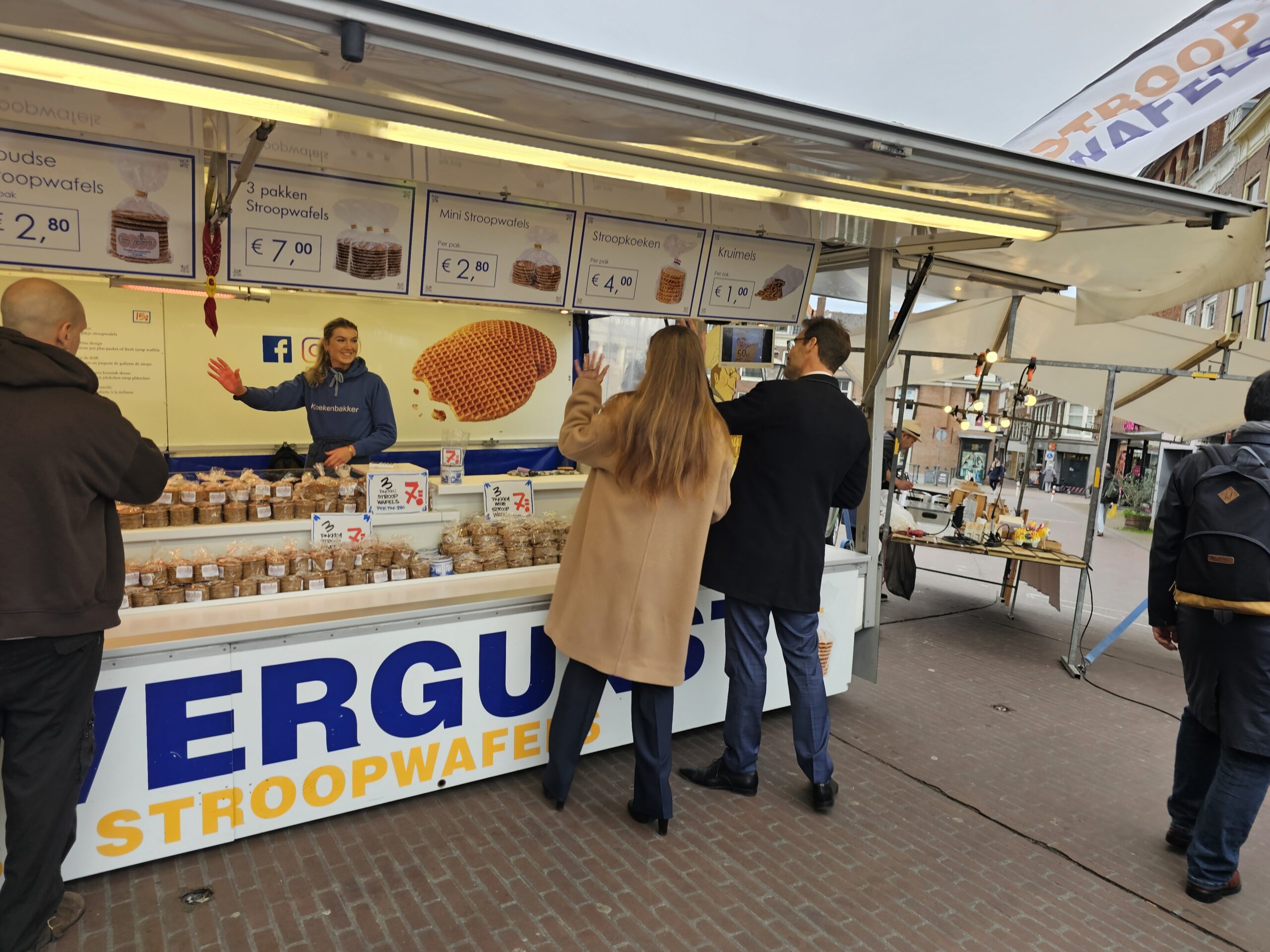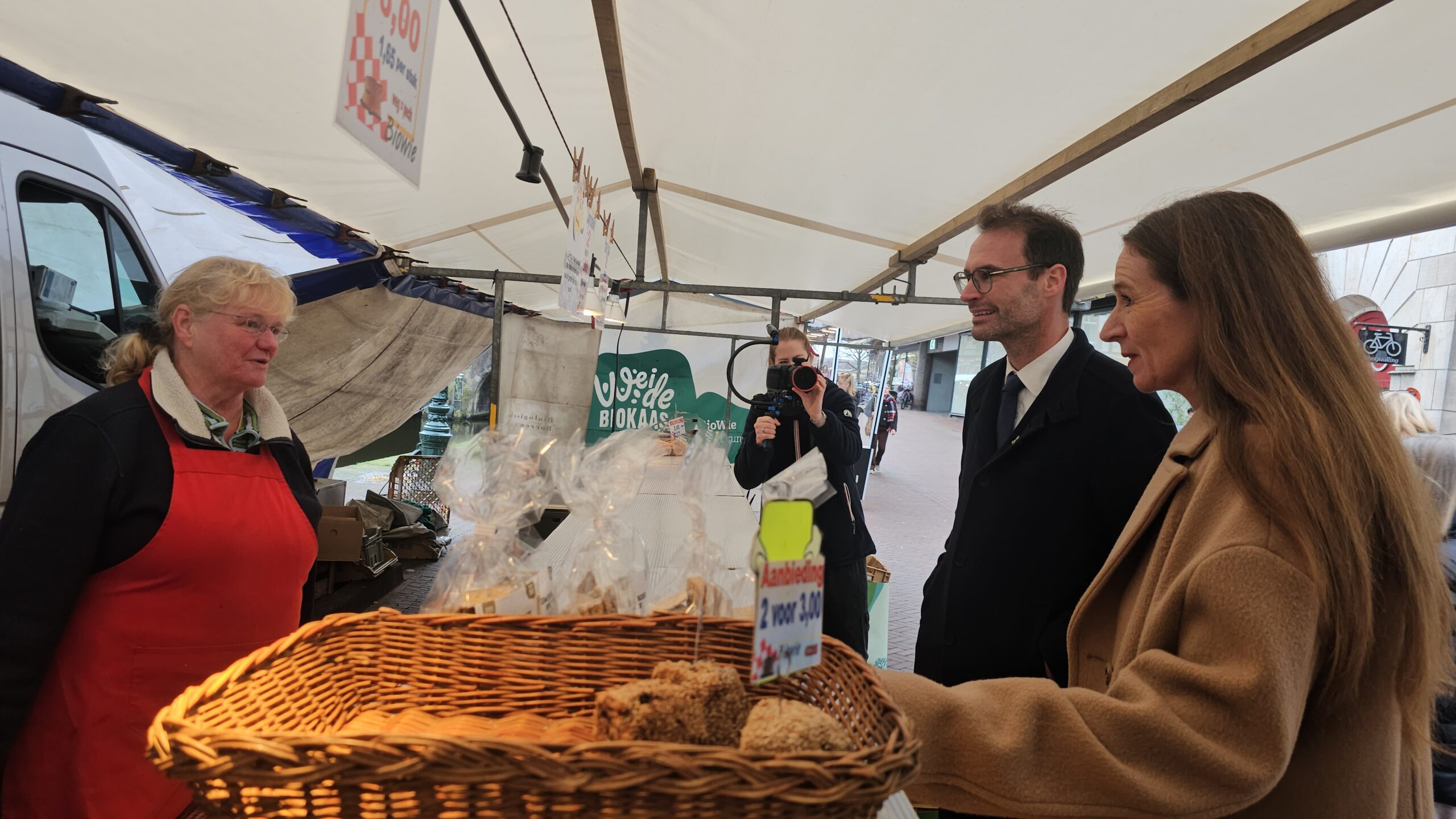 Bij hun rondje langs de marktkramen op de Aal-, Vis- en Botermarkt maken de stadsbestuurders met veel ondernemers een praatje. Ook hadden ze een presentje meegebracht om hun waardering te tonen voor de marktkooplui die de afgelopen maanden na jaren van strijd met de gemeente nu toch met een gezamenlijk plan zijn gekomen voor een nieuwe inrichting van het hele marktgebied.