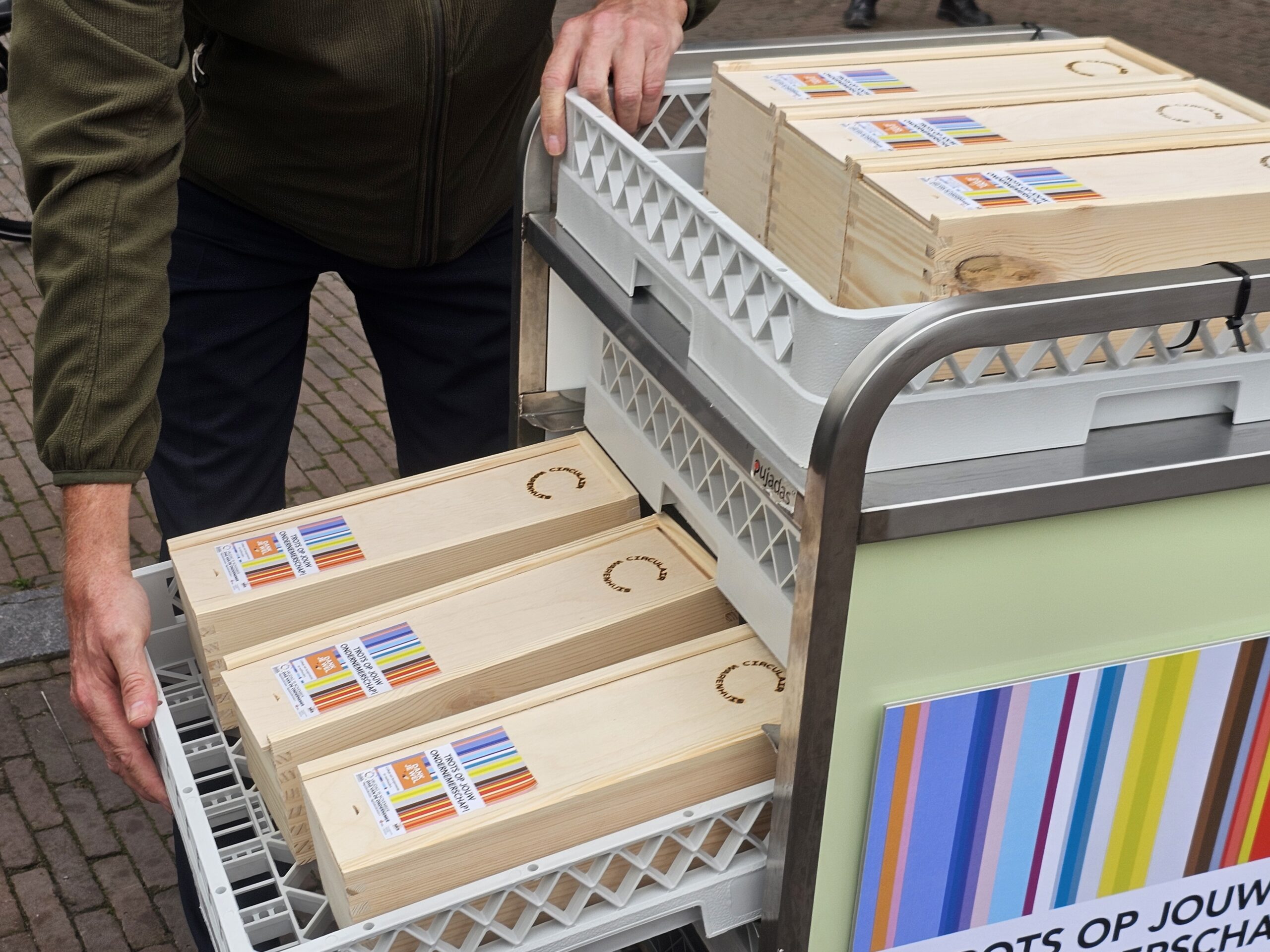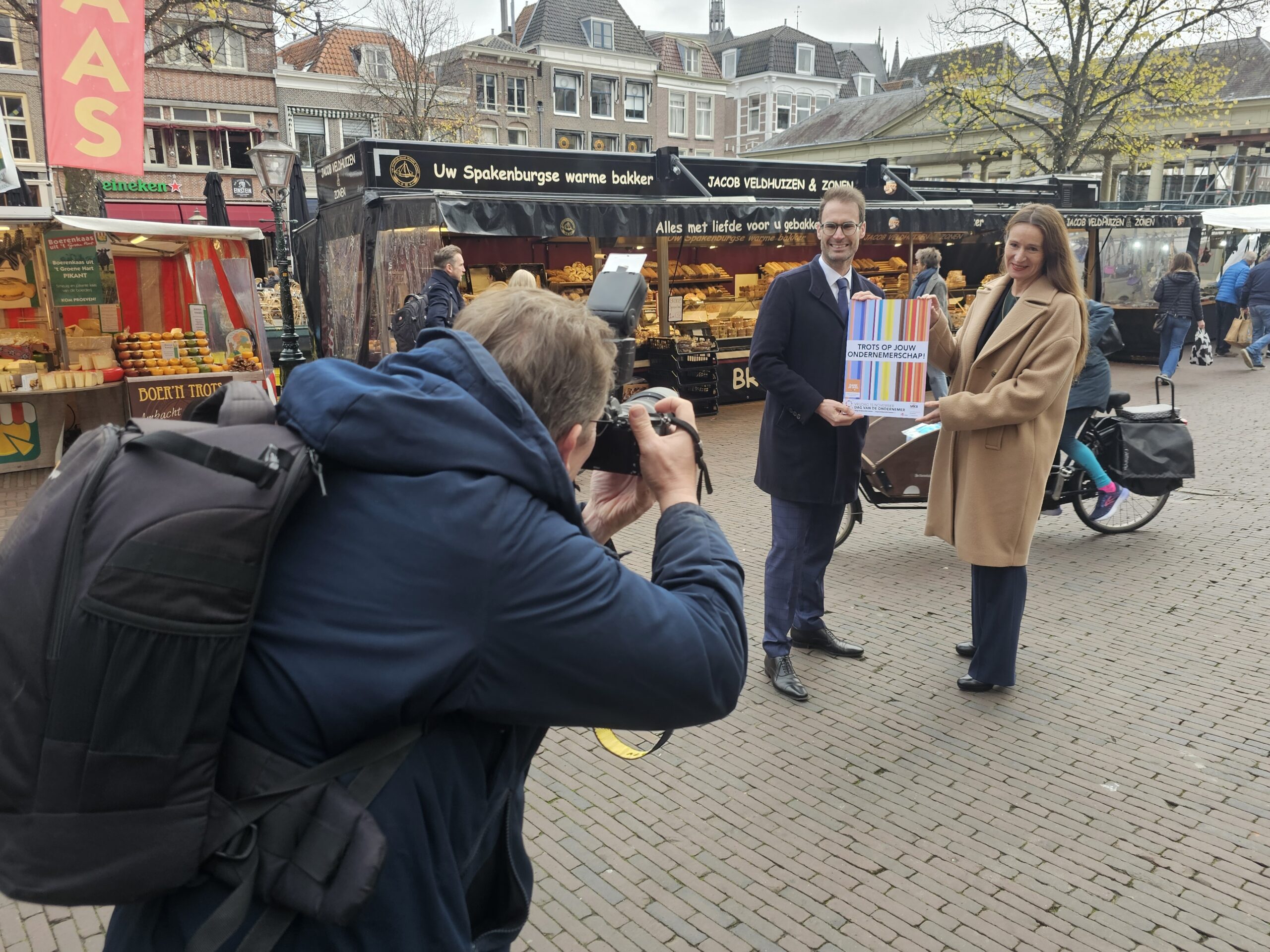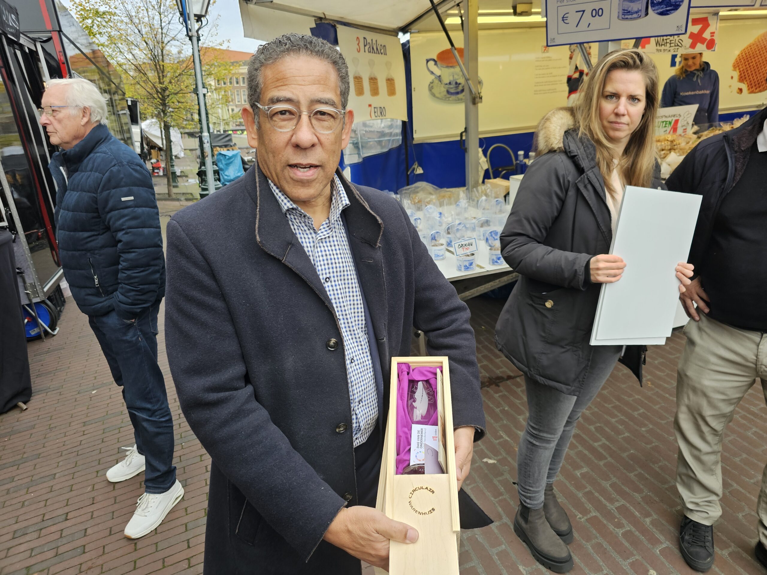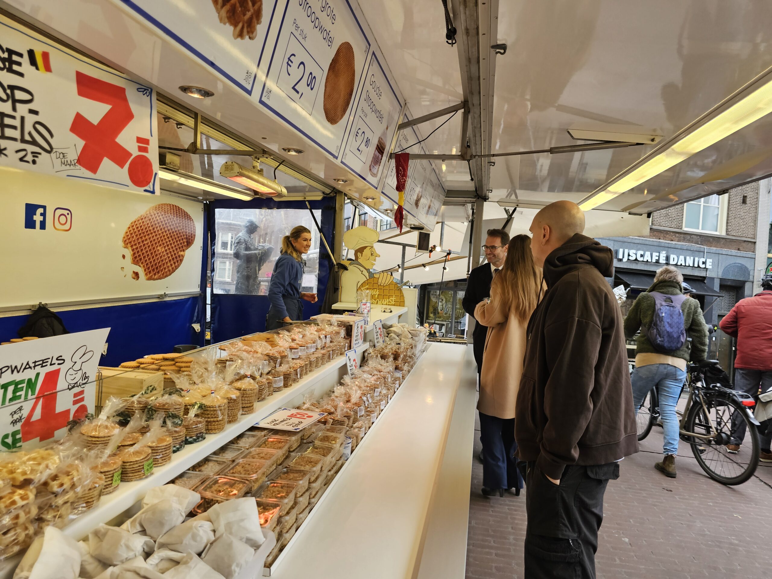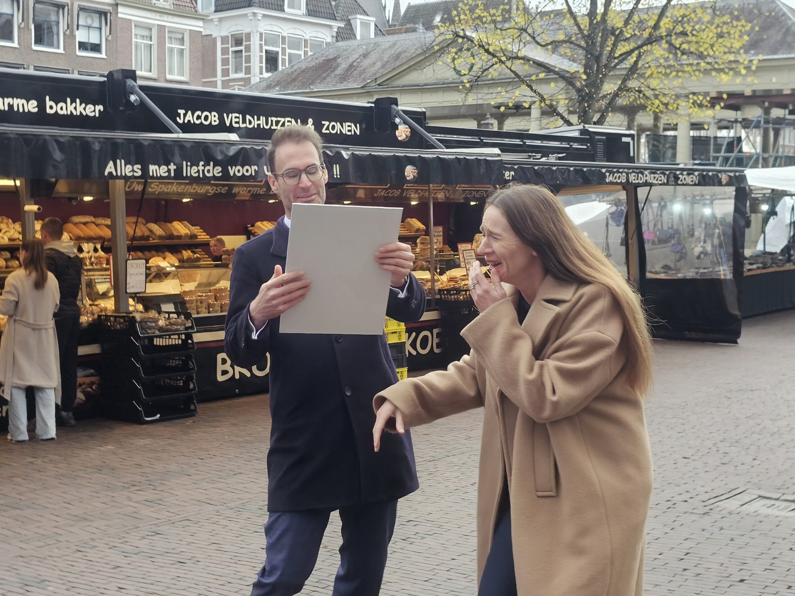 Bij hun rondje langs de marktkramen op de Aal-, Vis- en Botermarkt maken de stadsbestuurders met veel ondernemers een praatje. Ook hadden ze een presentje meegebracht om hun waardering te tonen voor de marktkooplui die de afgelopen maanden na jaren van strijd met de gemeente nu toch met een gezamenlijk plan zijn gekomen voor een nieuwe inrichting van het hele marktgebied.