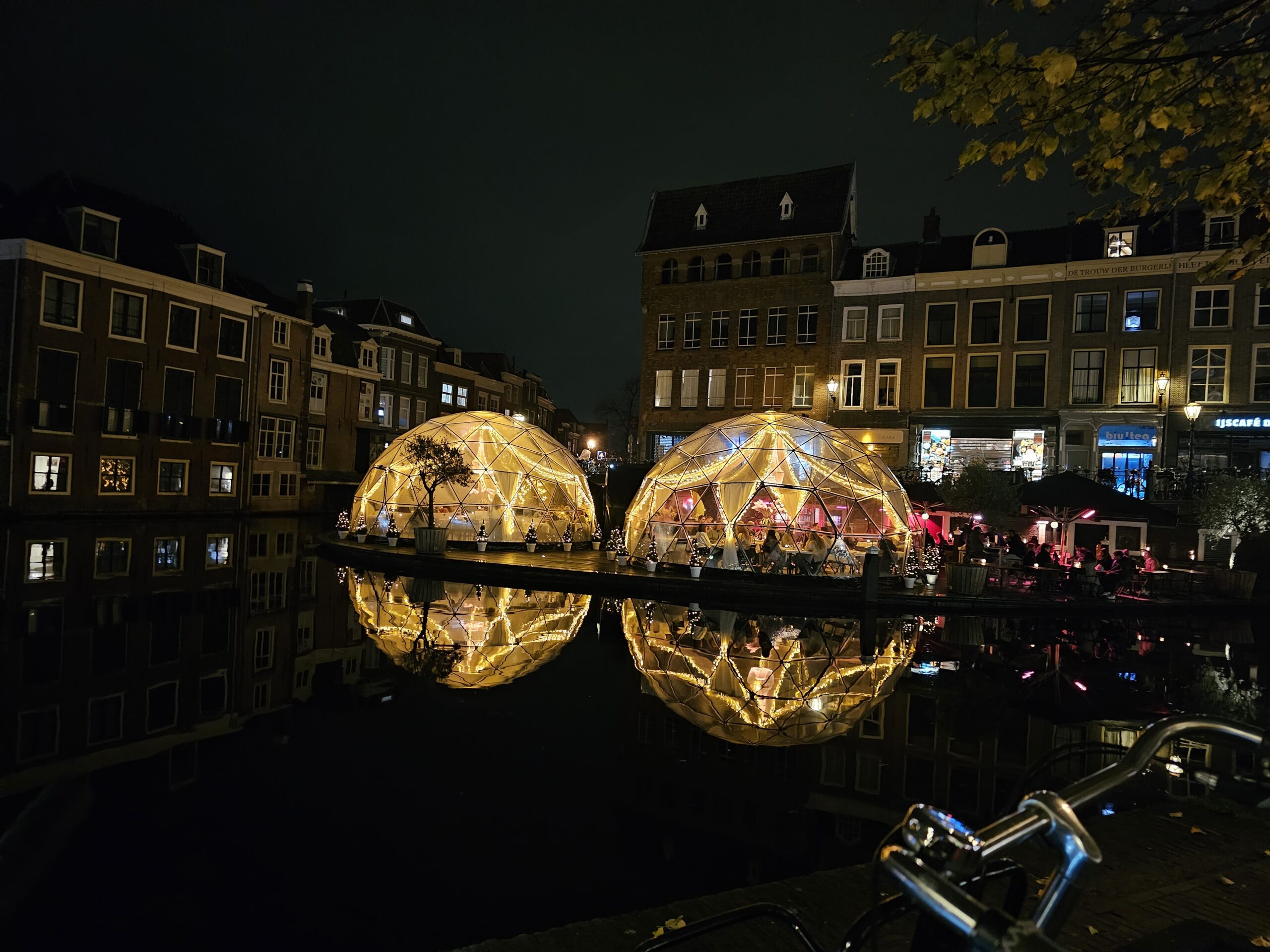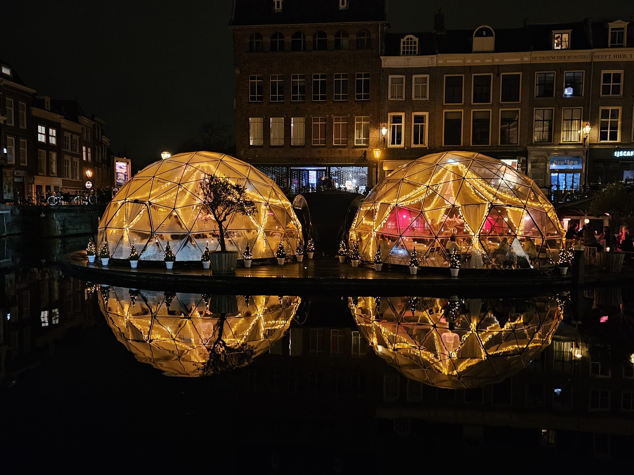 Zodra het duister invalt en de verlichting aangaat in de ‘domes’, zoals eigenaren Paul Herman en Martijn van der Laar de bollen noemen, straalt een een geliger gloed over het water waar de Rijnen samenstromen.
