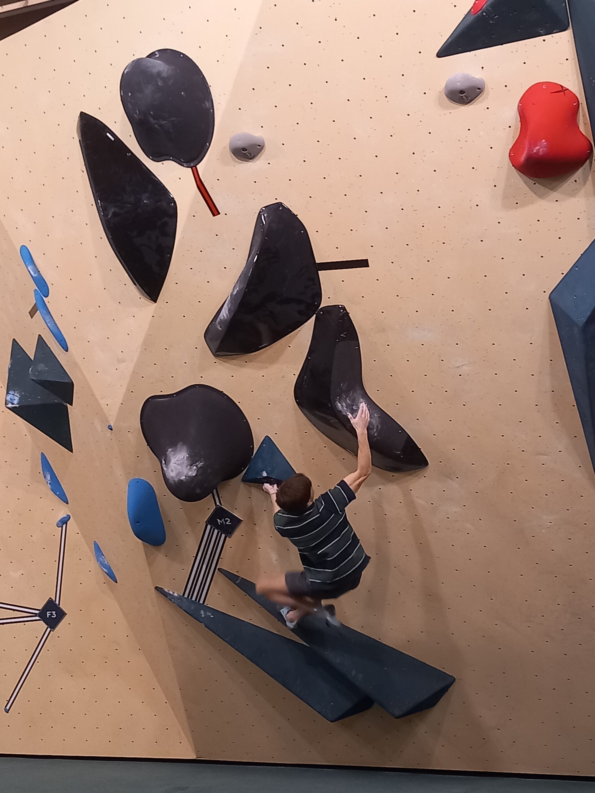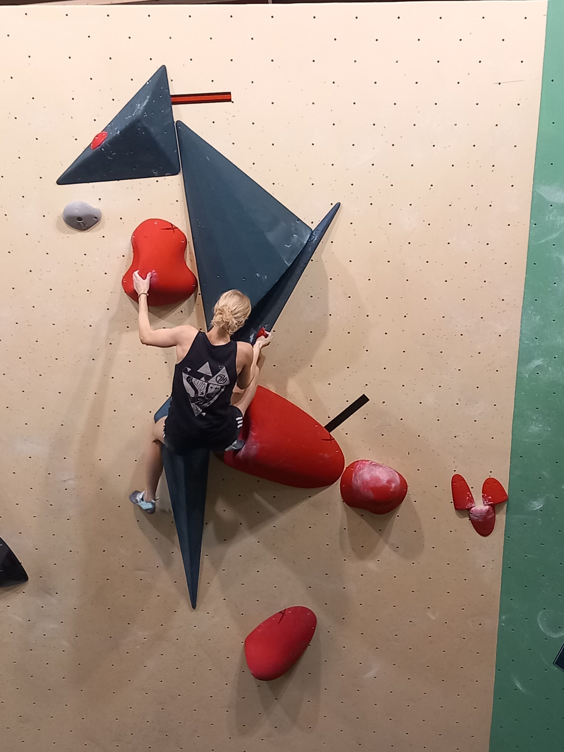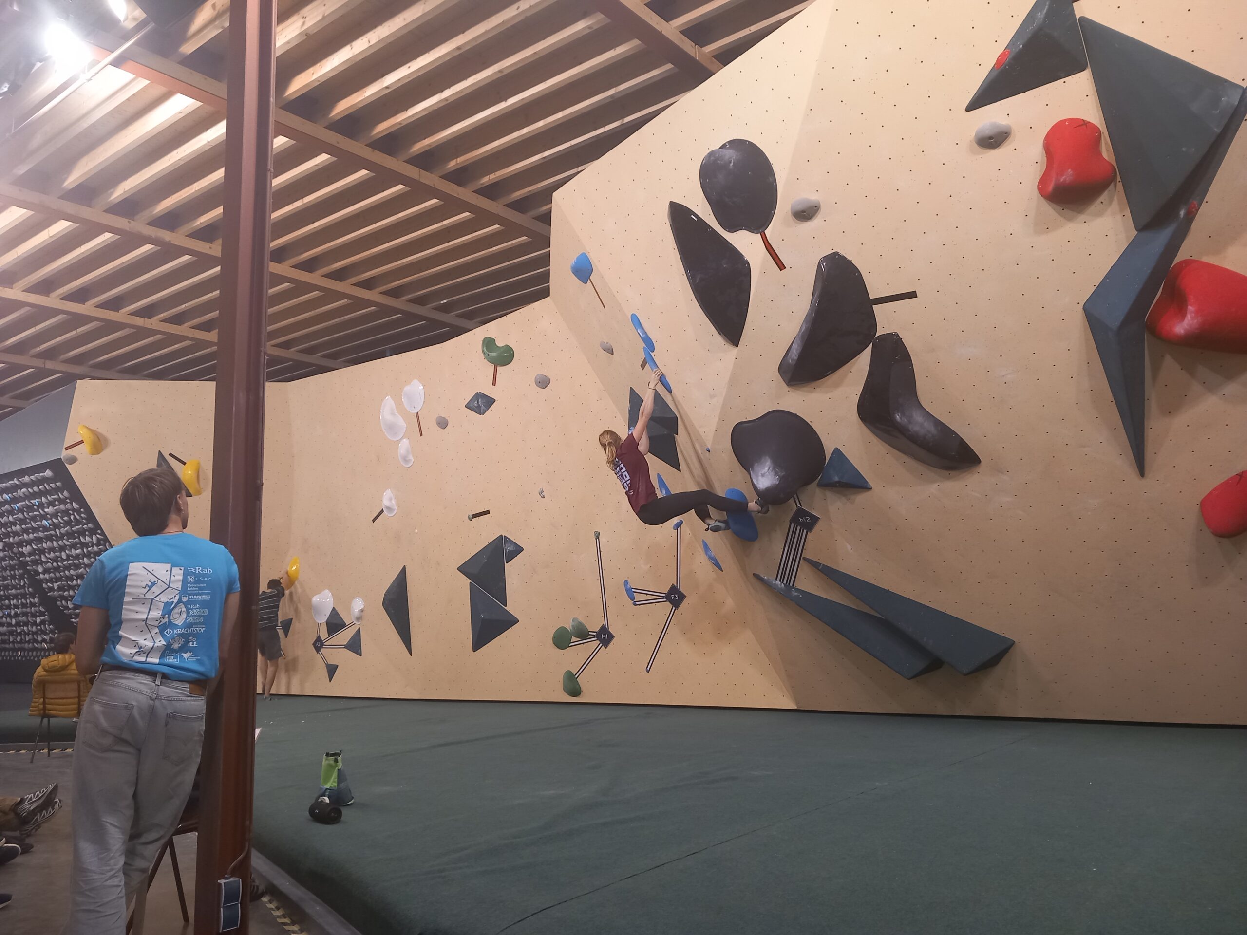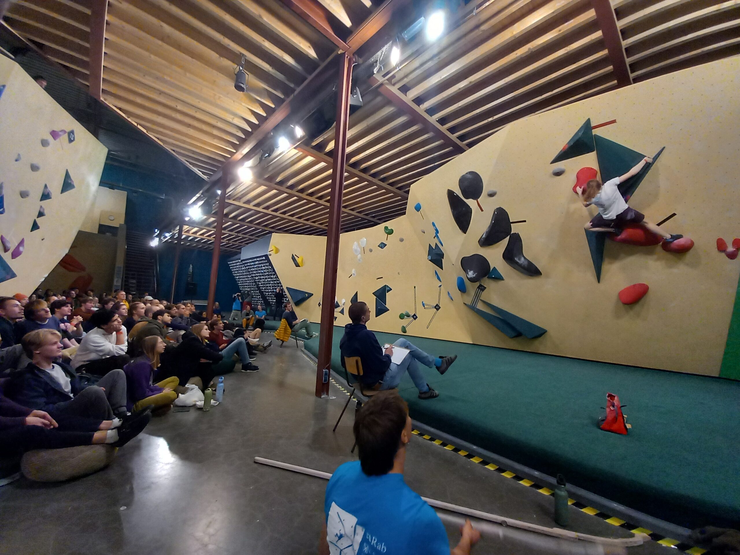 Een luid gejuich stijgt op toen student Mikola met twee handen het bovenste element van zijn route wist vast te pakken. Hij had zojuist één van de finaleroutes geflashed, oftewel in één keer gehaald. Iets later zijn termen als ‘Allez!’ en ‘kom op!’ uit verschillende hoeken van de zaal te horen als Milou opnieuw probeert die lastige transitie te maken van het ene naar het andere blok. Ze heeft in totaal drie minuten om de route met succes te beklimmen: hoe sneller, hoe beter. Ik ben bij de finale van het NSKB (Nationaal Studenten Kampioenschap Boulderen) en sta met open mond te kijken naar de acrobatiek en kracht van de klimmers, maar ook naar de massale support van het publiek.