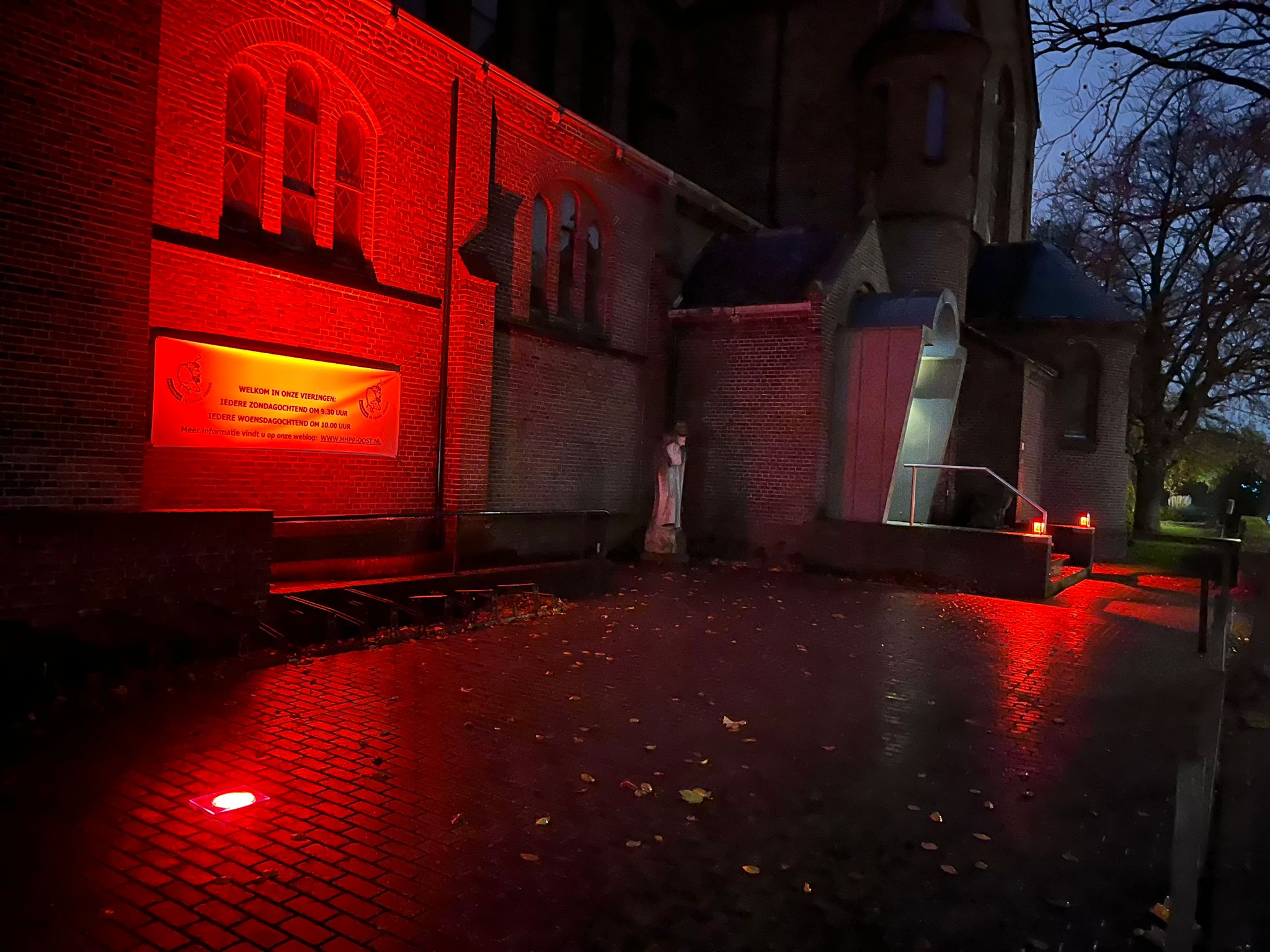 De Goede Herderkerk in Zoeterwoude-Rijndijk werd woensdagavond rood uitgelicht is verband met Red Wednesday, een internationale kerkelijke actie die elk jaar wordt gehouden.