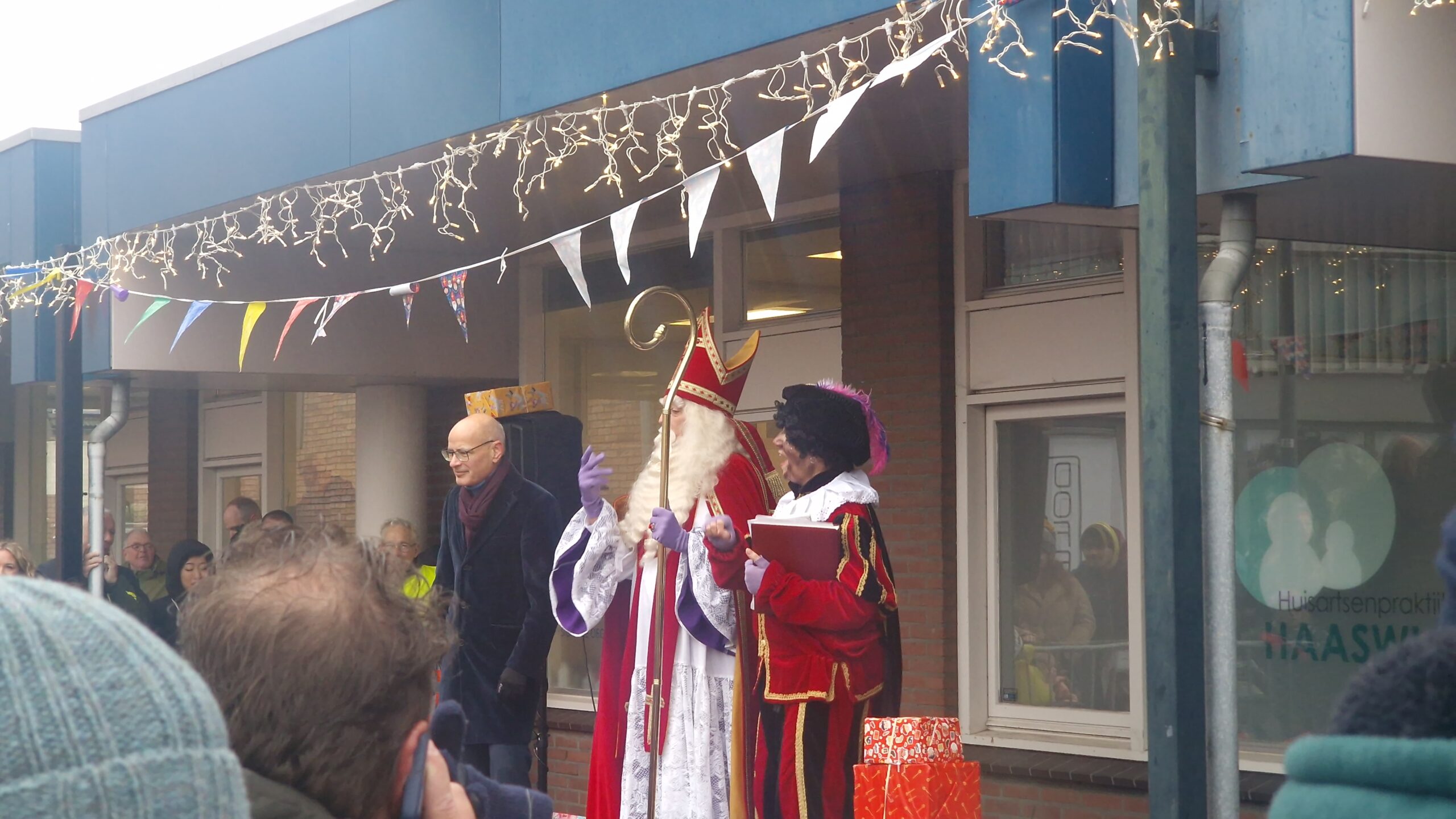 Zonder ambtsketting maar met een ferme handdruk werd de Sint dan toch welkom geheten. Met de ambtsketting kwam het weer goed. Die bleek namelijk gevonden door de Sint en zijn pieten en werd ingepakt en wel als cadeau overhandigd aan de burgemeester.