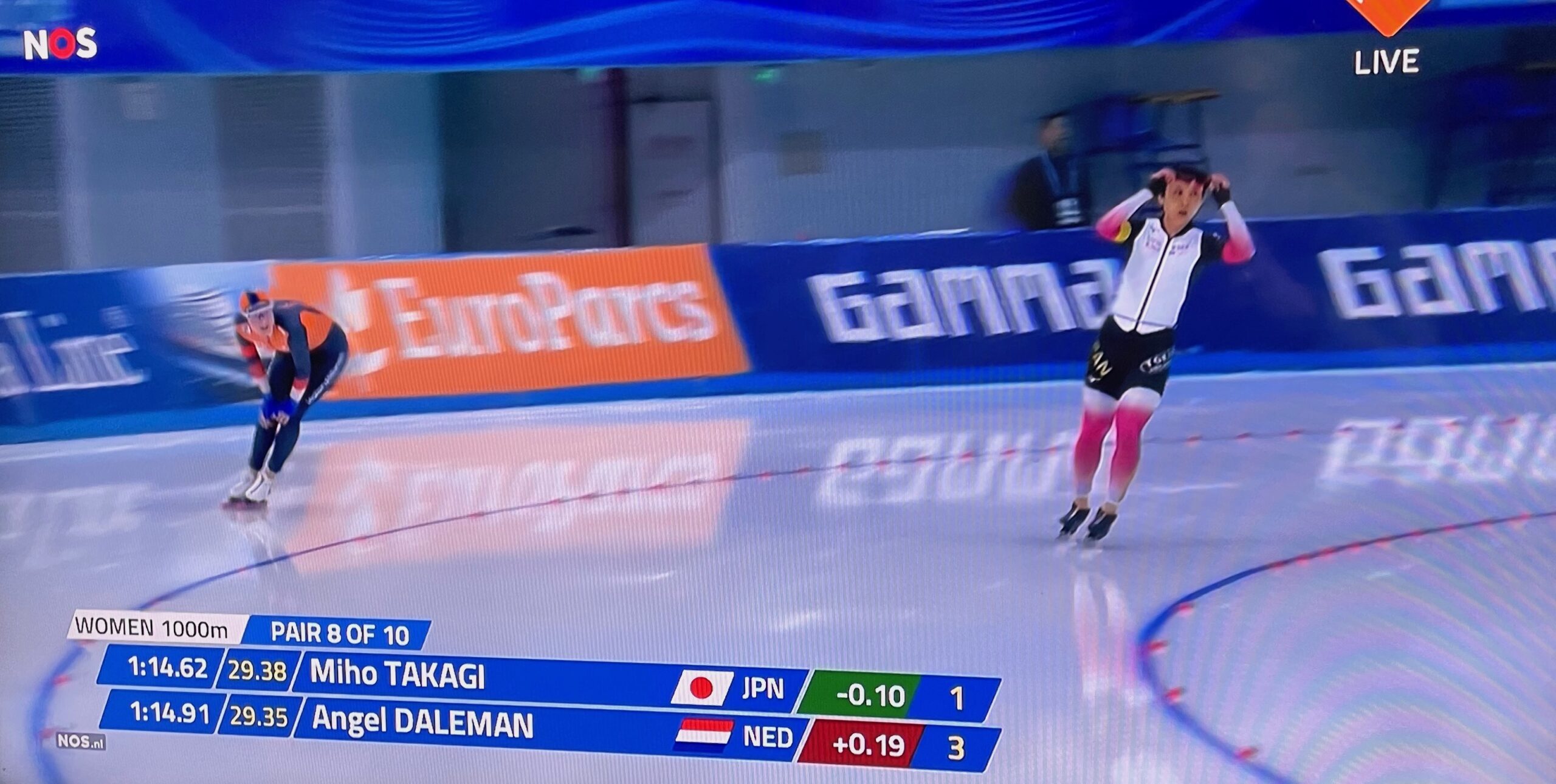 Na haar kwamen er nog een paar ritten, maar de tijden de tijden uit de rit Takagi en Daleman hielden stand. Takagi wint daarmee ook de 1.000 meter in Peking. En Angel Daleman pakt haar tweede bronzen medaille dit weekend bij de wereldbekerwedstrijd, dit keer achter Antoinette Rijpma-De Jong. In het klassement staat Daleman ook op de derde plaats met slechts een punt achter Jutta Leerdam die in Peking niet verder kwam dan een zesde plaats op de 1.000 meter.