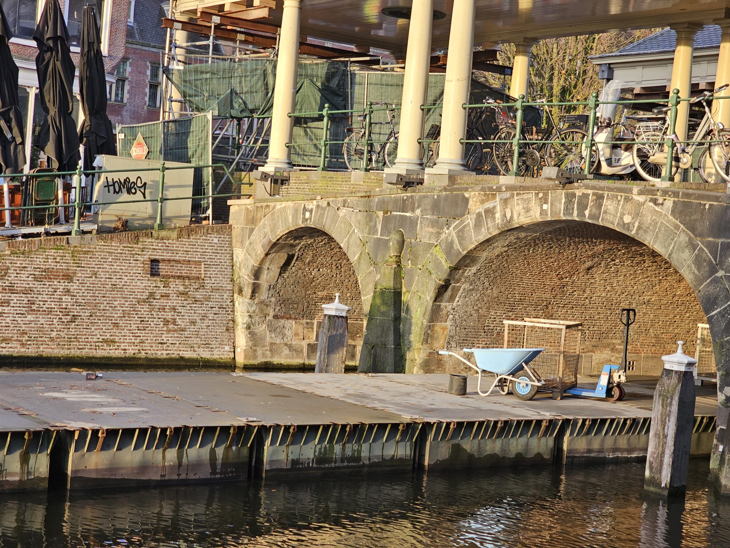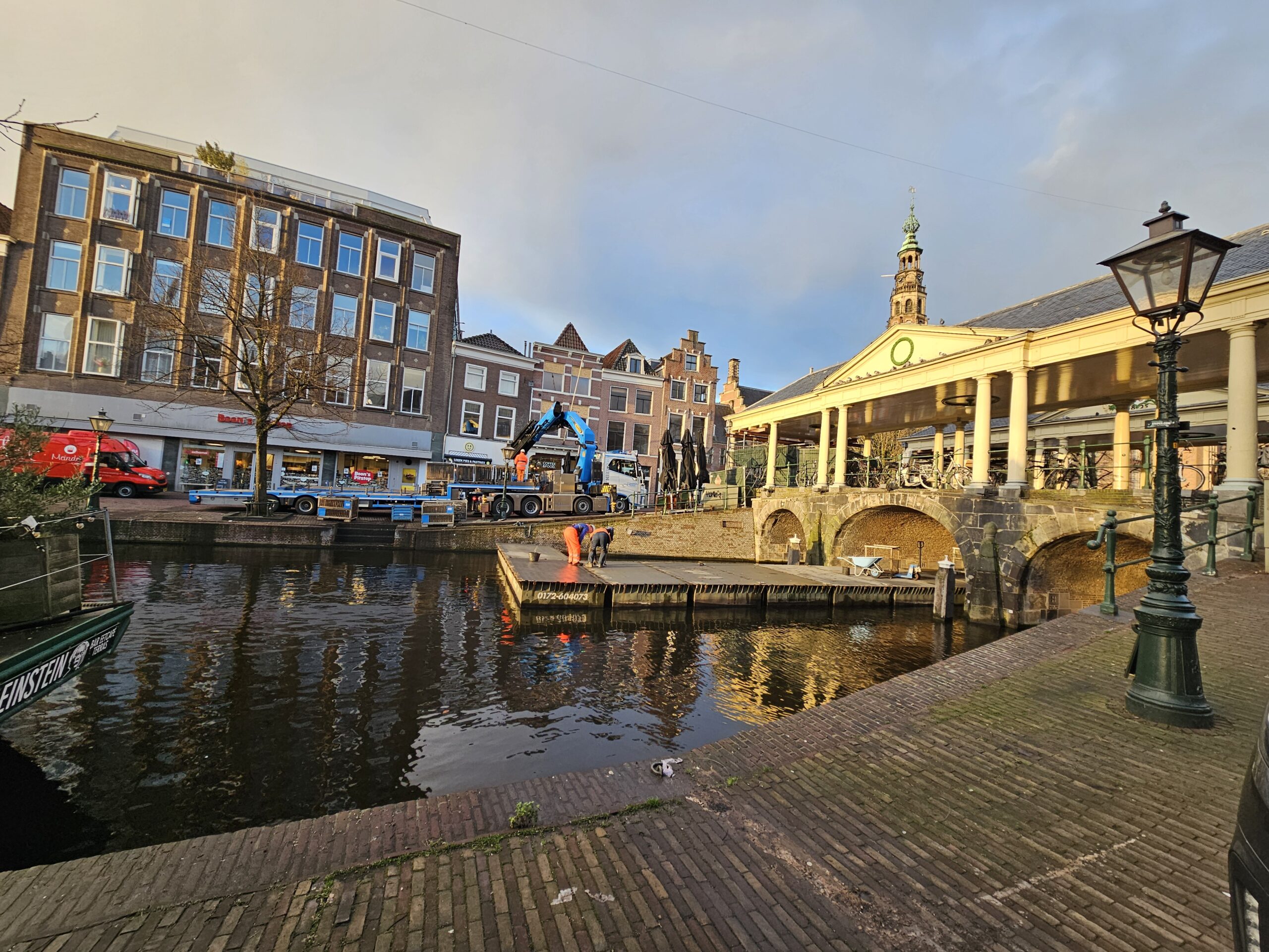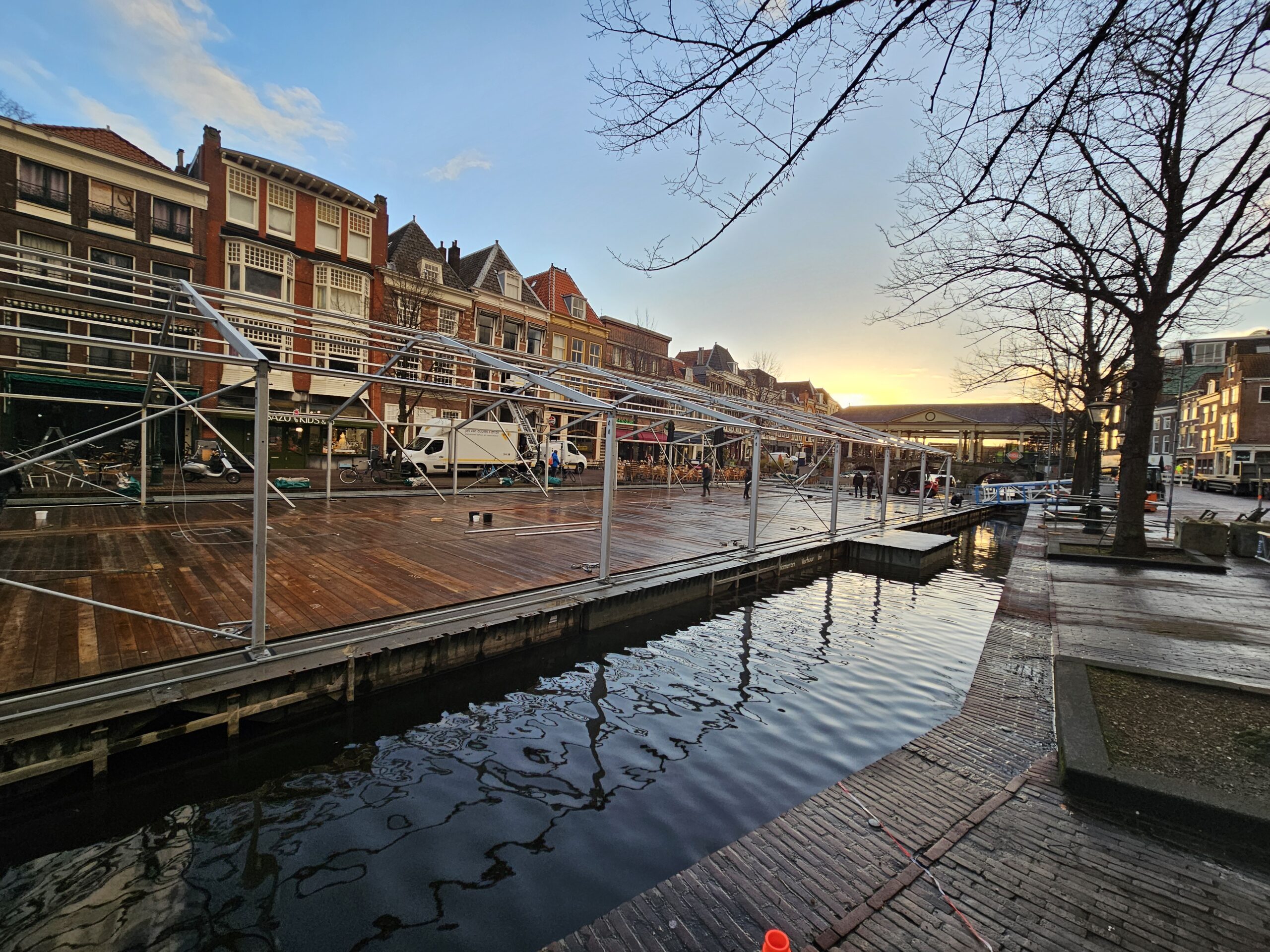 “Het is flink aanpakken”, vertelt Weijermars. “We hebben maar een paar dagen, en door de markt op woensdag kunnen we materialen die dag niet laten aanleveren.” Daarom liggen alle pontons dinsdag aan het begin van de middag al op hun plek. Ook de overkapping is daarom al geplaatst.