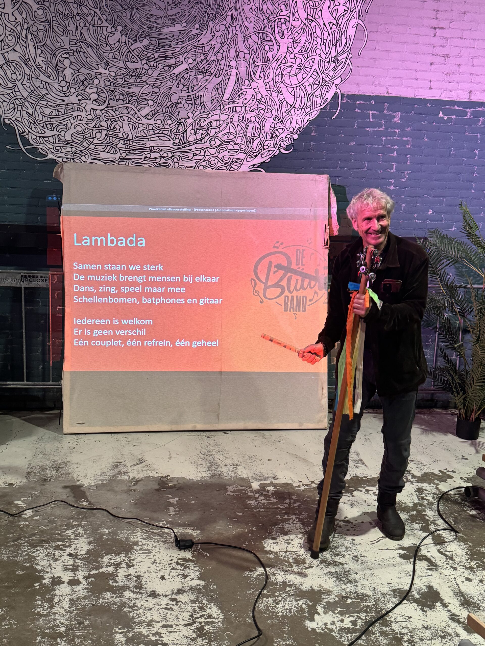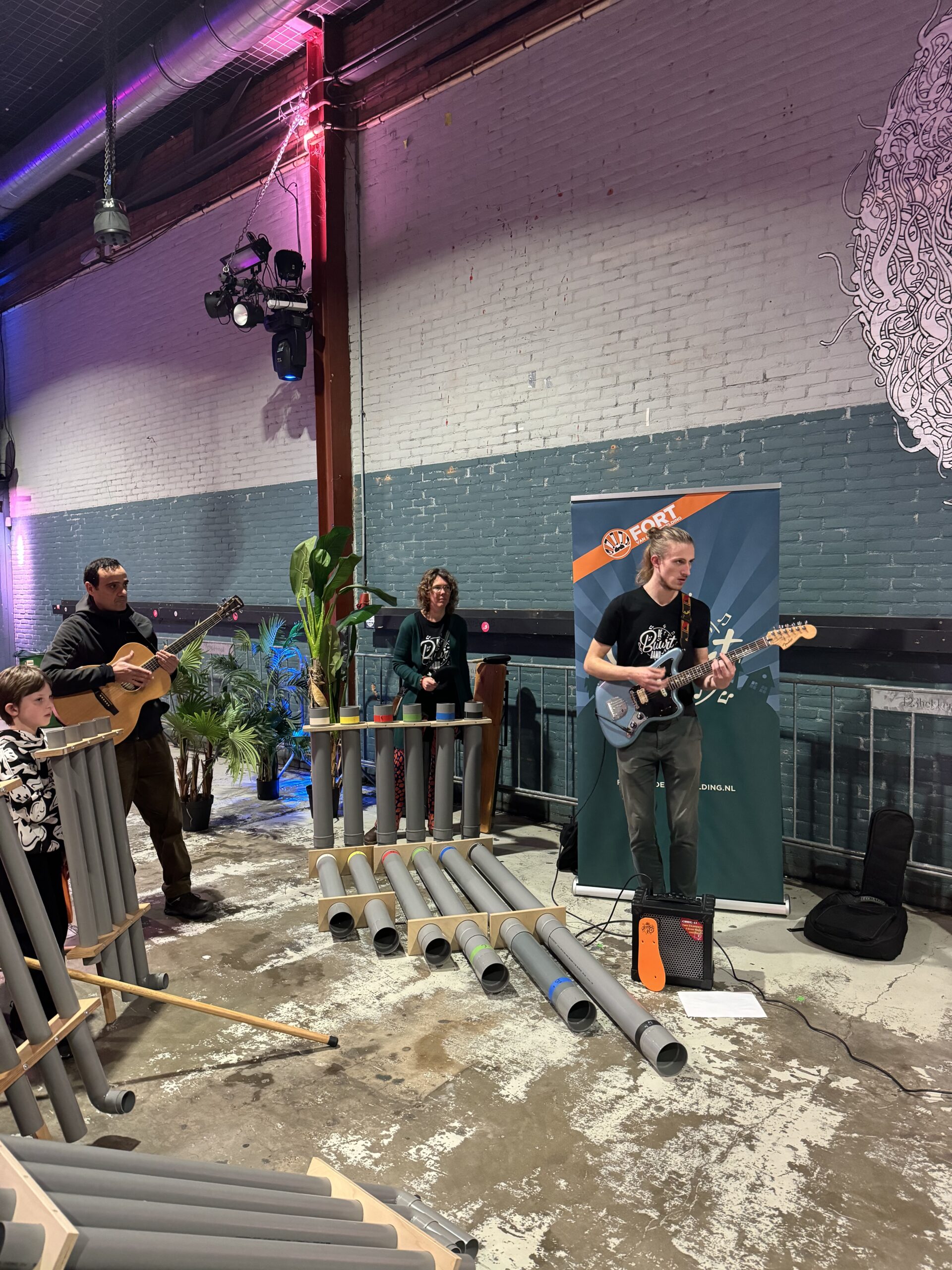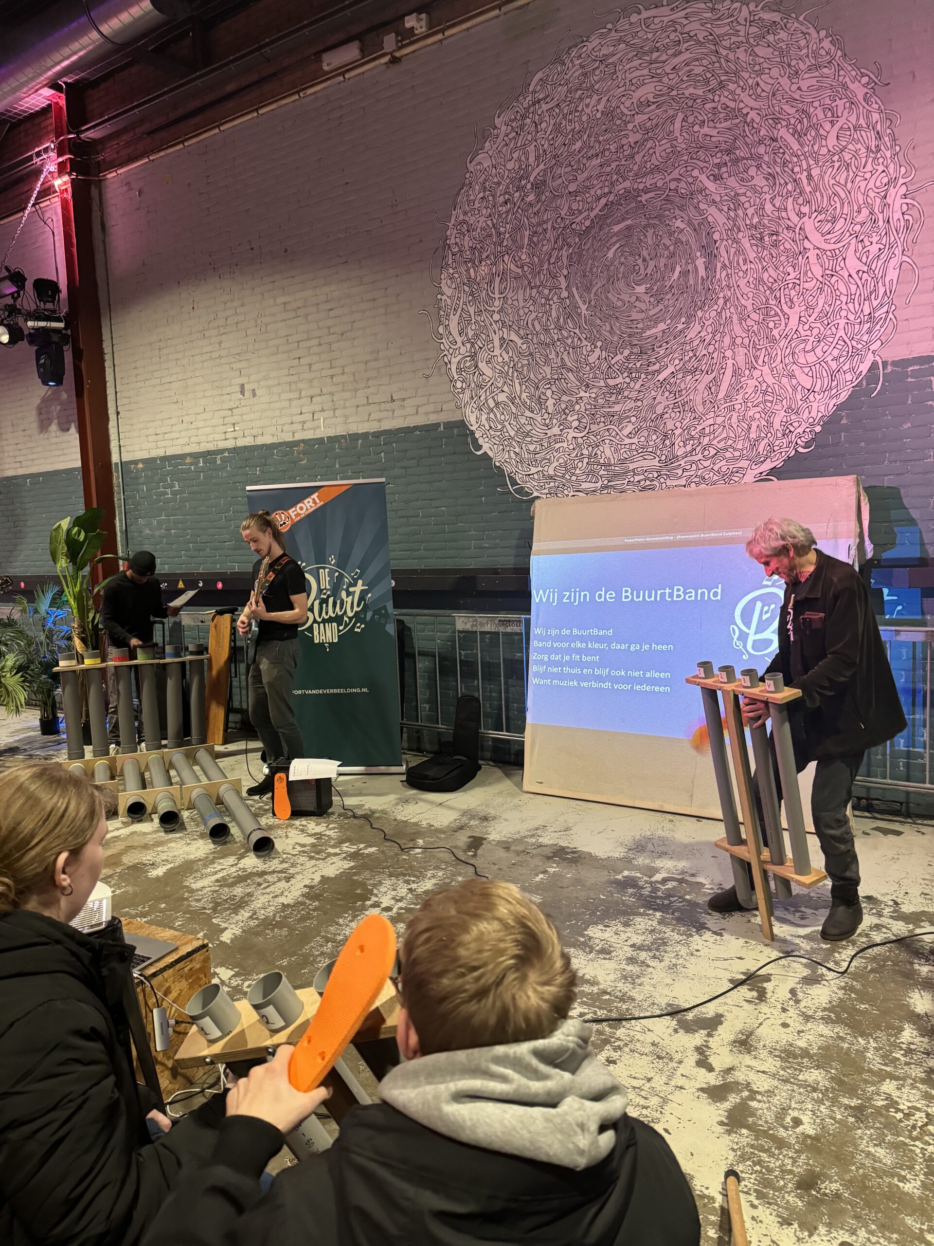 Bij binnenkomst werden de bezoekers hartelijk ontvangen door Jiske van Loon van BplusC en Peter de Boer van Fort van de Verbeelding. Na een korte uitleg startte De Boer, tevens bandleider, met het zelfontworpen instrument: de schellenbomen. Al snel ontstond er een vrolijk en gezellig orkest.