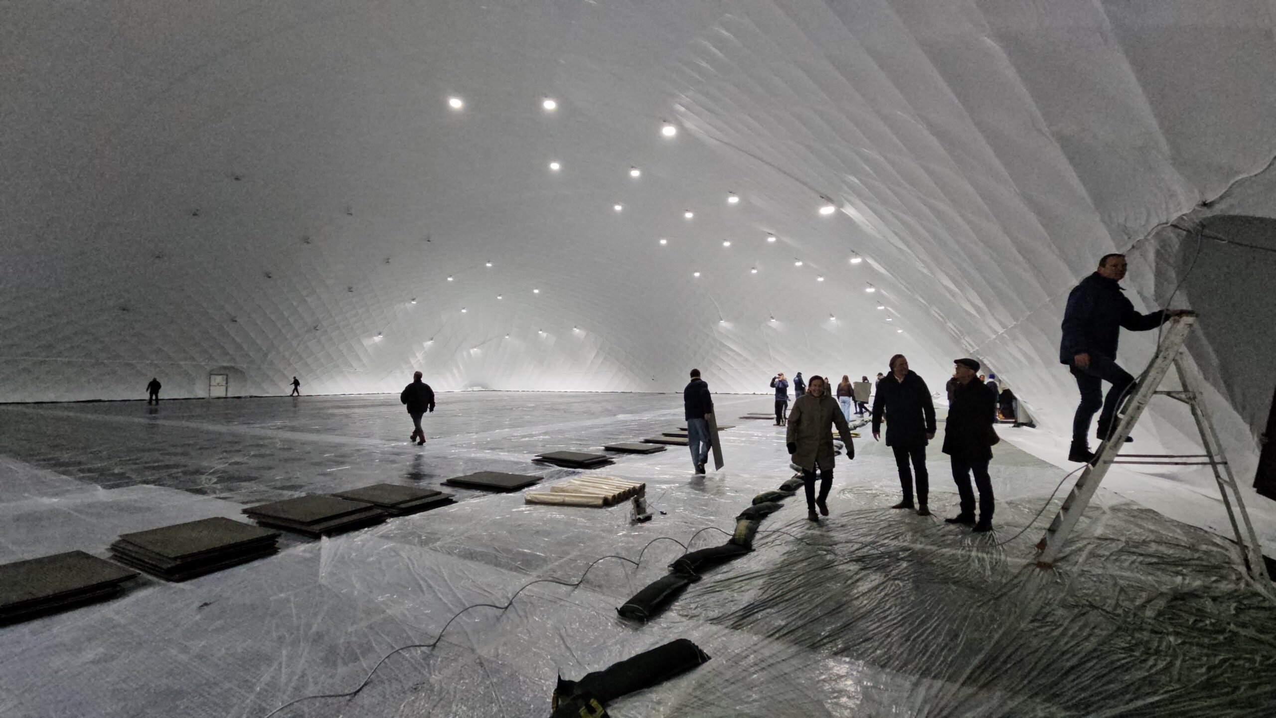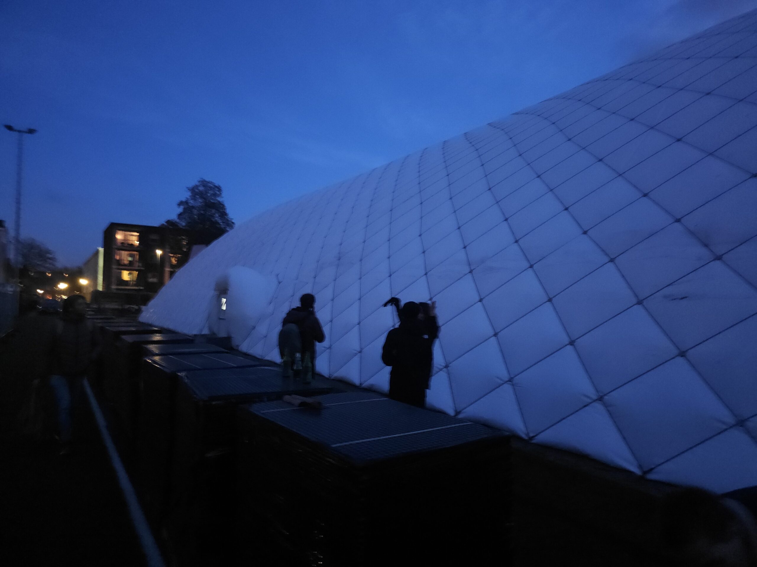 De afgelopen weken werd de plaatsing van de hal voorbereid en woensdag was het dan zover. ’s Ochtends vroeg verzamelden zo’n zestig à zeventig Roomburg-leden op de plek waar de hal moest verrijzen om te helpen bij het opzetten ervan. Aan het einde van de middag was de klus geklaard. De veertien meter hoge hal stond op z’n plek.