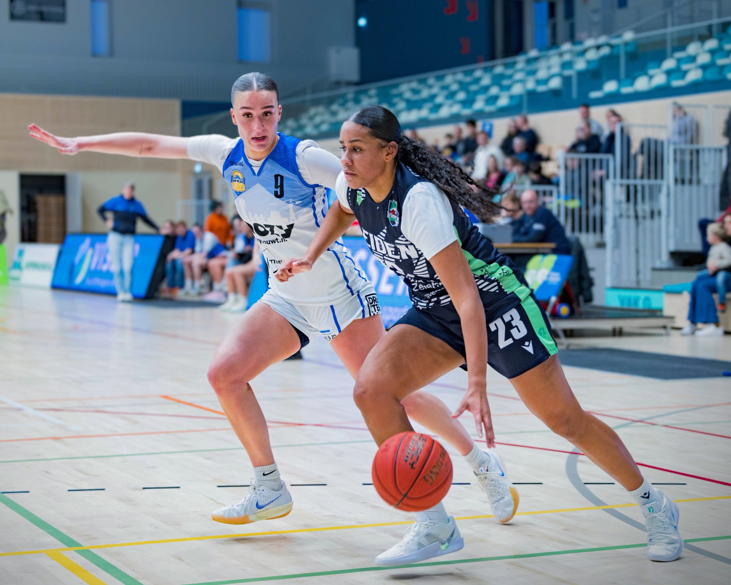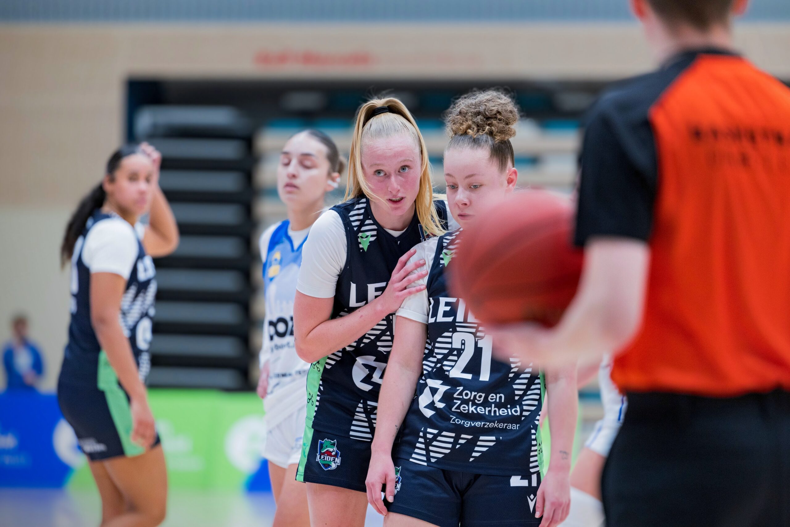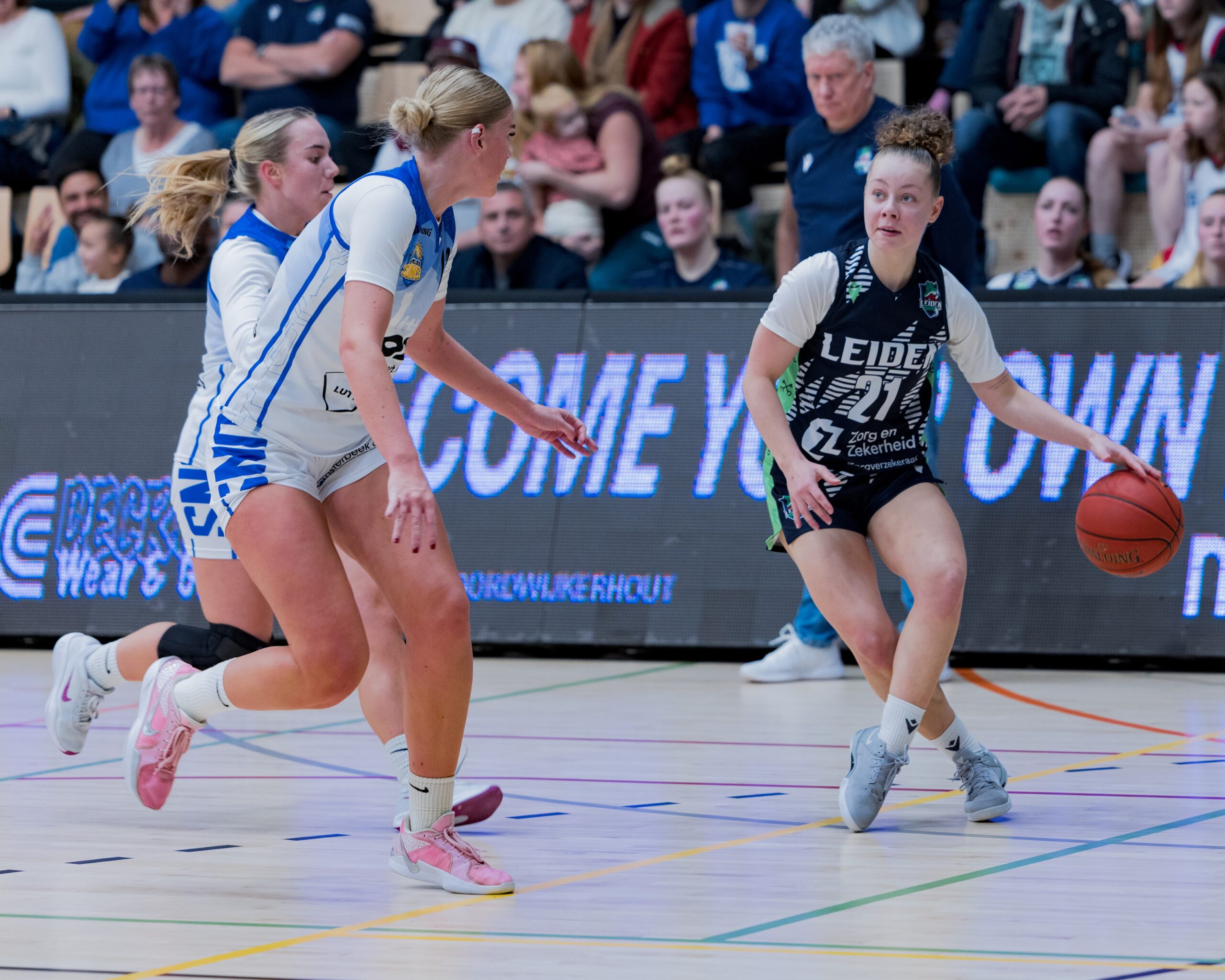 Het werd in Sportcomplex 1574 nog heel spannend aan het eind van het vierde kwart. Dankzij een driepunter van Marcelle Noordanus in de laatste minuut kwam Leiden op een voorsprong van twee punten, 58-56. Lotte Toornstra van de ploeg uit de kop van Noord-Holland kreeg vervolgens nog twee vrije worpen, maar wist er geen verlenging uit te slepen. Toornstra miste haar tweede vrije worp.