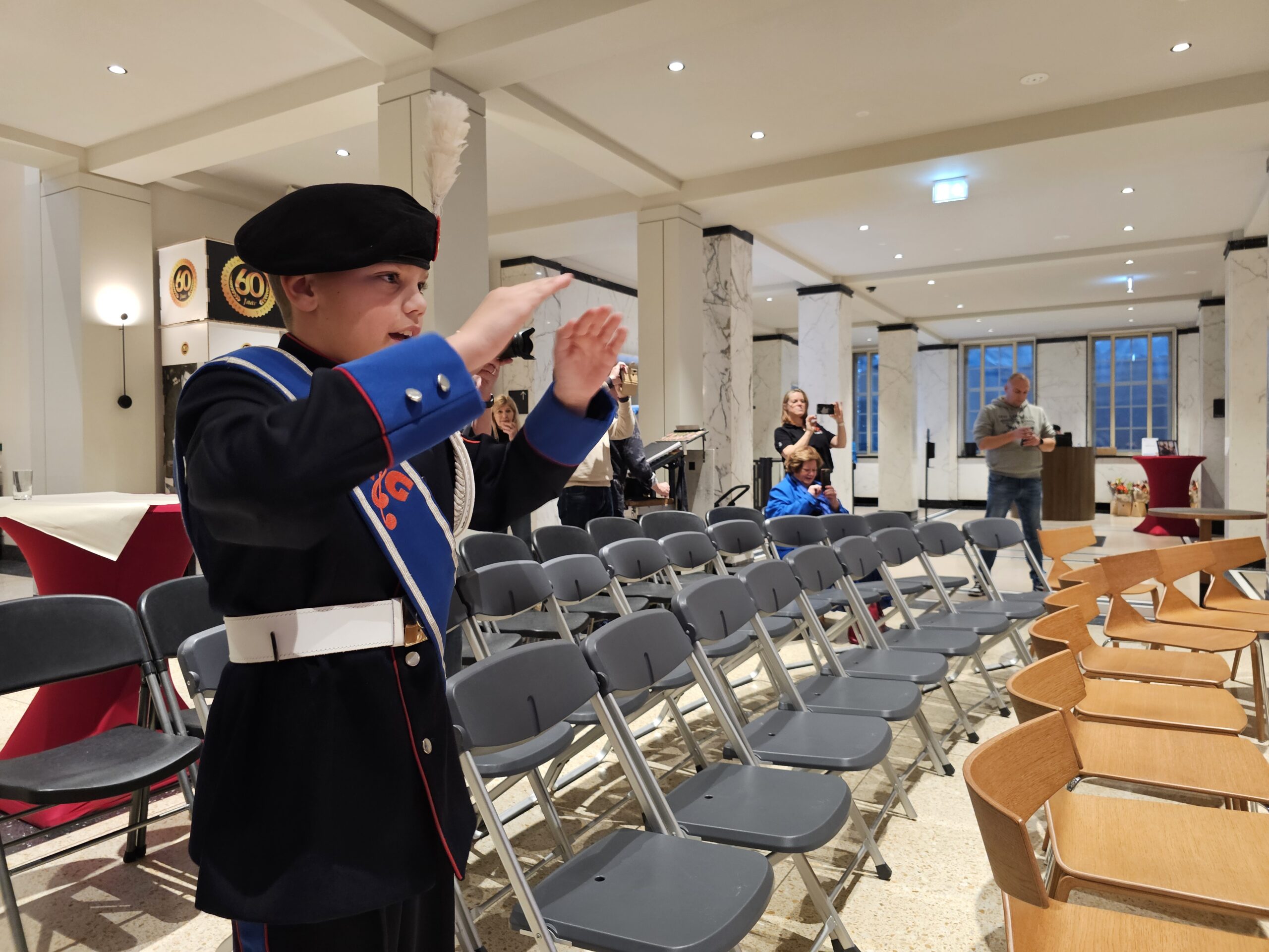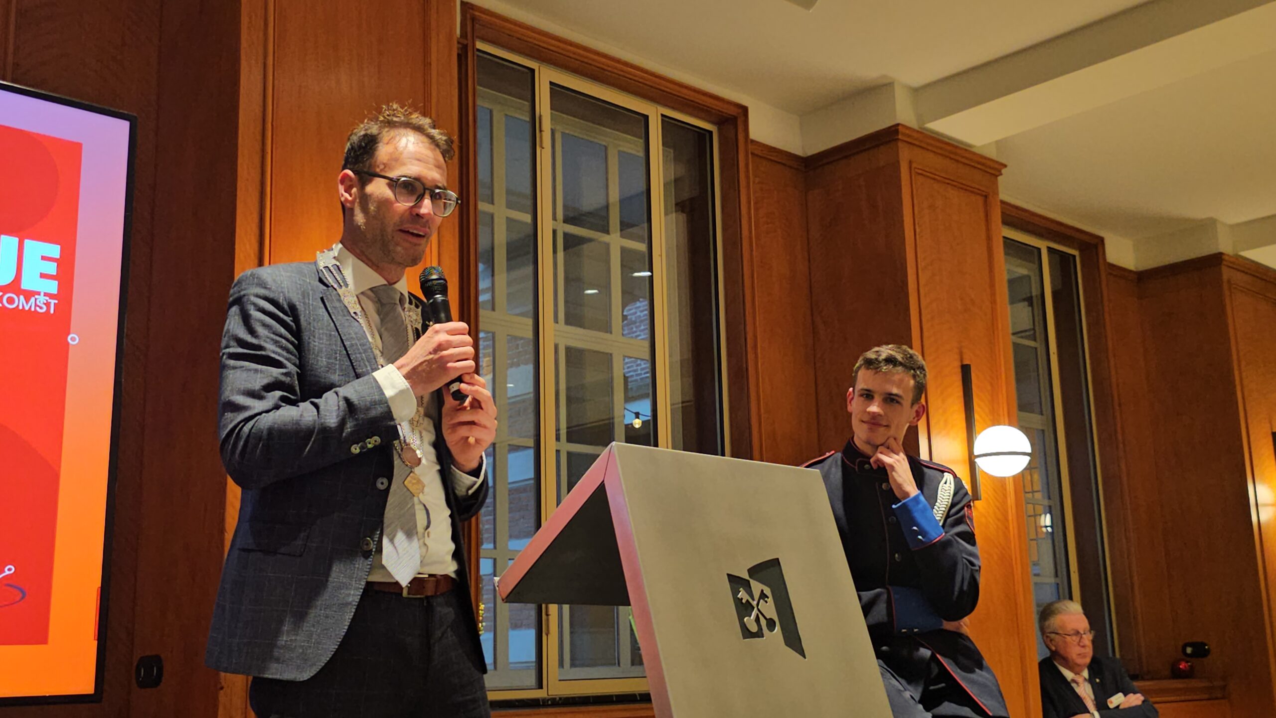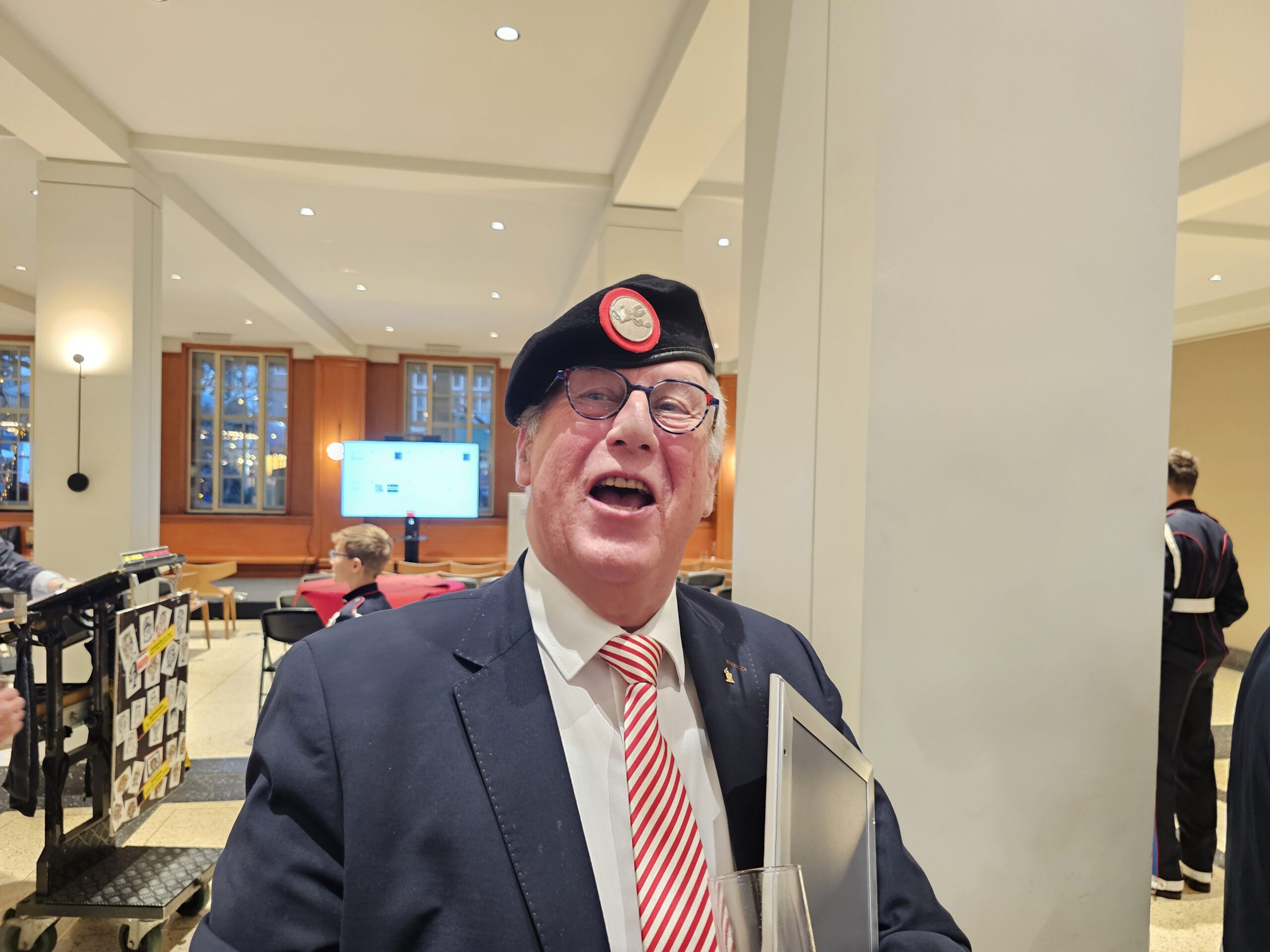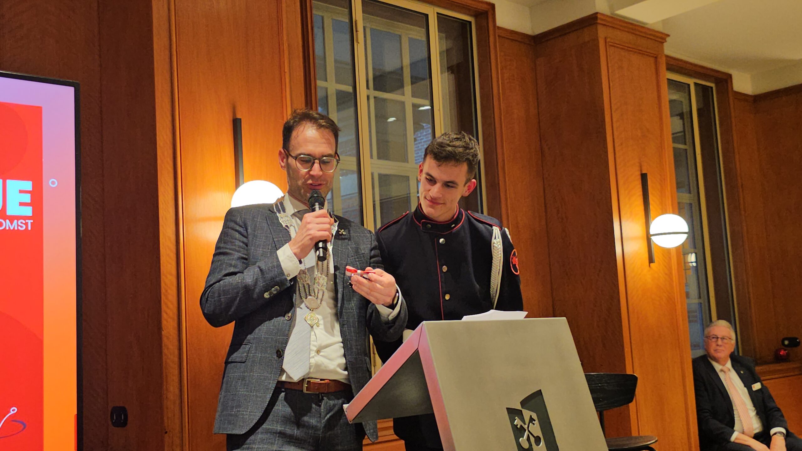 Toen was het tijd om het lintje op te spelden. “Mag dat wel in het uniform”, vroeg Leckie richting de K&G-leiding in de zaal? Het mocht en dus sierde even later het rood-witte lintje zijn borst.