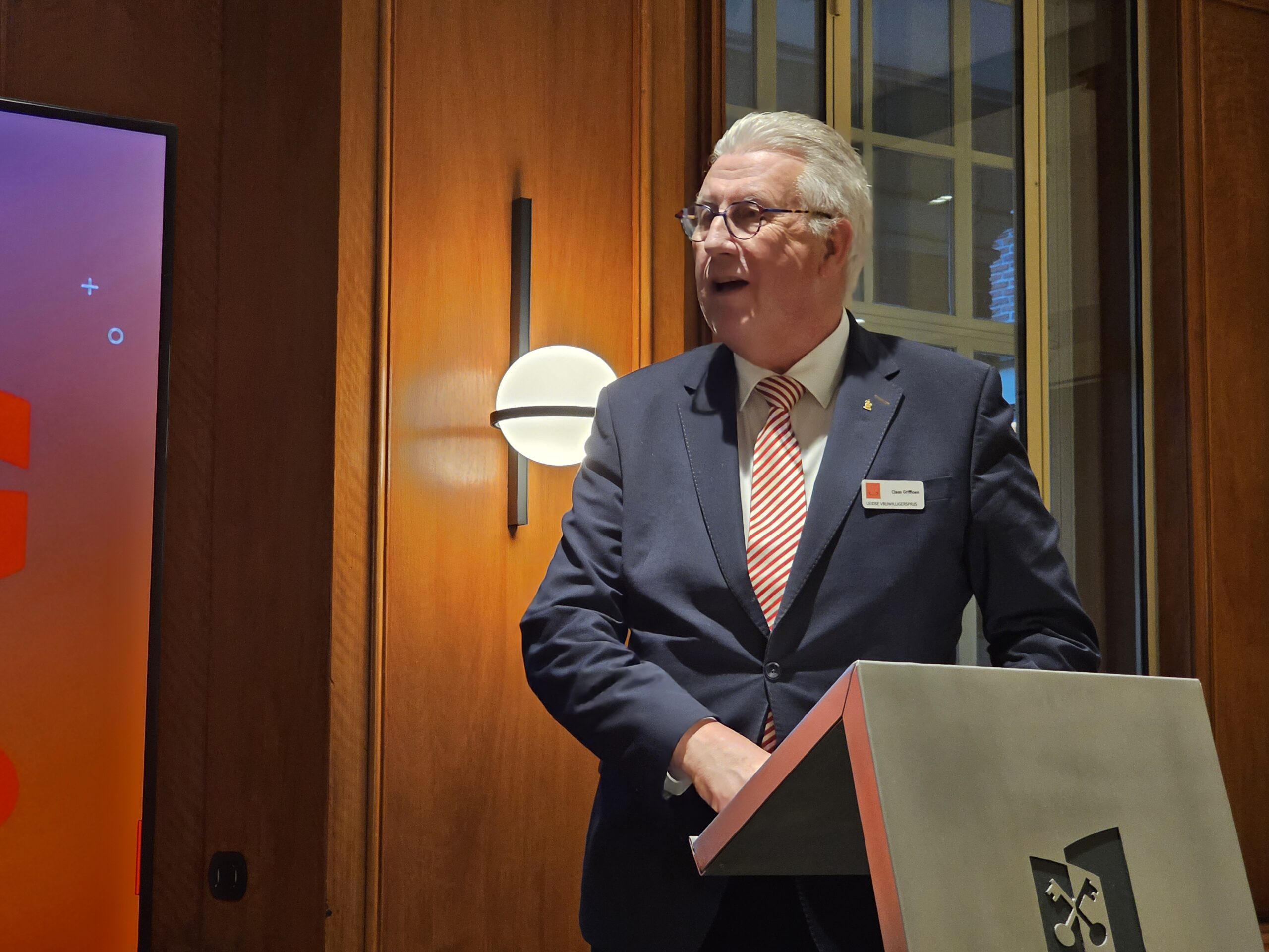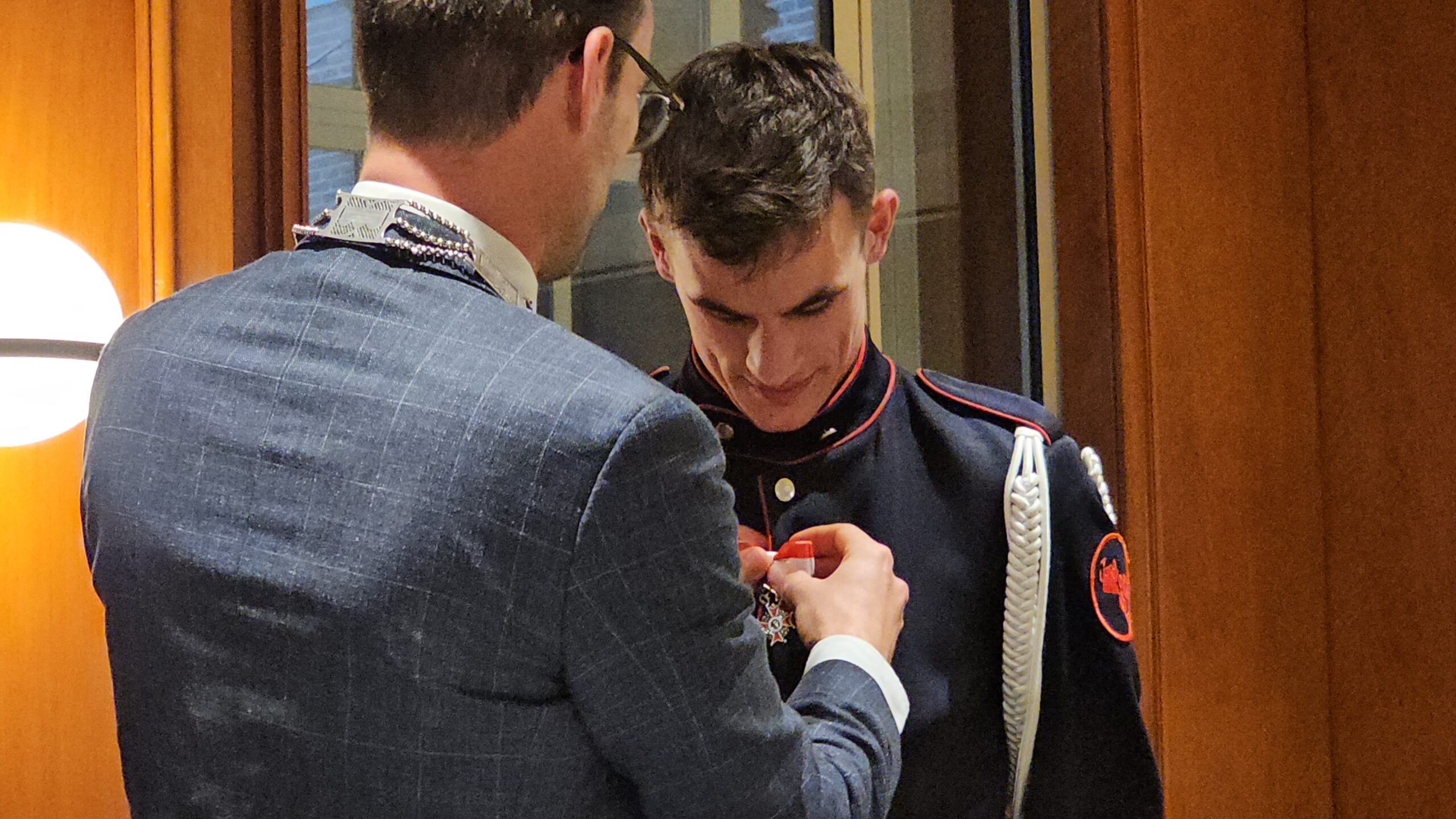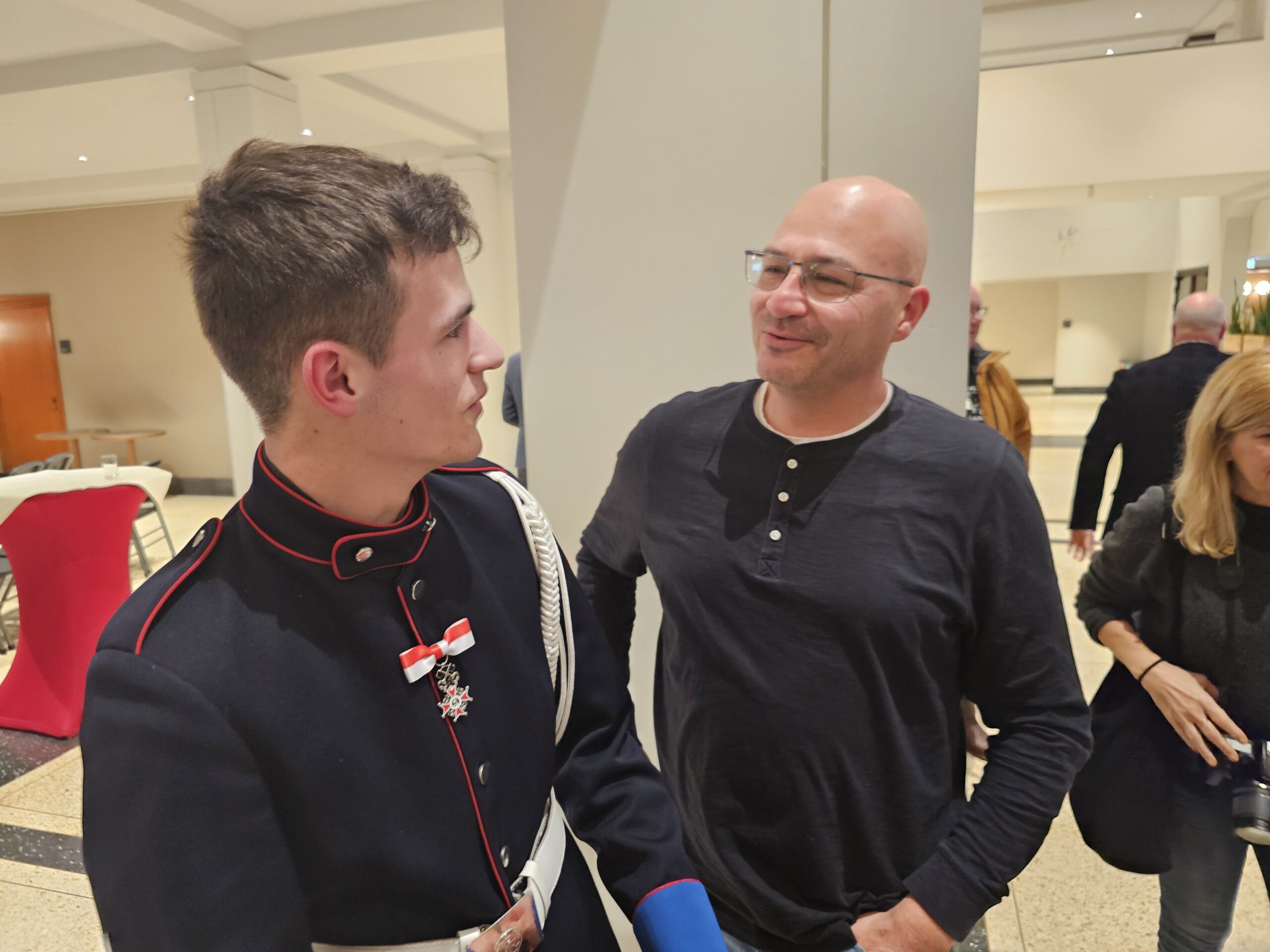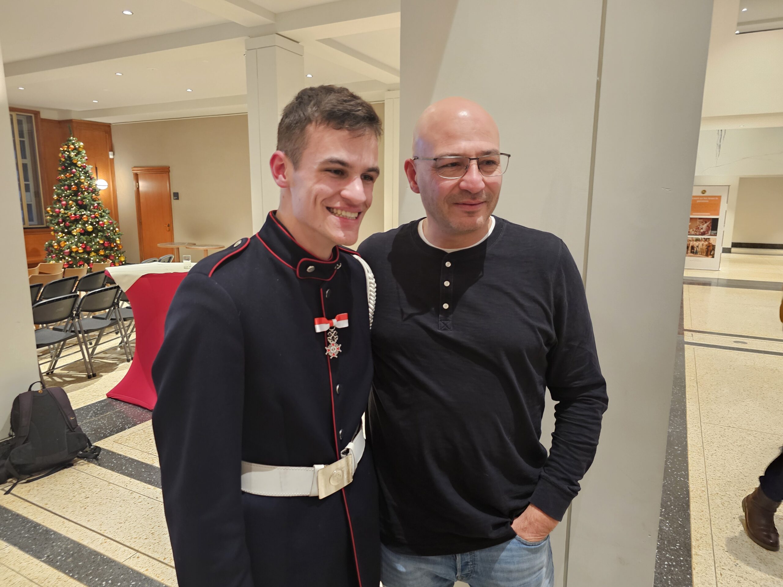 Toen was het tijd om het lintje op te spelden. “Mag dat wel in het uniform”, vroeg Leckie richting de K&G-leiding in de zaal? Het mocht en dus sierde even later het rood-witte lintje zijn borst.