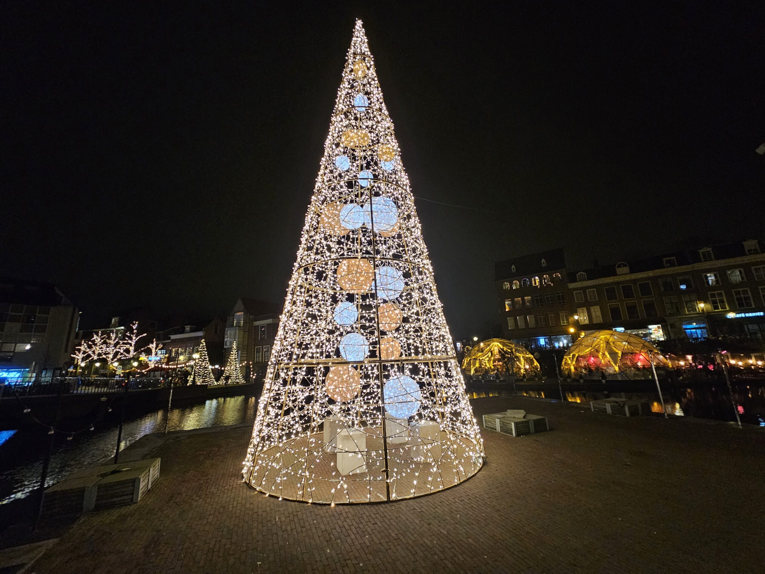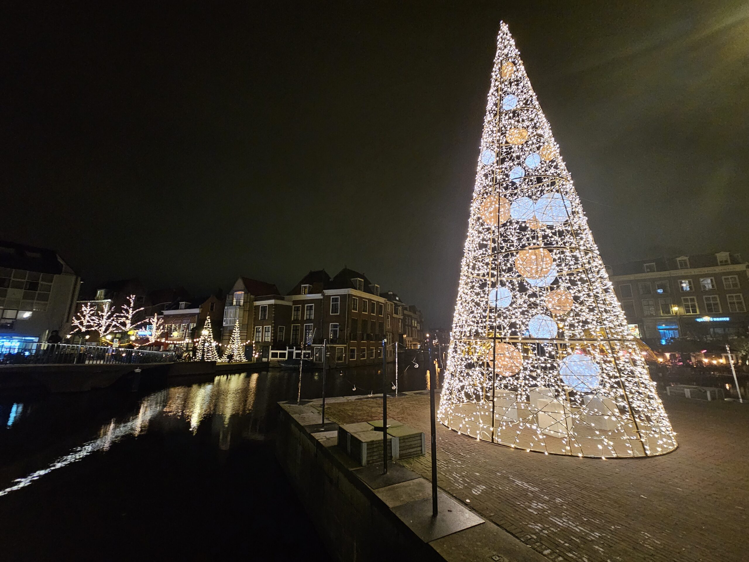 De led-boom vormt in het donker een stralend middelpunt in het centrum van Leiden.