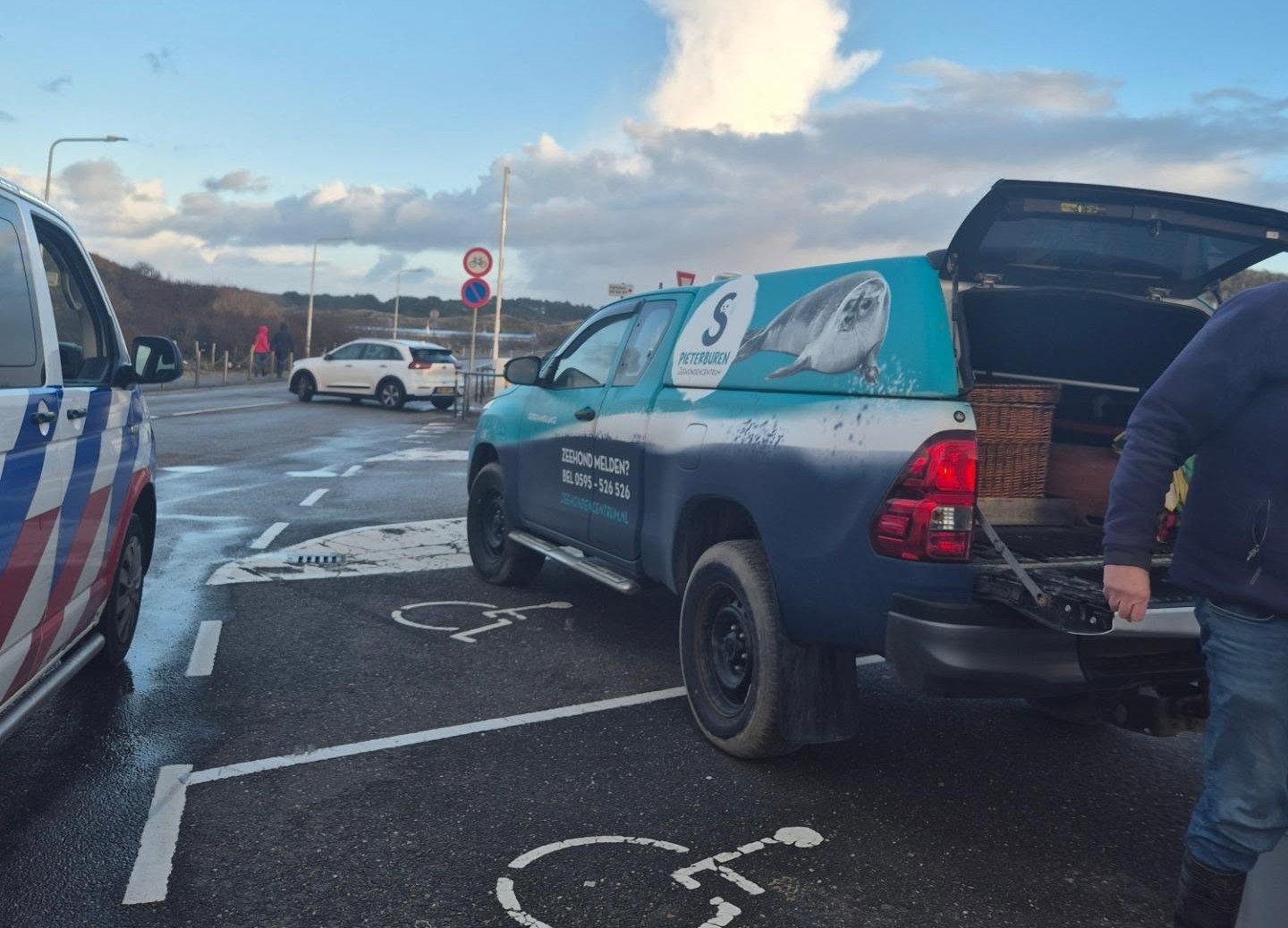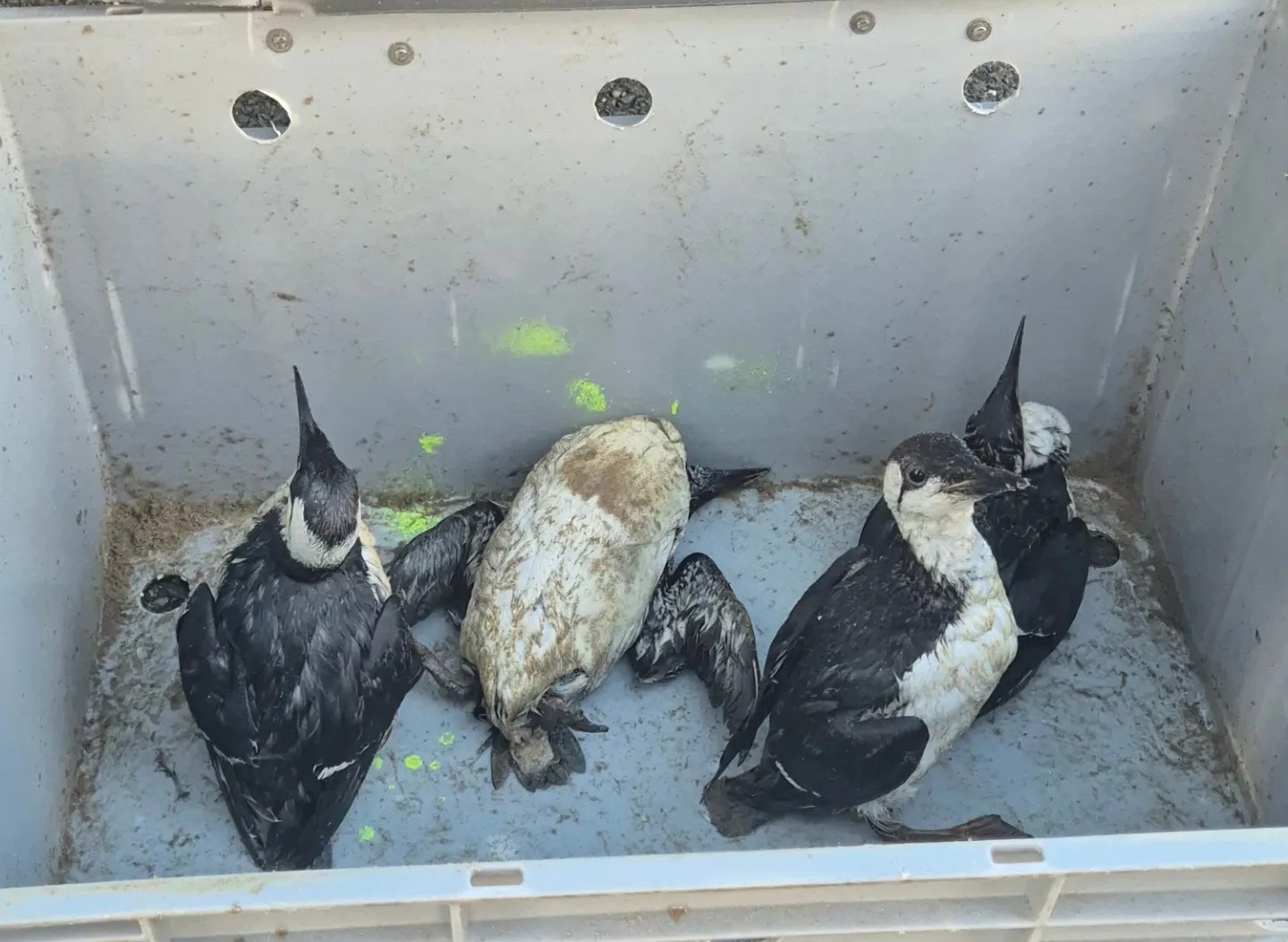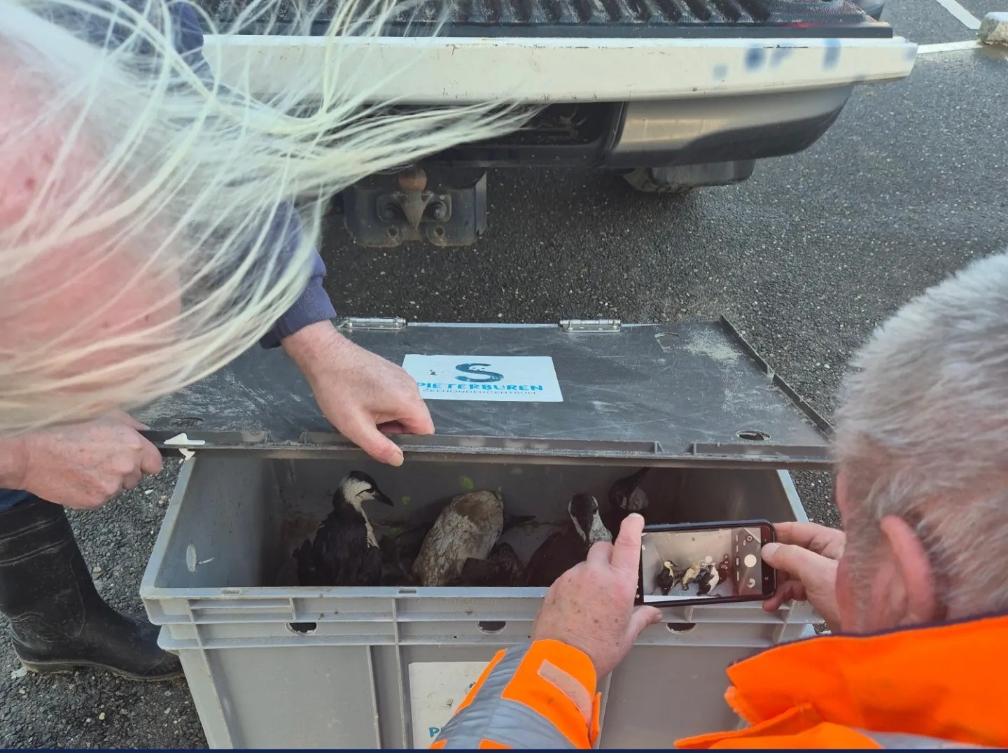 Medewerkers van Zeehondencentrum Pieterburen hebben op de Wassenaarse Slag een aantal zeekoeten opgehaald. De diertjes zaten onder de paraffine en zijn overgedragen aan de dierenambulance.
