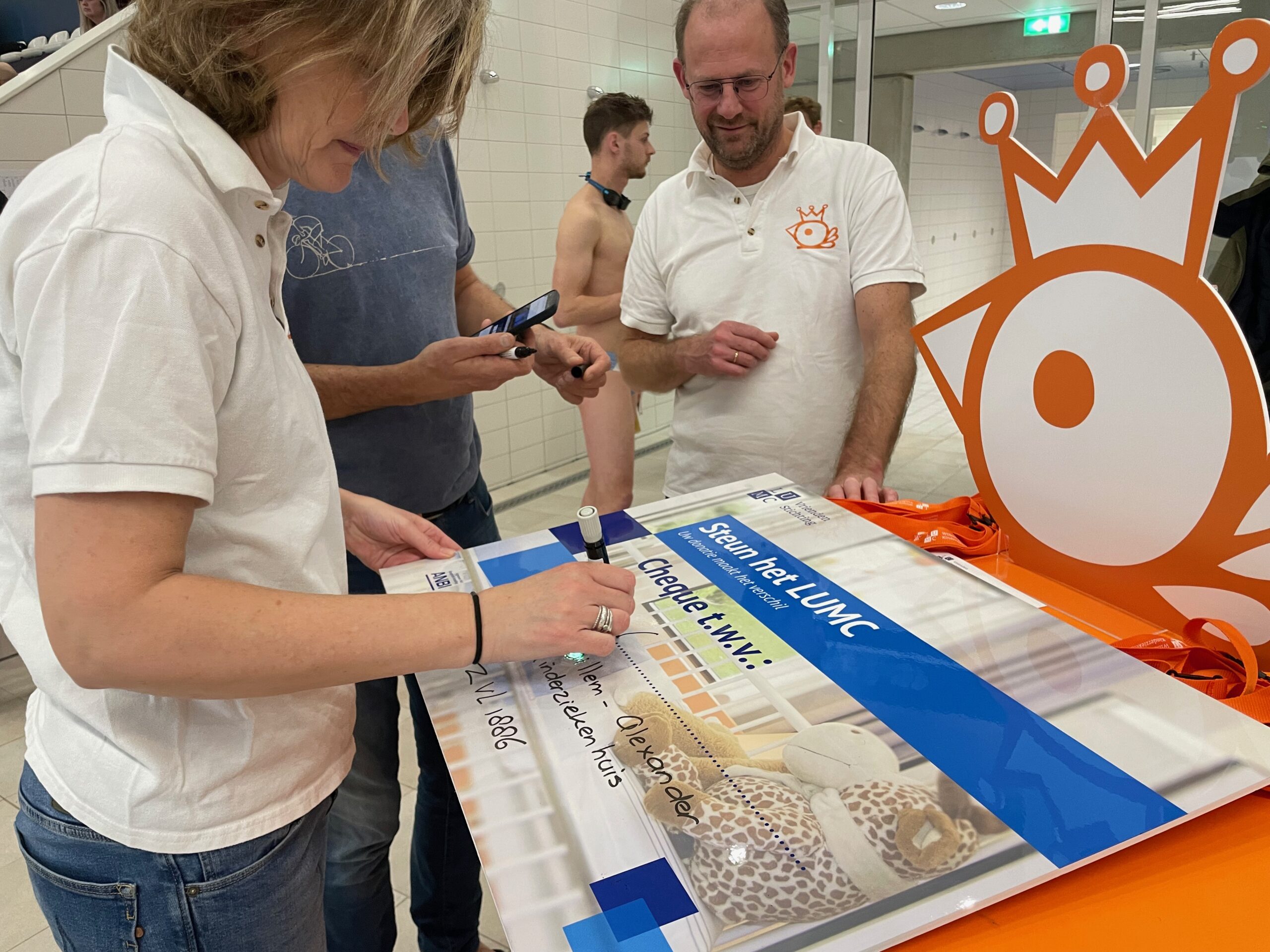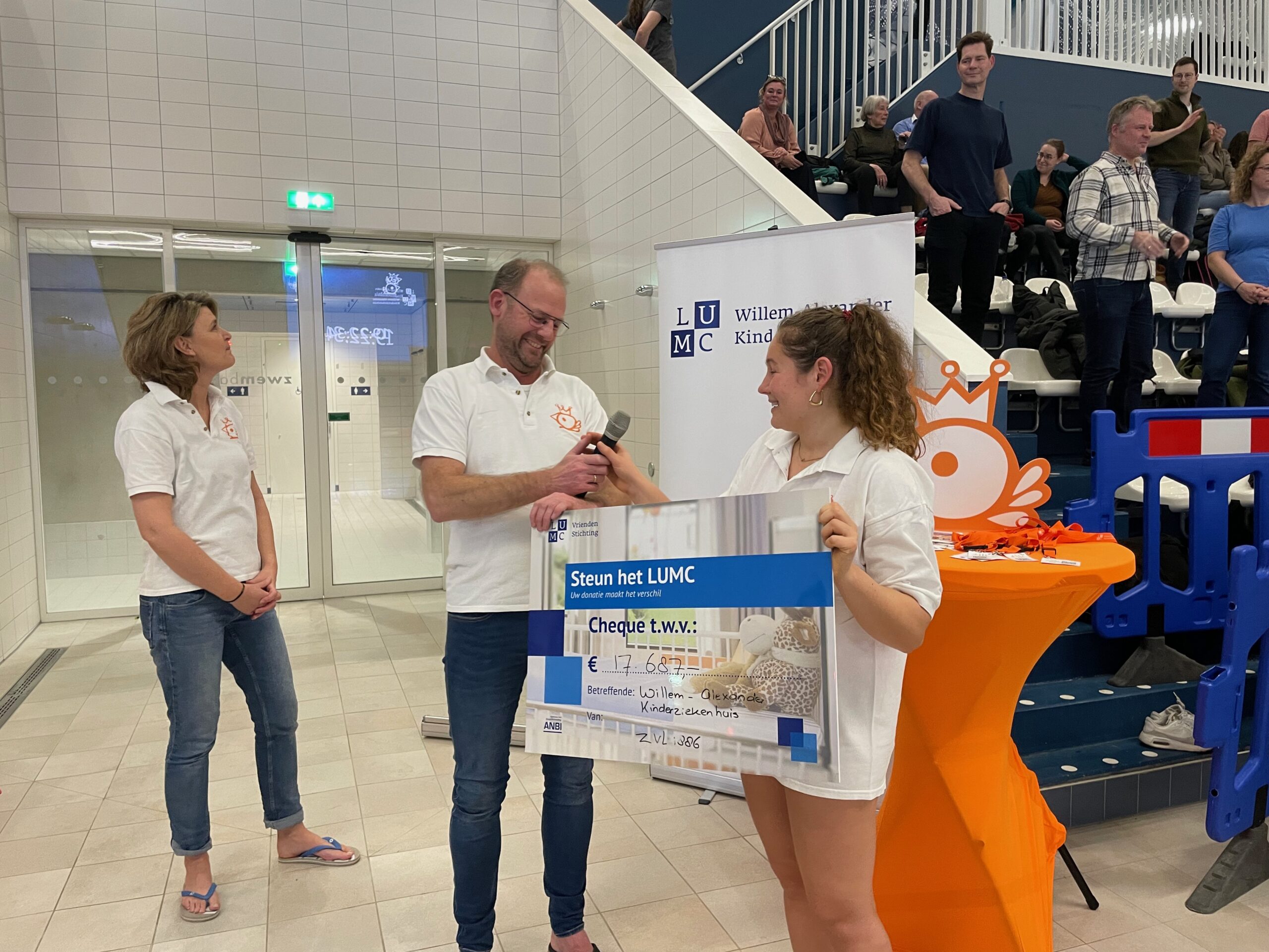 Voor het officiële startsein van de 100×100 overhandigt Sterre Spijker aan Arno Roest en Marlies Vlieland van Willem-Alexander Kinderziekenhuis de cheque met het bedrag 17.687,00 erop. “Ik denk dat het nog wel meer gaat worden, we zijn nog niet eens begonnen met zwemmen. Vorig jaar hebben we ruim achttienduizend euro opgehaald en daar wil ik graag overheen.” Aan het eind van de avond is het sponsorbedrag inderdaad al opgelopen tot meer dan 19.000 euro.