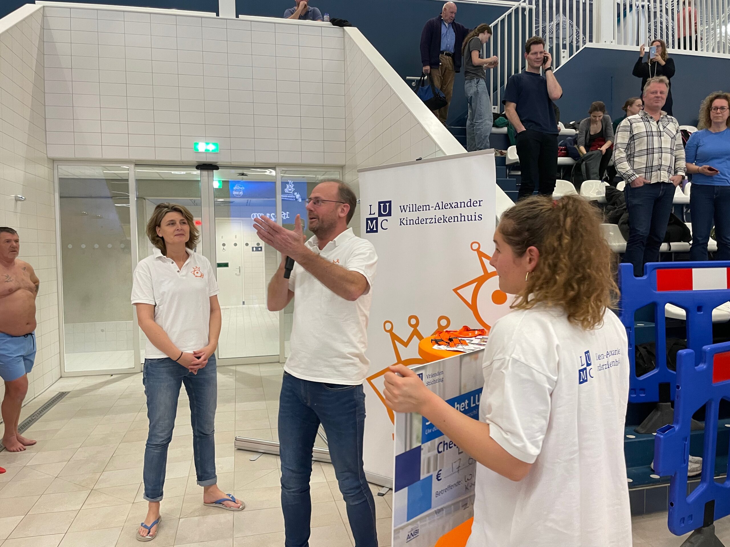Kindercardioloog Arno Roest is namens het goede doel aanwezig op het jaarlijkse zwemevenement van ZVL-1886. “Ik sta hier echt te glunderen. Ik ben echt zo blij met wat hier gebeurt. Alle mensen die zich zo actief inzetten.” Het geld willen Roest en zijn collega’s inzetten om het verblijf in het ziekenhuis zo stressvrij mogelijk te maken voor kinderen. “Zoals VR-brillen waardoor kinderen een rondleiding krijgen in de operatiekamer.”