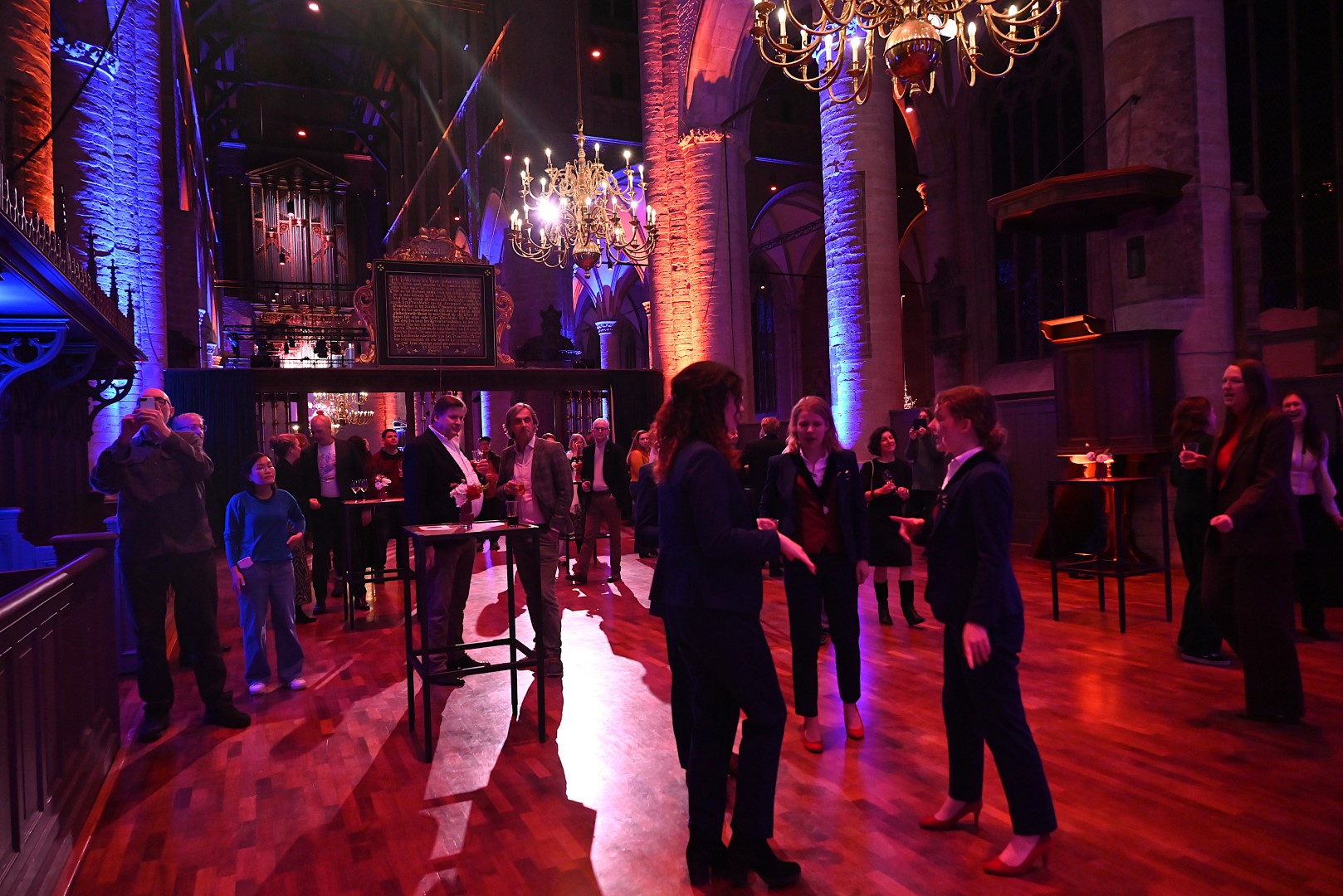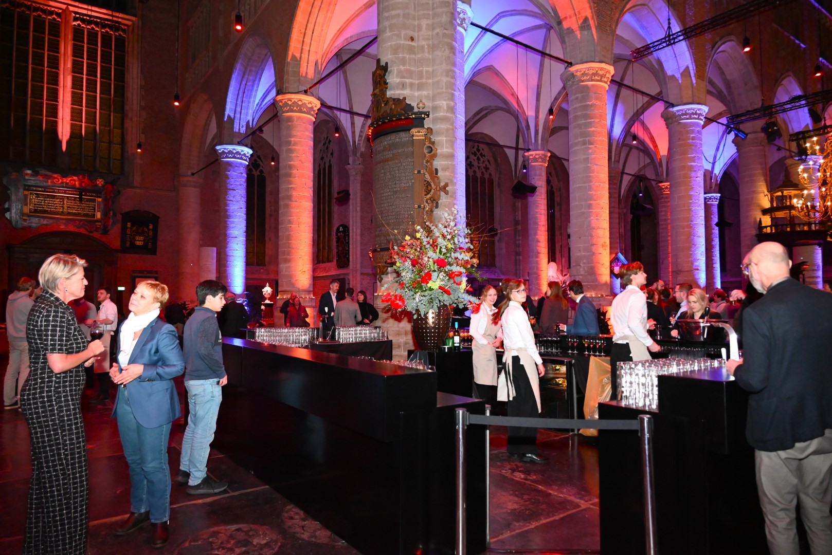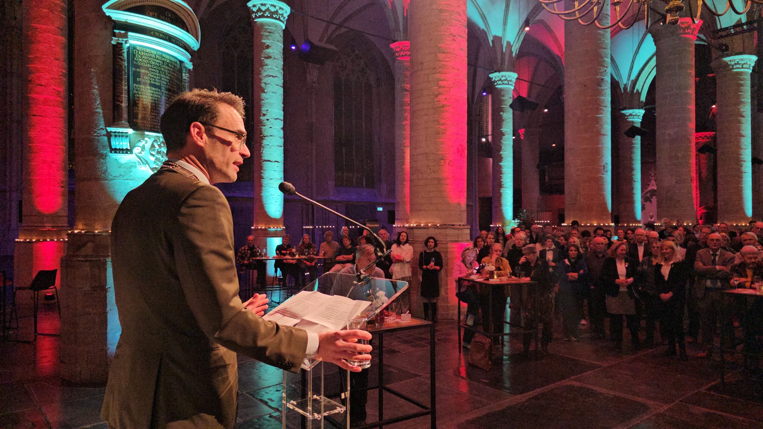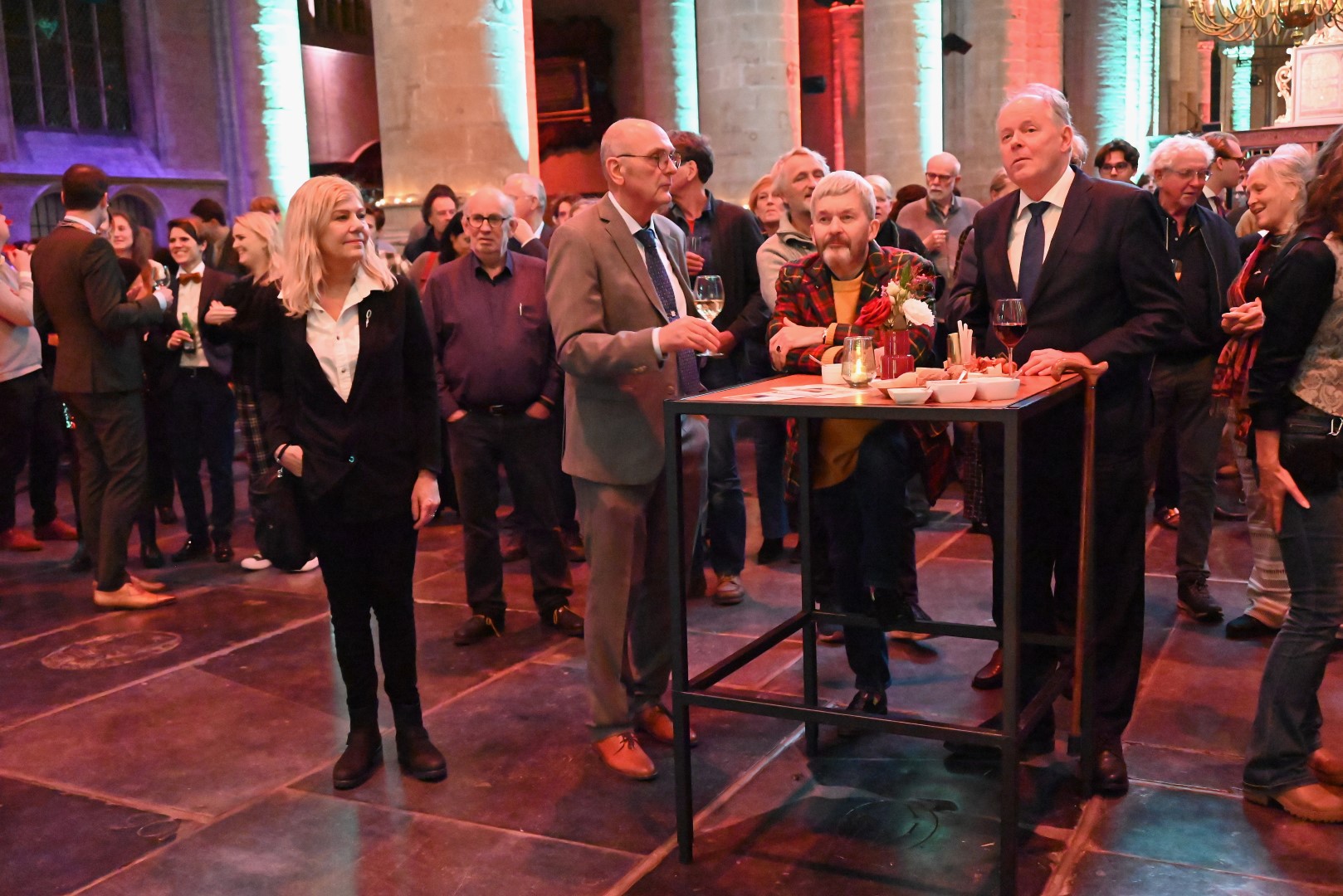 Bij de ingang van de Pieterskerk werden de bezoekers persoonlijk ontvangen door burgemeester Peter Heijkoop samen met het grootste deel van het college en kreeg iedereen een hand en de beste wensen voor 2025. Door het wegvallen van het concert kon de hele kerk gebruikt worden voor de nieuwjaarsreceptie. Het zag er met alle statafels gezellig uit en DJ- saxofonist Charleon liep al spelend door de kerk.