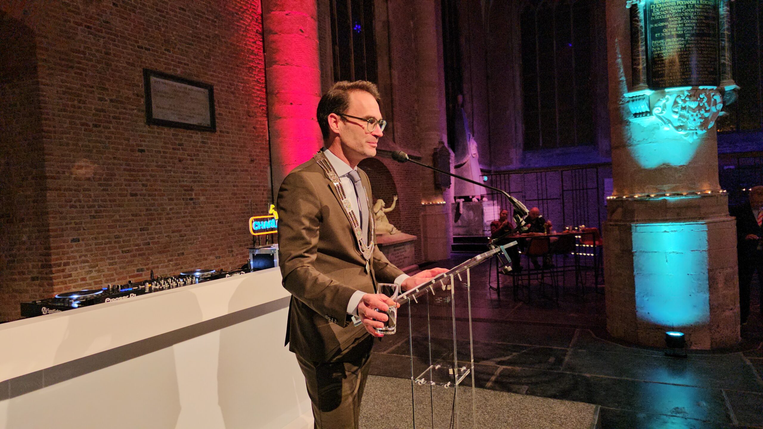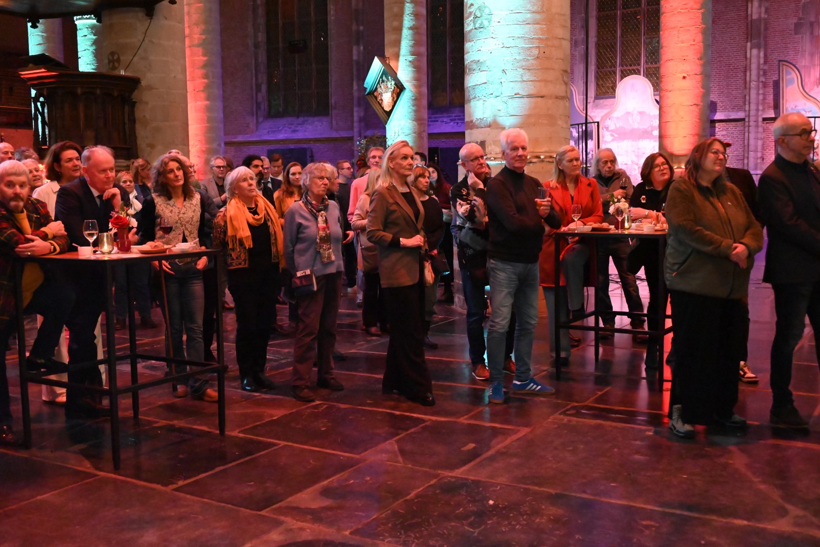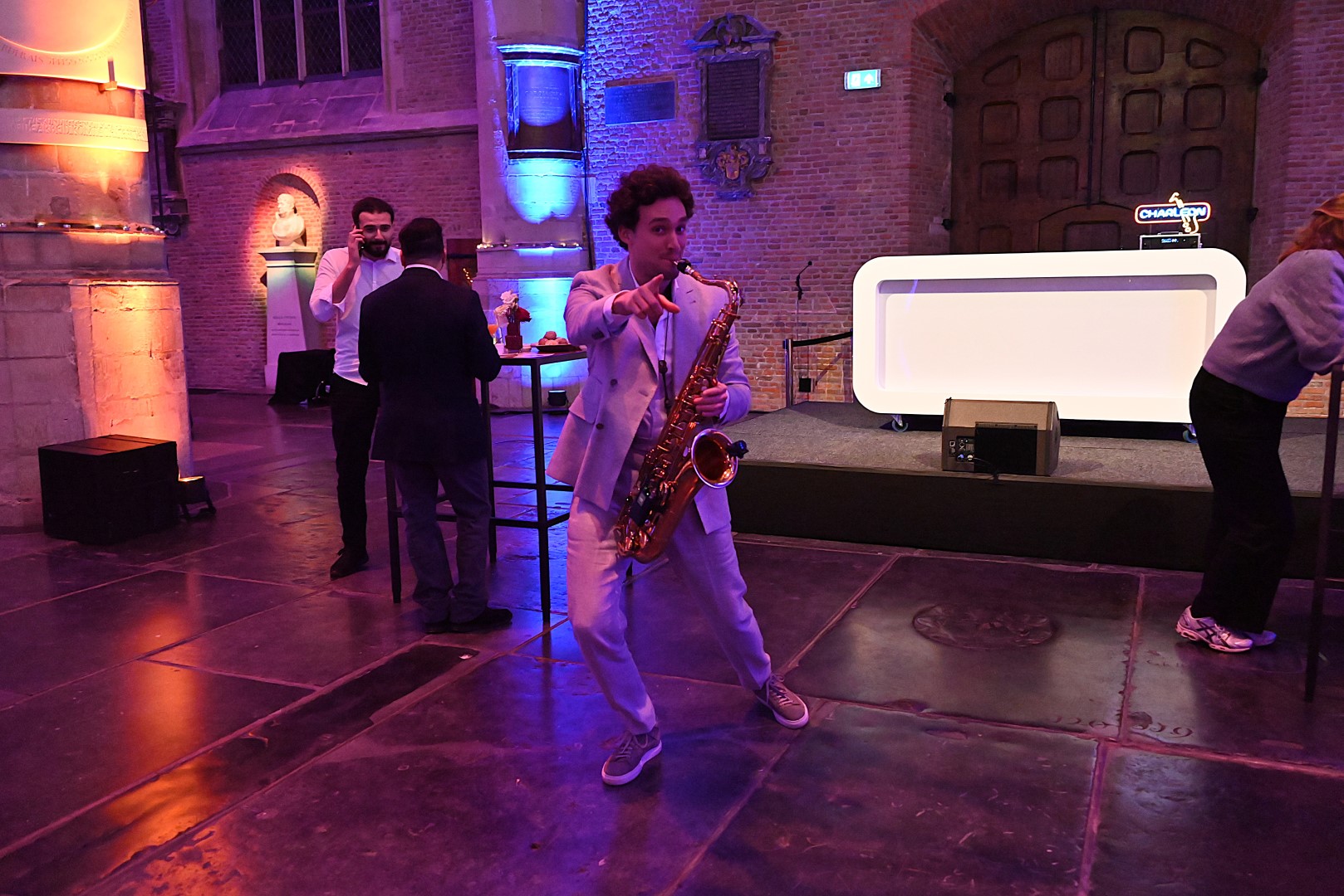 Bij de ingang van de Pieterskerk werden de bezoekers persoonlijk ontvangen door burgemeester Peter Heijkoop samen met het grootste deel van het college en kreeg iedereen een hand en de beste wensen voor 2025. Door het wegvallen van het concert kon de hele kerk gebruikt worden voor de nieuwjaarsreceptie. Het zag er met alle statafels gezellig uit en DJ- saxofonist Charleon liep al spelend door de kerk.