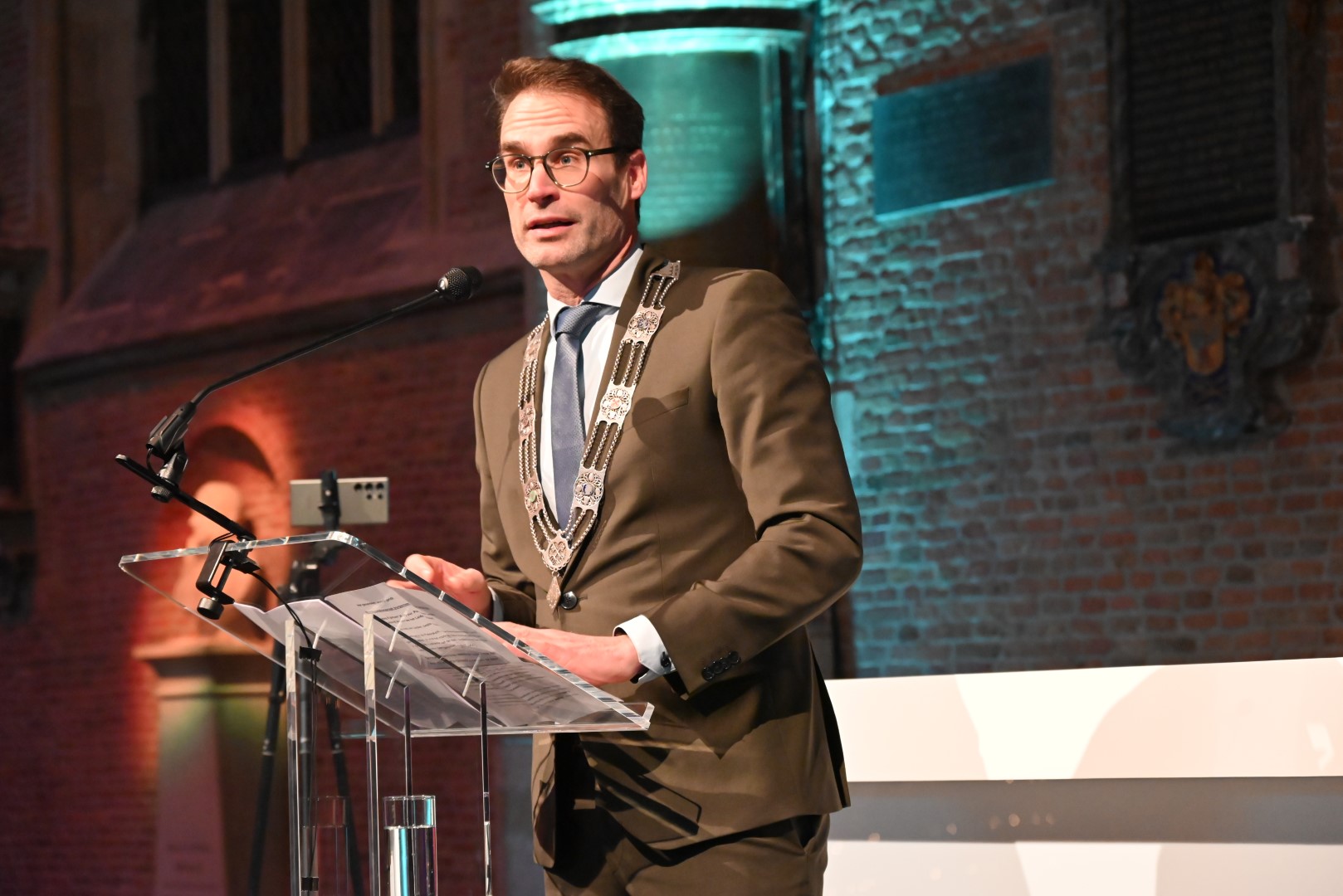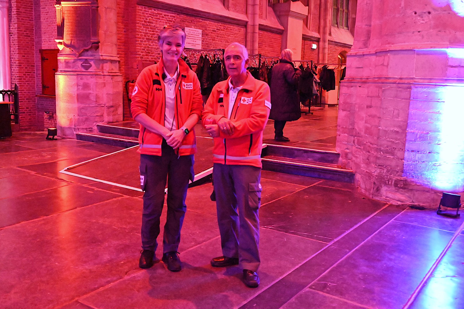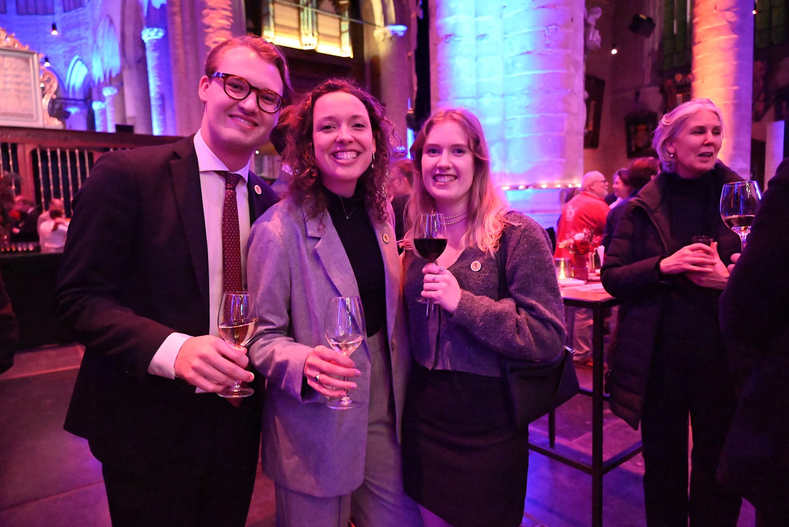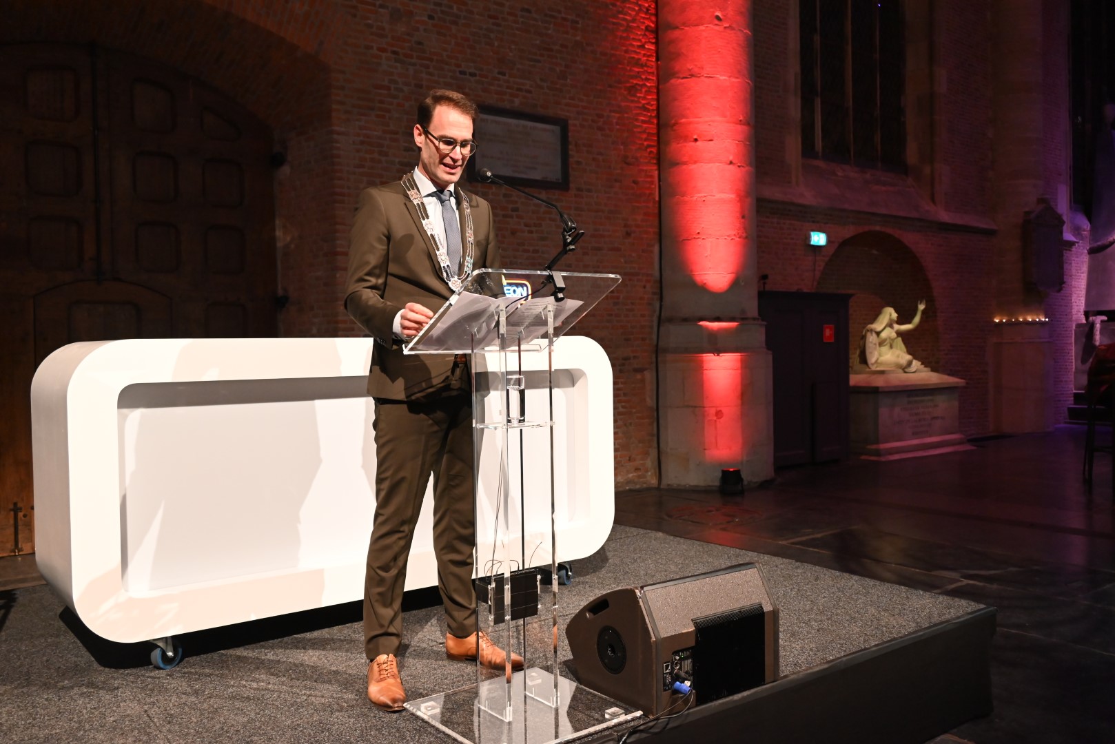 Bij de ingang van de Pieterskerk werden de bezoekers persoonlijk ontvangen door burgemeester Peter Heijkoop samen met het grootste deel van het college en kreeg iedereen een hand en de beste wensen voor 2025. Door het wegvallen van het concert kon de hele kerk gebruikt worden voor de nieuwjaarsreceptie. Het zag er met alle statafels gezellig uit en DJ- saxofonist Charleon liep al spelend door de kerk.