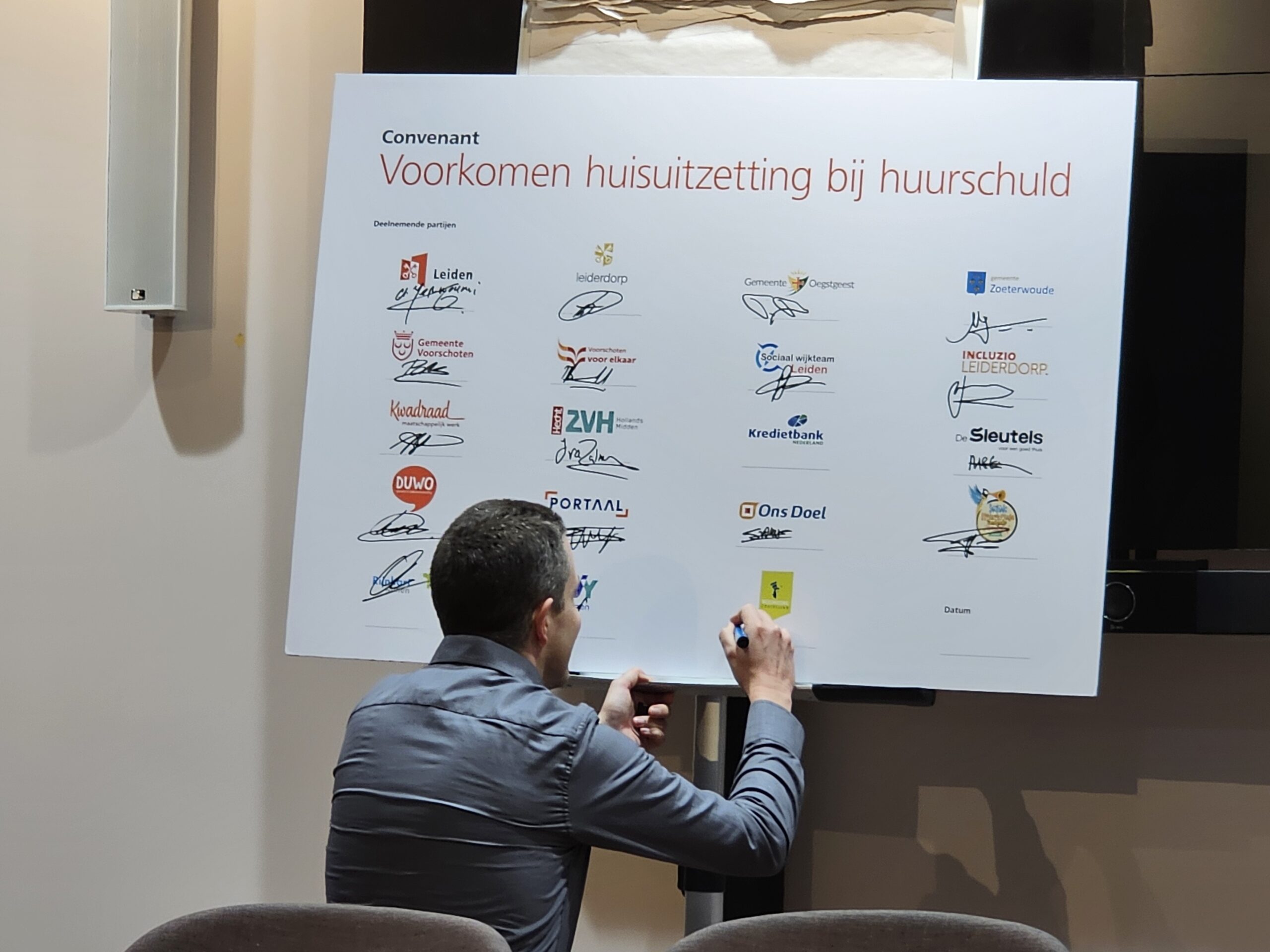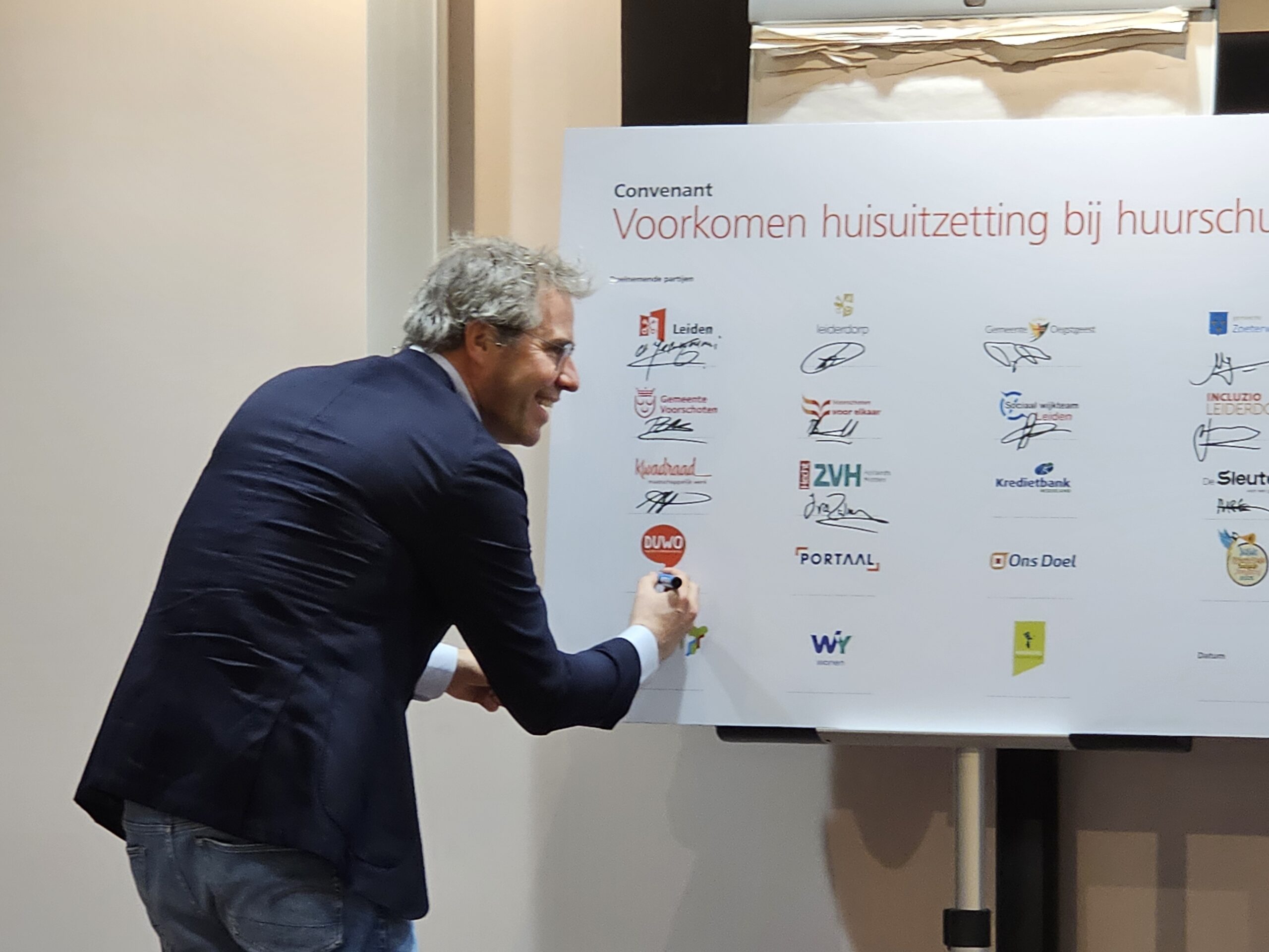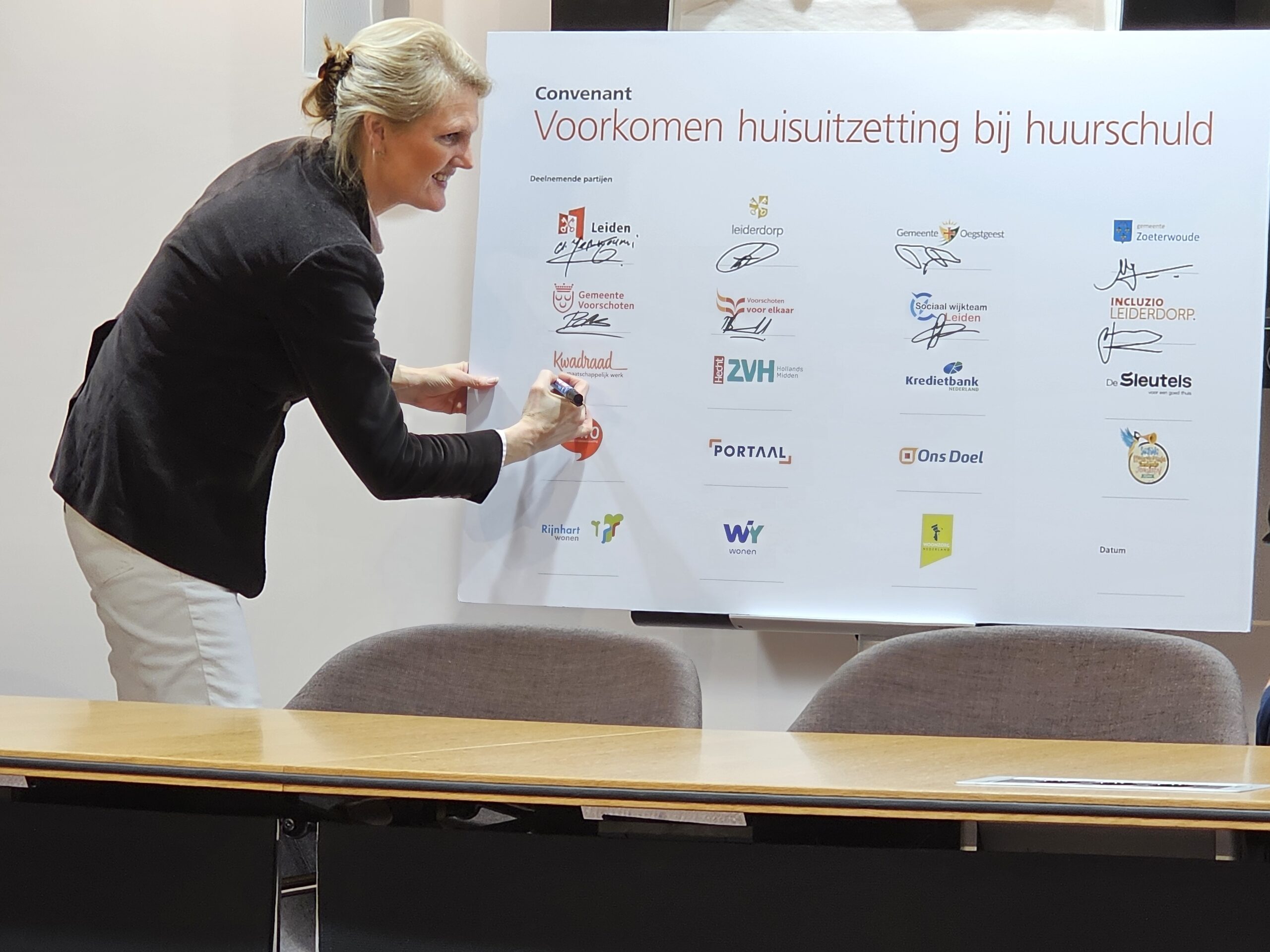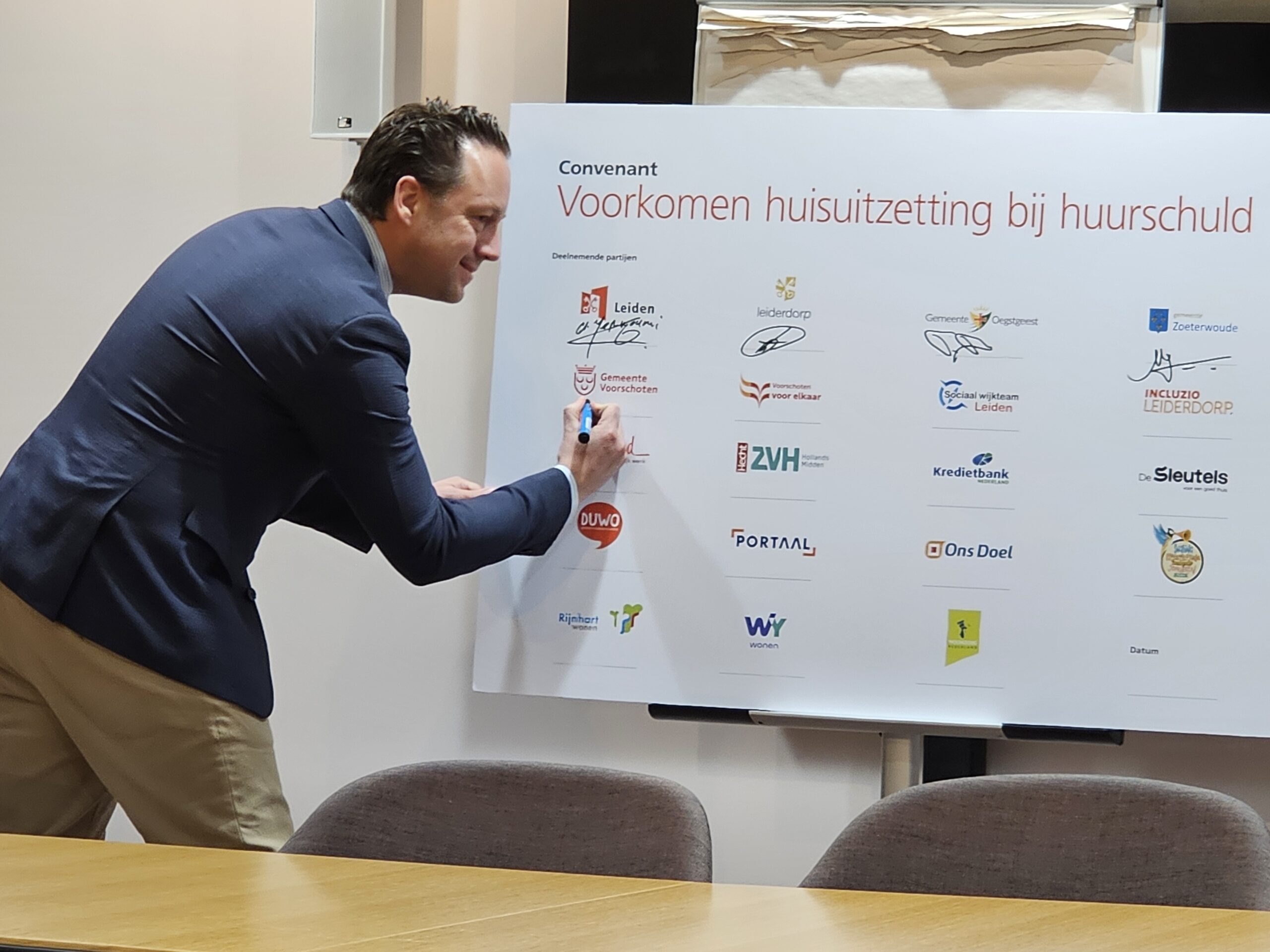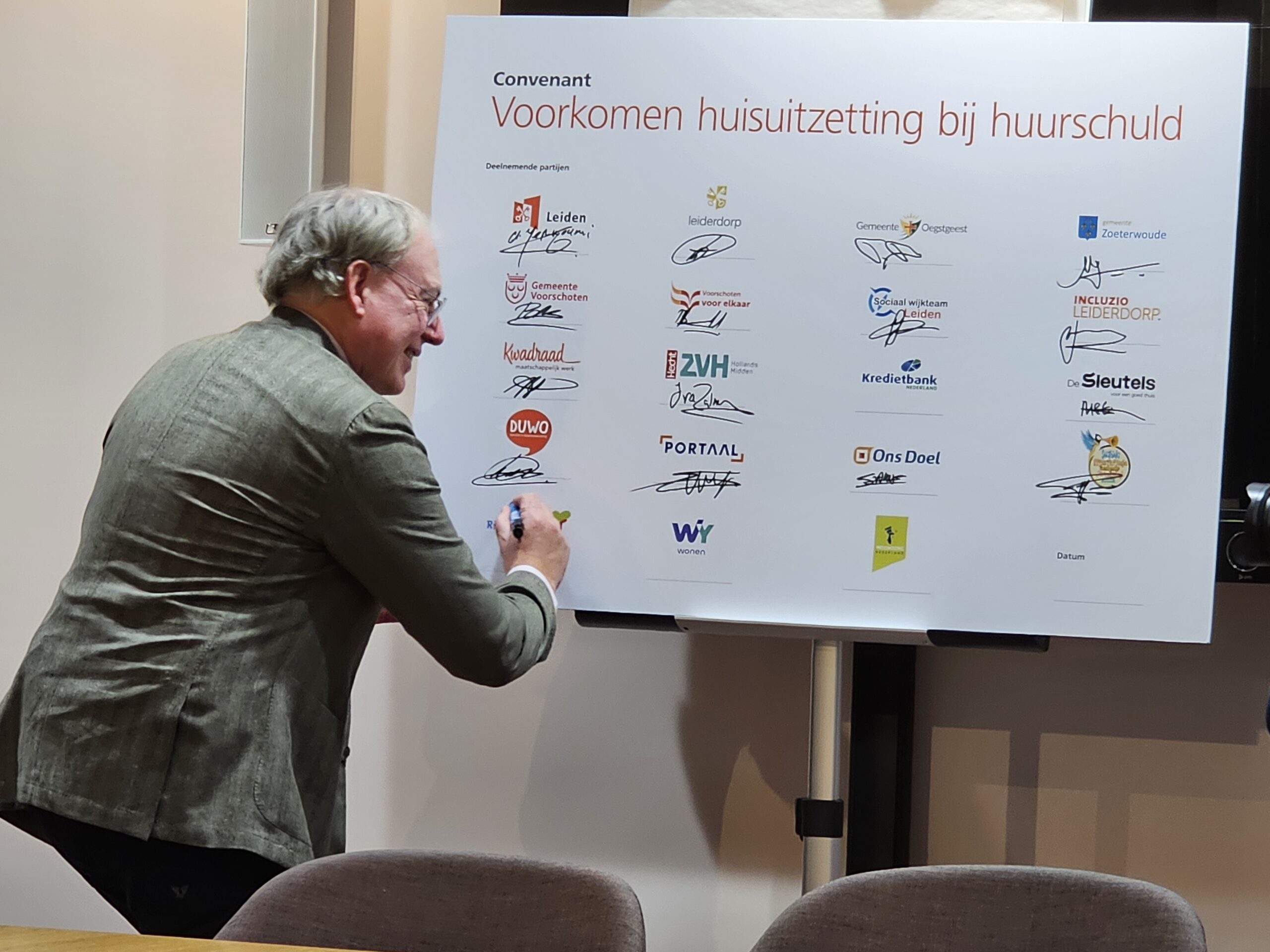 Naast een aantal maatschappelijke organisaties hebben donderdagmiddag ook alle woningcorporaties die in onze regio actief zijn hun handtekening onder de afspraken gezet. Naast de algemene Leidse corporaties De Sleutels en Ons Doel zijn dat ook studentenhuisvester DUWO en de Stichting Huisvesting Werkende Jongeren. Uit de regiogemeenten tekenden Rijnhart Wonen en WYwonen mee.