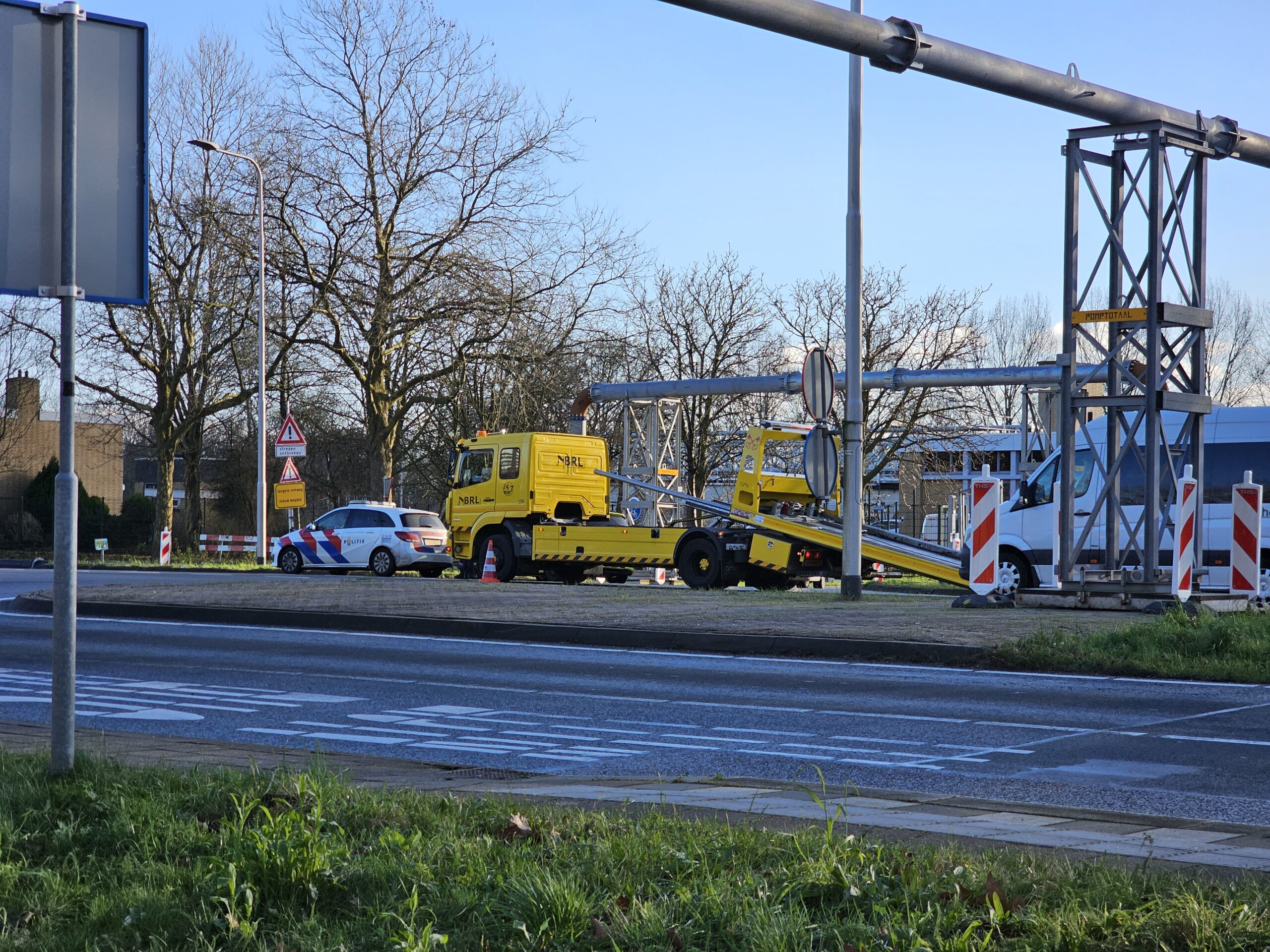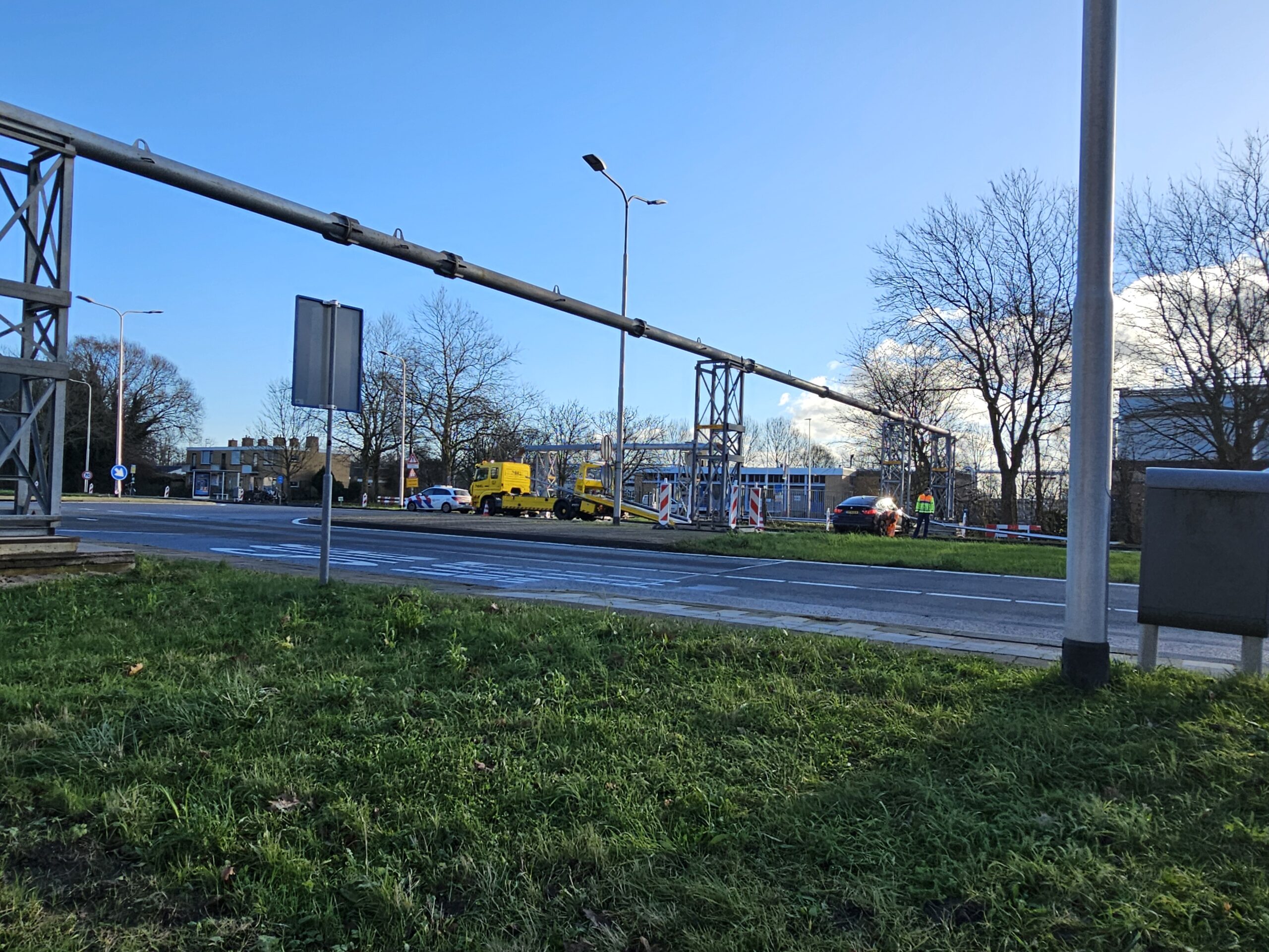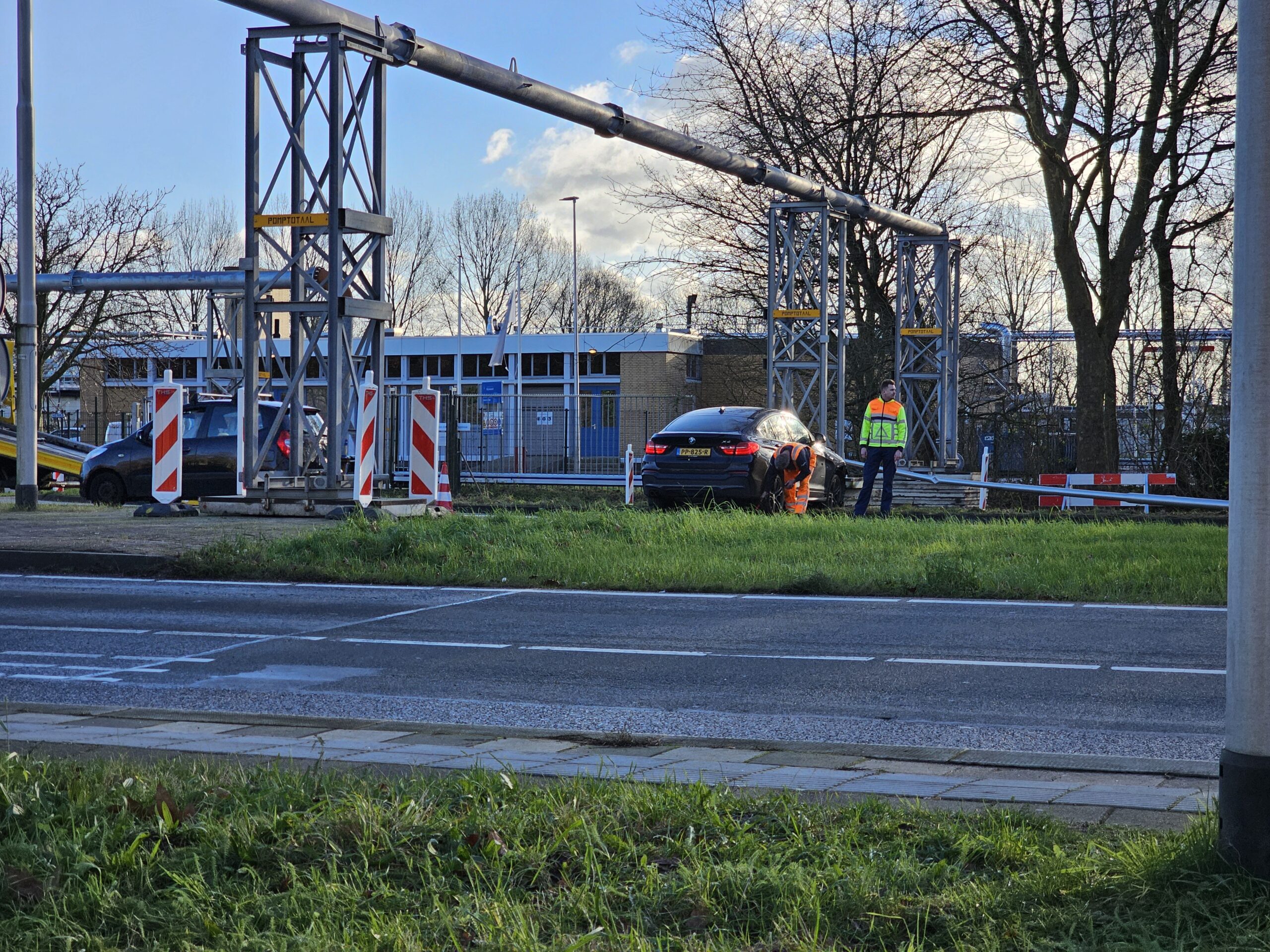 Een auto is vrijdagochtend op de Voorschoterweg in Leiden van de weg geschoten en tegen een tijdelijke pilaar van een buizenstelling tot stilstand gekomen. In de slip richting de pilaar is ook een lantaarnpaal volledig uit de grond gereden.