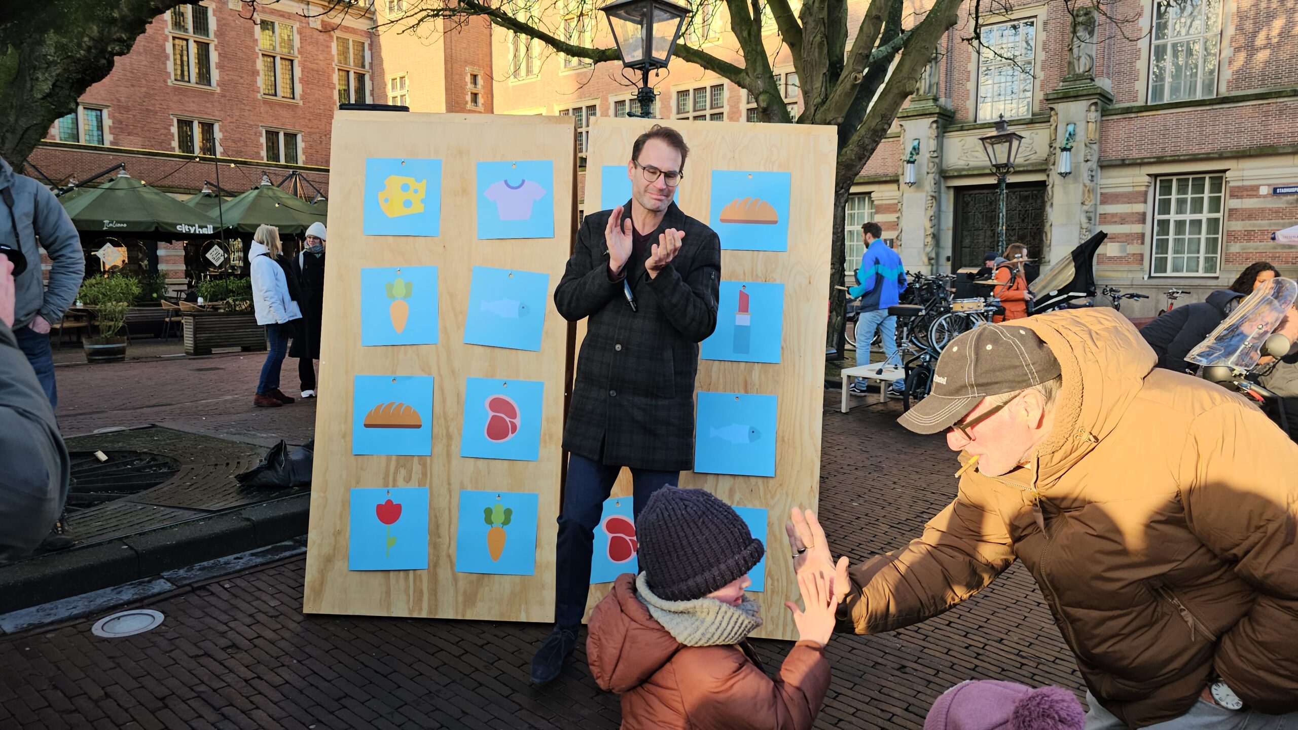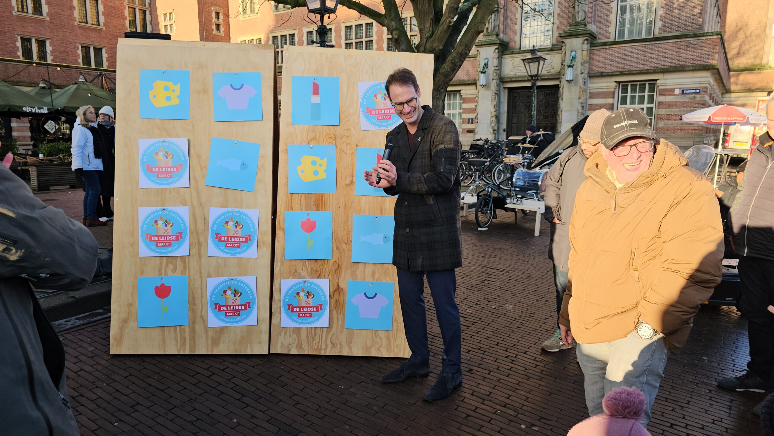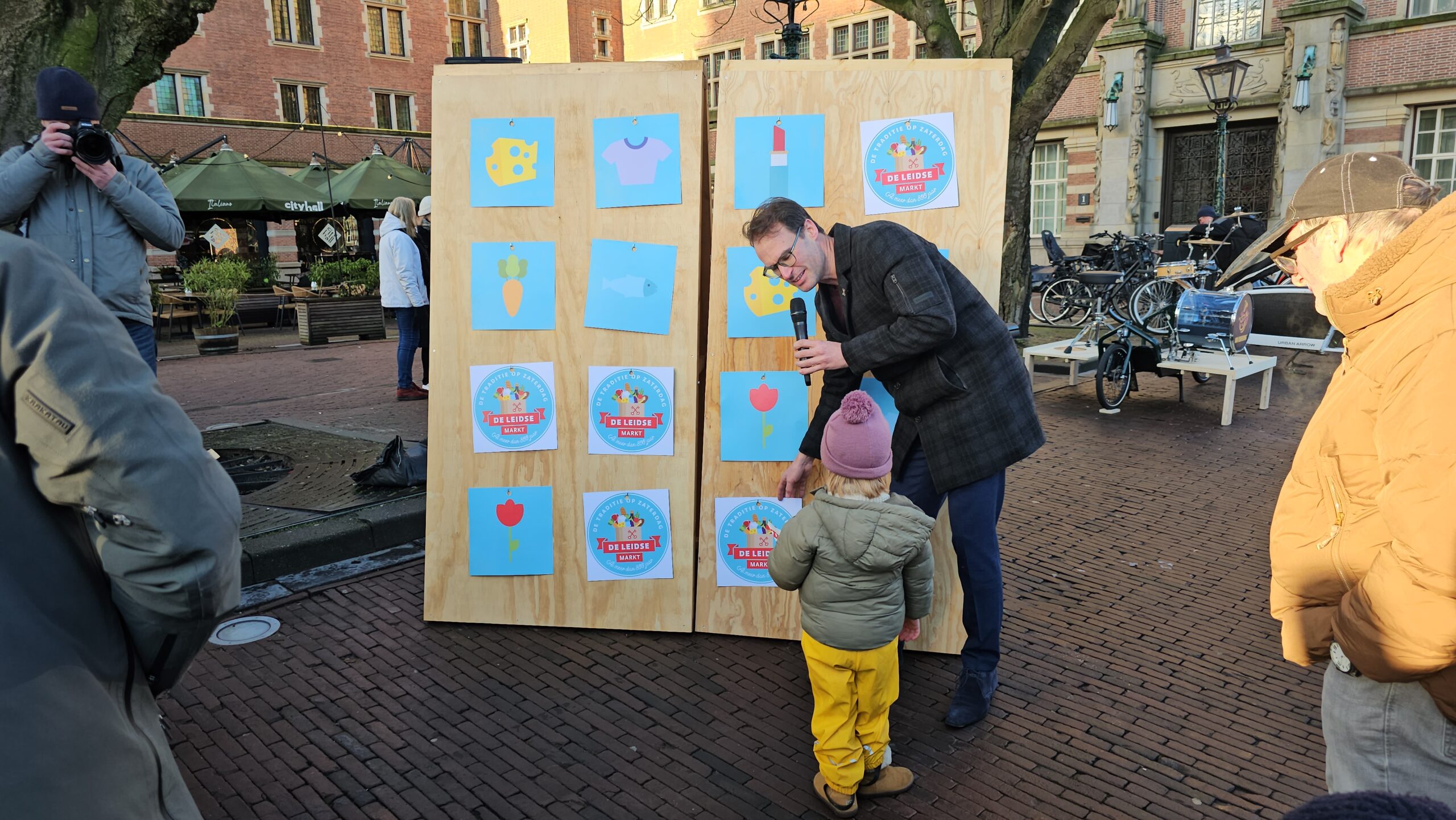 Door memory te spelen met enkele marktbezoekers heeft burgemeester Peter Heijkoop zaterdagmorgen om 10.00 uur de vernieuwde Leidse centrummarkt feestelijk geopend. Achter de memorykaartjes zaten allerlei versproducten verscholen die op de markt te koop zijn.