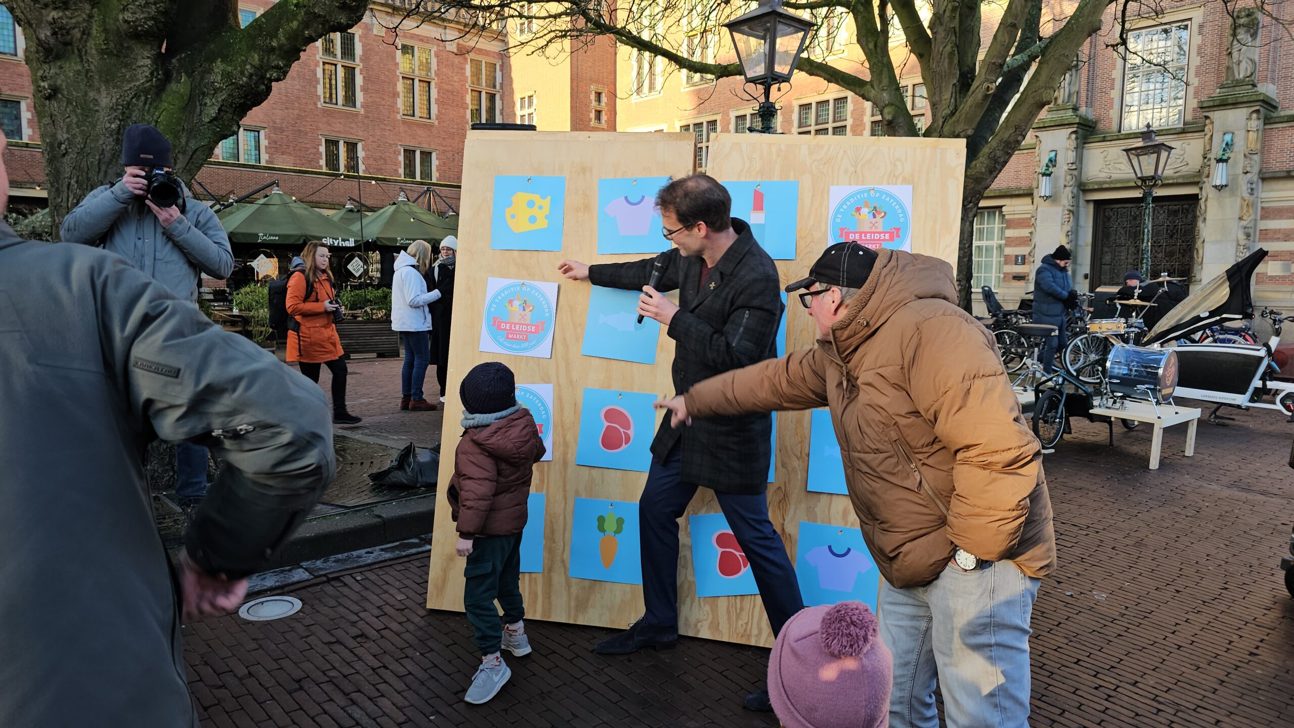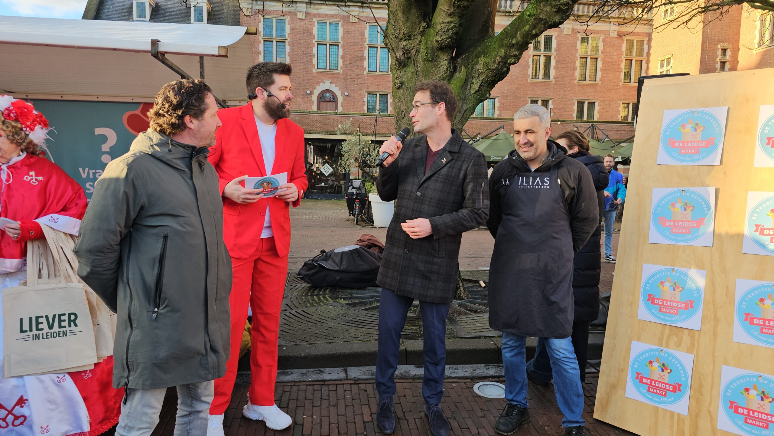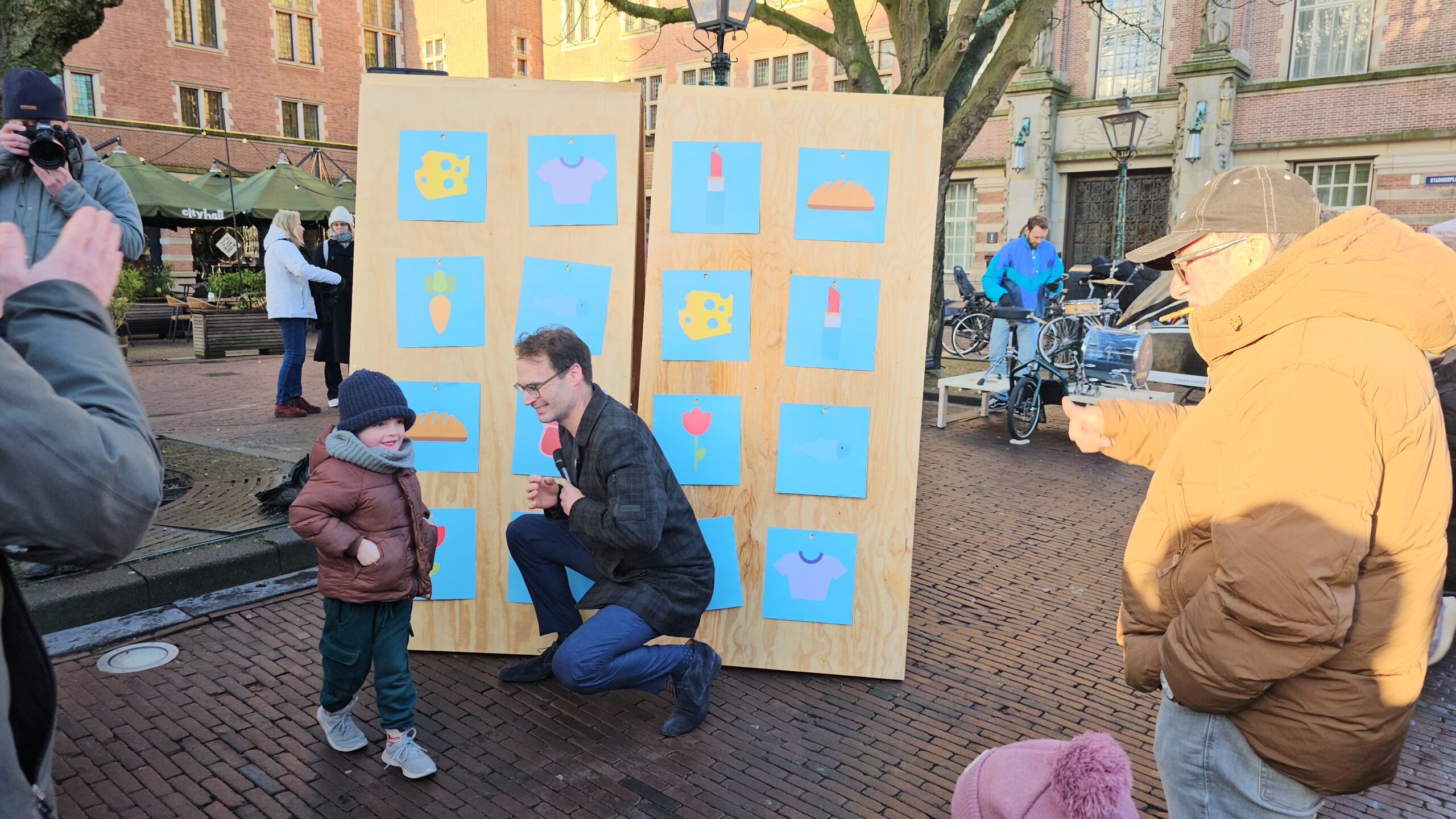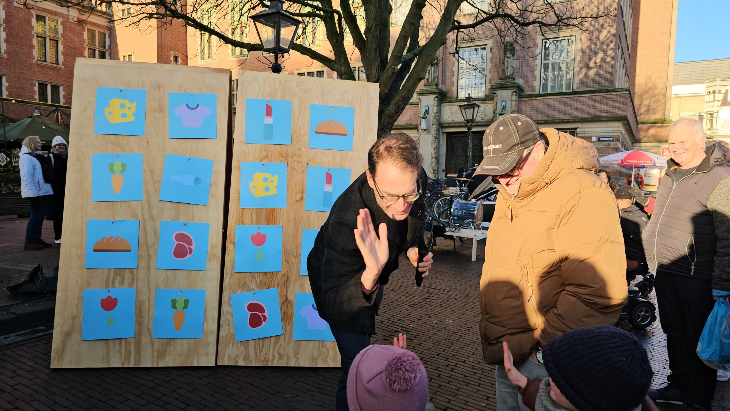 Door memory te spelen met enkele marktbezoekers heeft burgemeester Peter Heijkoop zaterdagmorgen om 10.00 uur de vernieuwde Leidse centrummarkt feestelijk geopend. Achter de memorykaartjes zaten allerlei versproducten verscholen die op de markt te koop zijn.