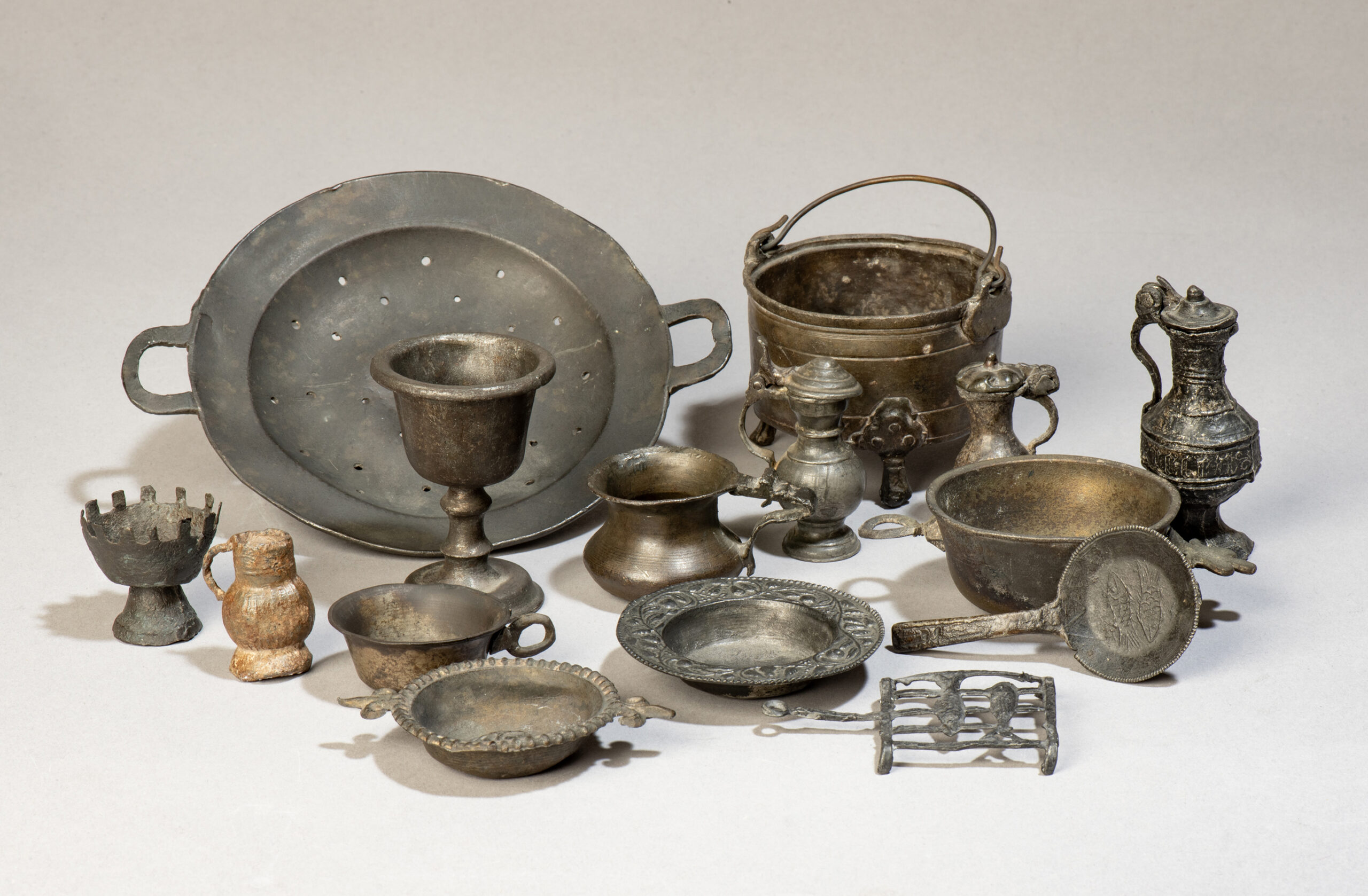 Absolute topstukken zijn een vroeg-dertiende-eeuwse kandelaar met ruiters, een pelgrimsampul met originele schakelketting, een tuitkan (‘Jan-Steen-kan’) en een unieke beker met daarop een tekst die de gebruiker moest aansporen om met matigheid te drinken.