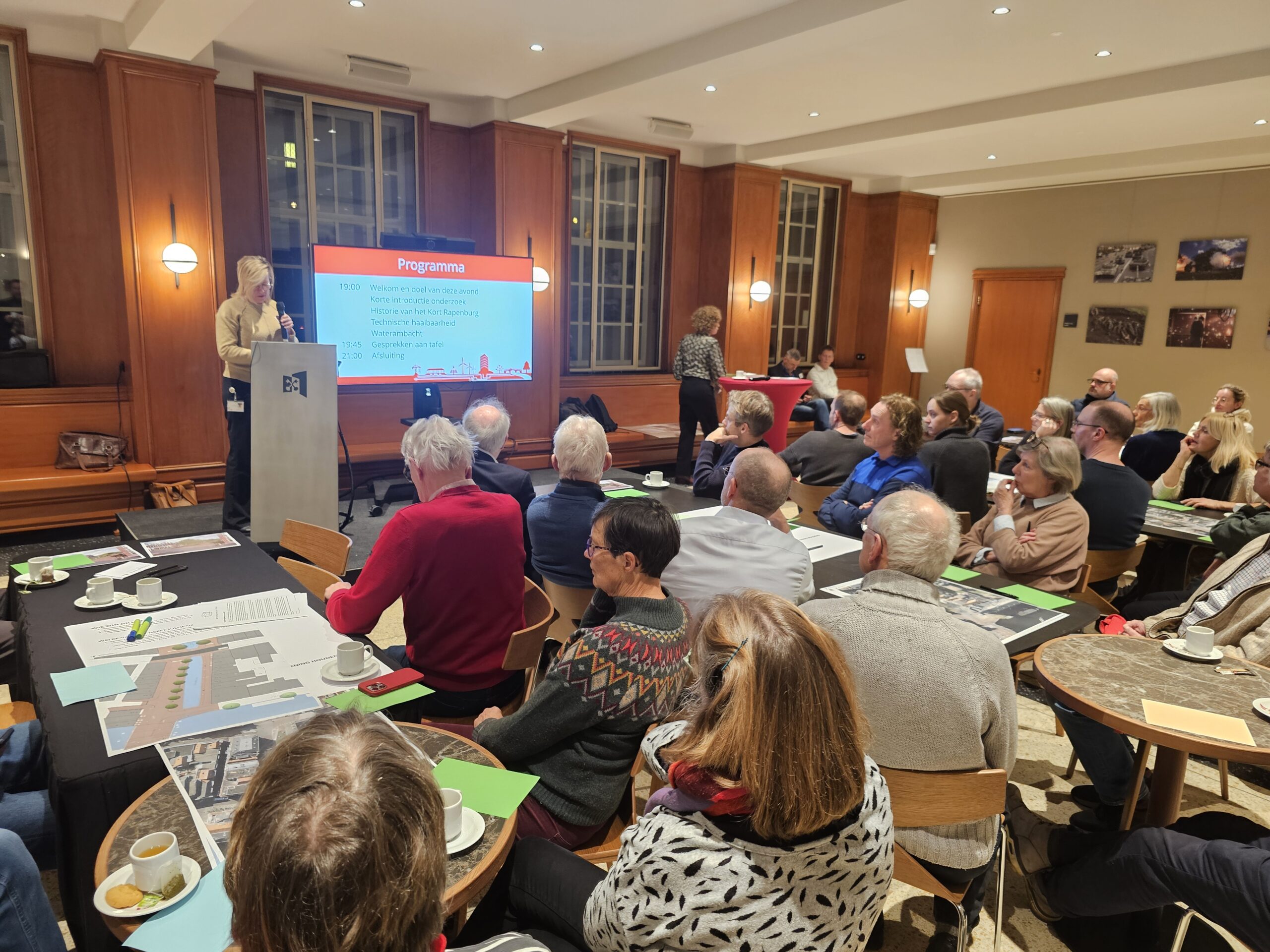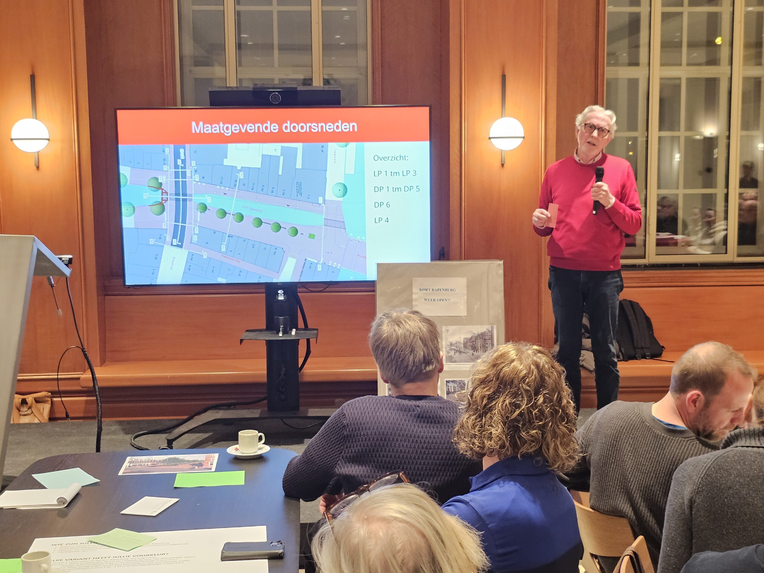Tijdens een drukbezochte participatiebijeenkomst in de foyer van het Leidse stadhuis is woensdagavond uitgebreid van gedachten gewisseld over het al dan niet terugbrengen van het water op het Kort Rapenburg. Of eigenlijk het weer zichtbaar maken, want de oude watergang ligt nog onder het bestaande wegdek.