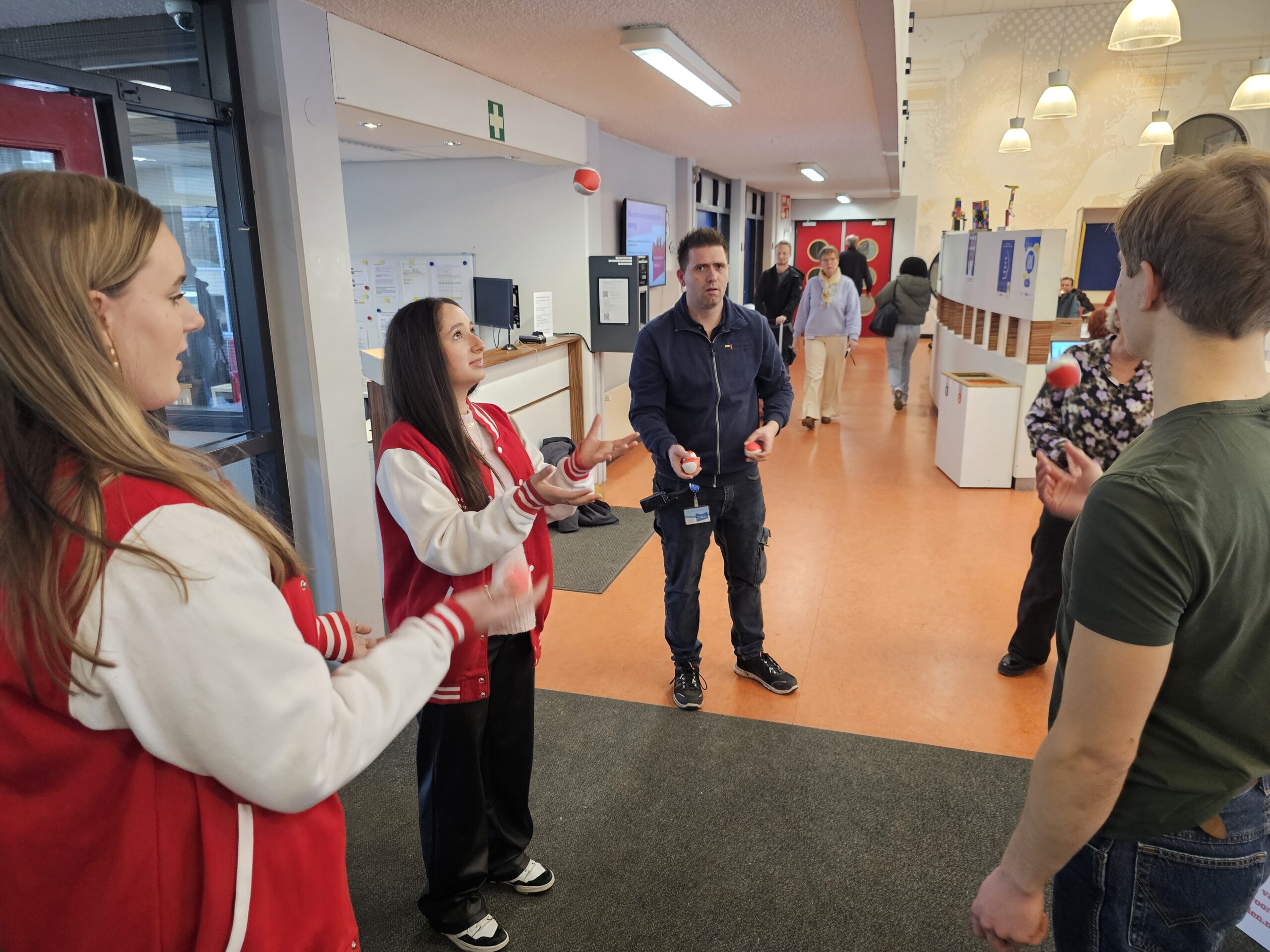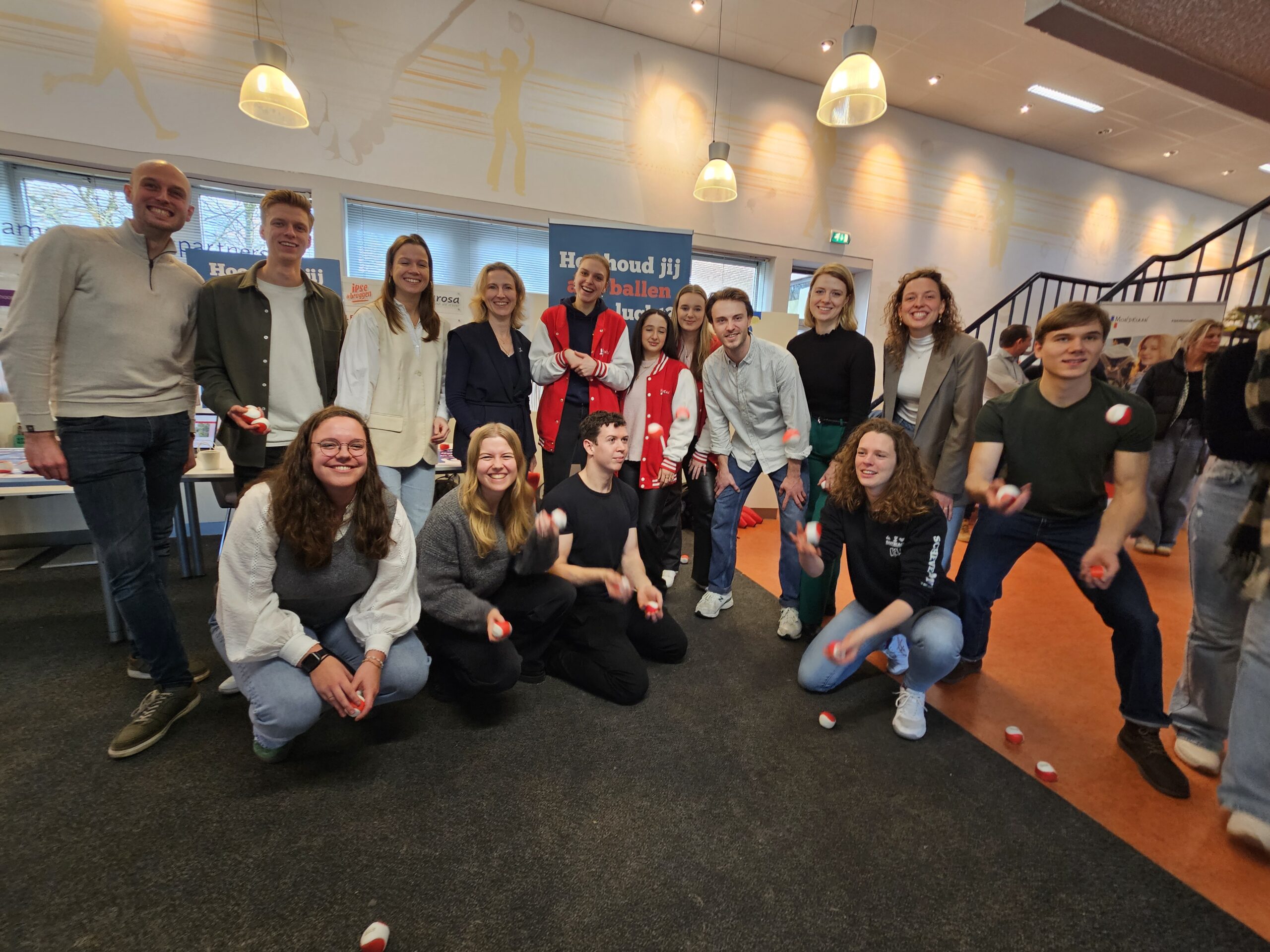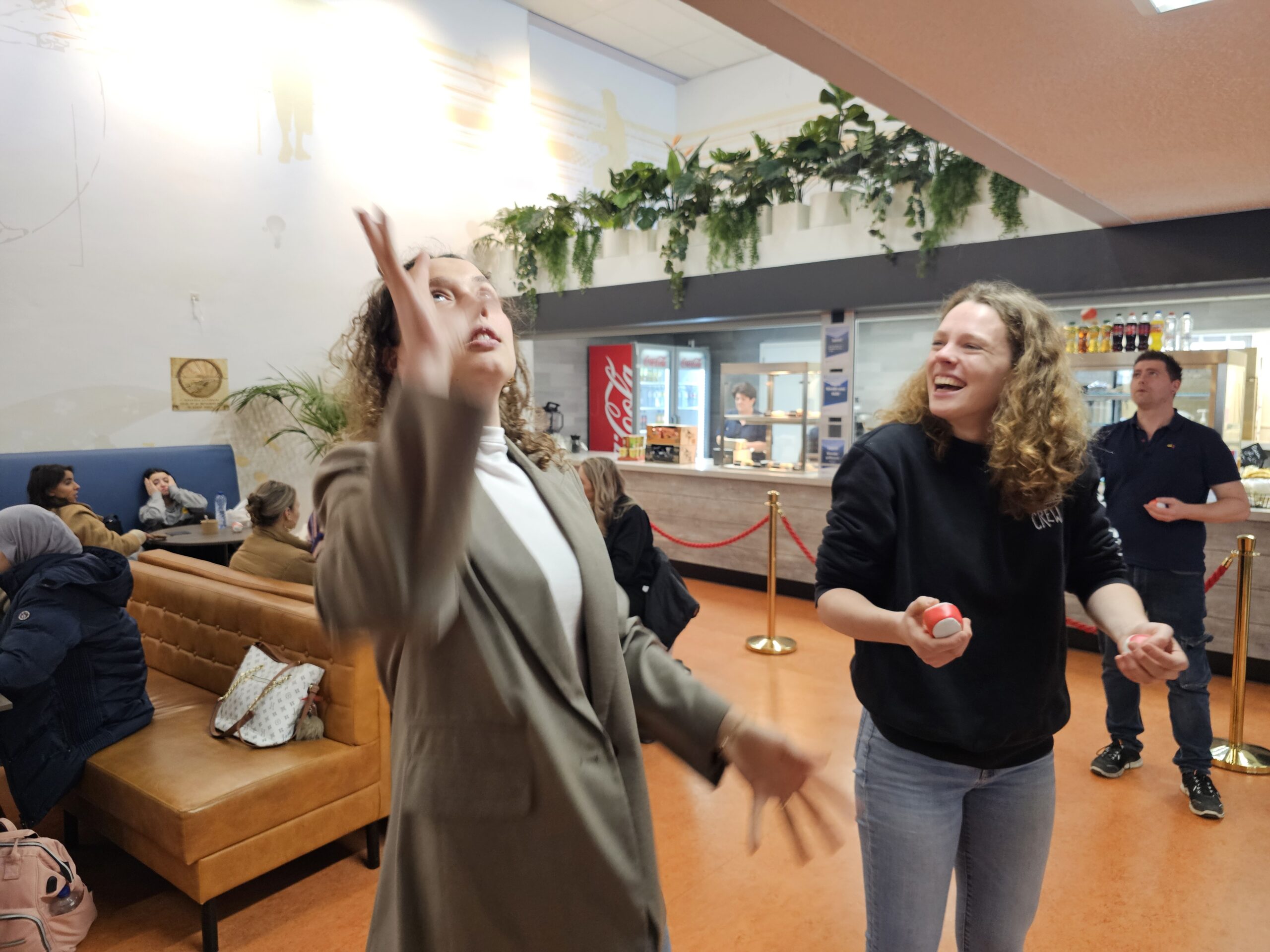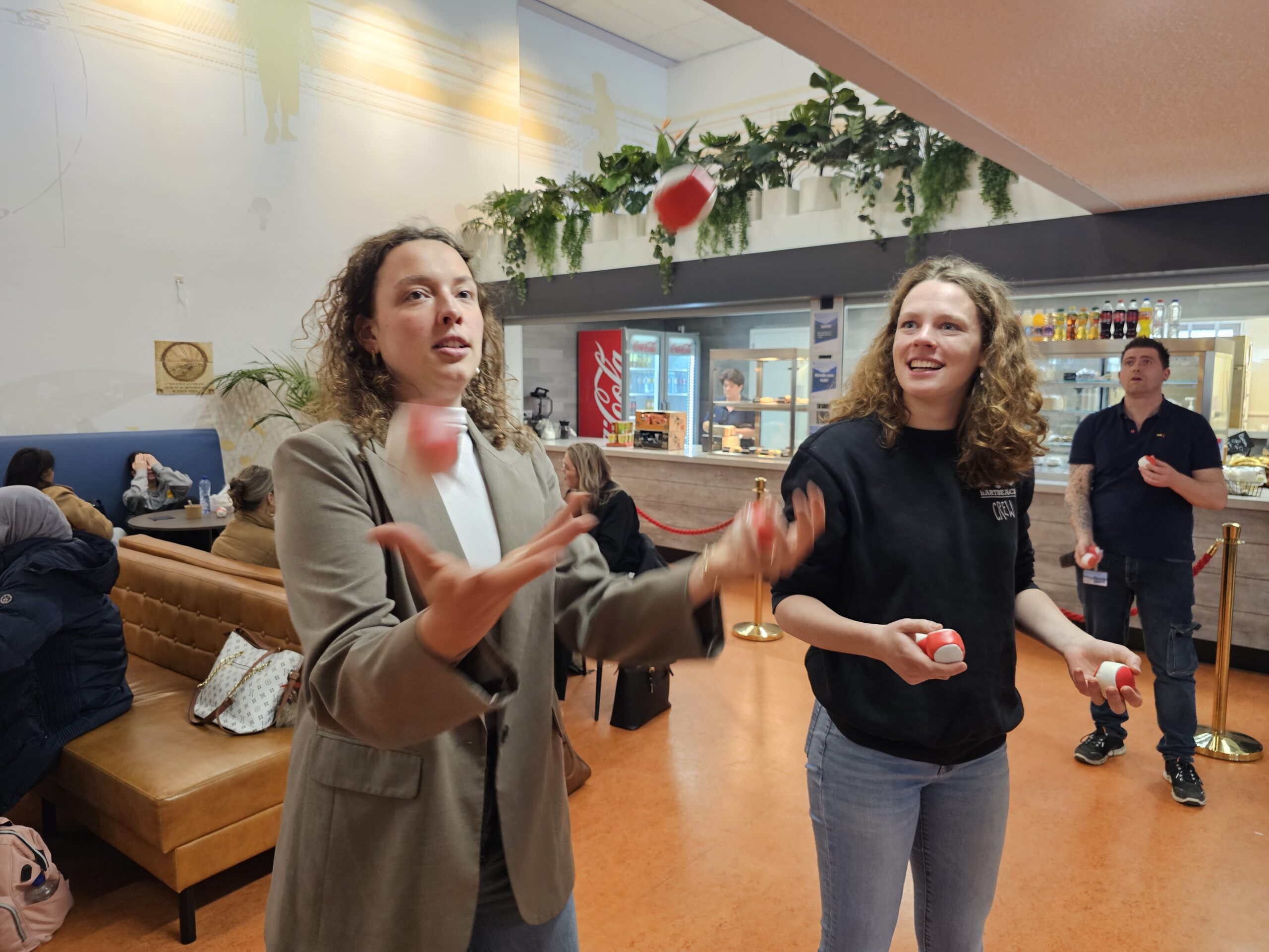 Ondertussen geven jongleurs een demonstratie ‘ballen in de lucht houden’ en wie wil mag het ook even proberen. Dat deed ook duoraadslid Claire van Megen van Studenten Voor Leiden. Van Megen is al langer bezig met zaken als prestatiedruk en mentale gezondheid onder studenten en werd met haar Stichting PraatErover een jaar geleden al gekozen tot ‘Persoon van het Jaar’ door de lezers van het Leidsch Dagblad.