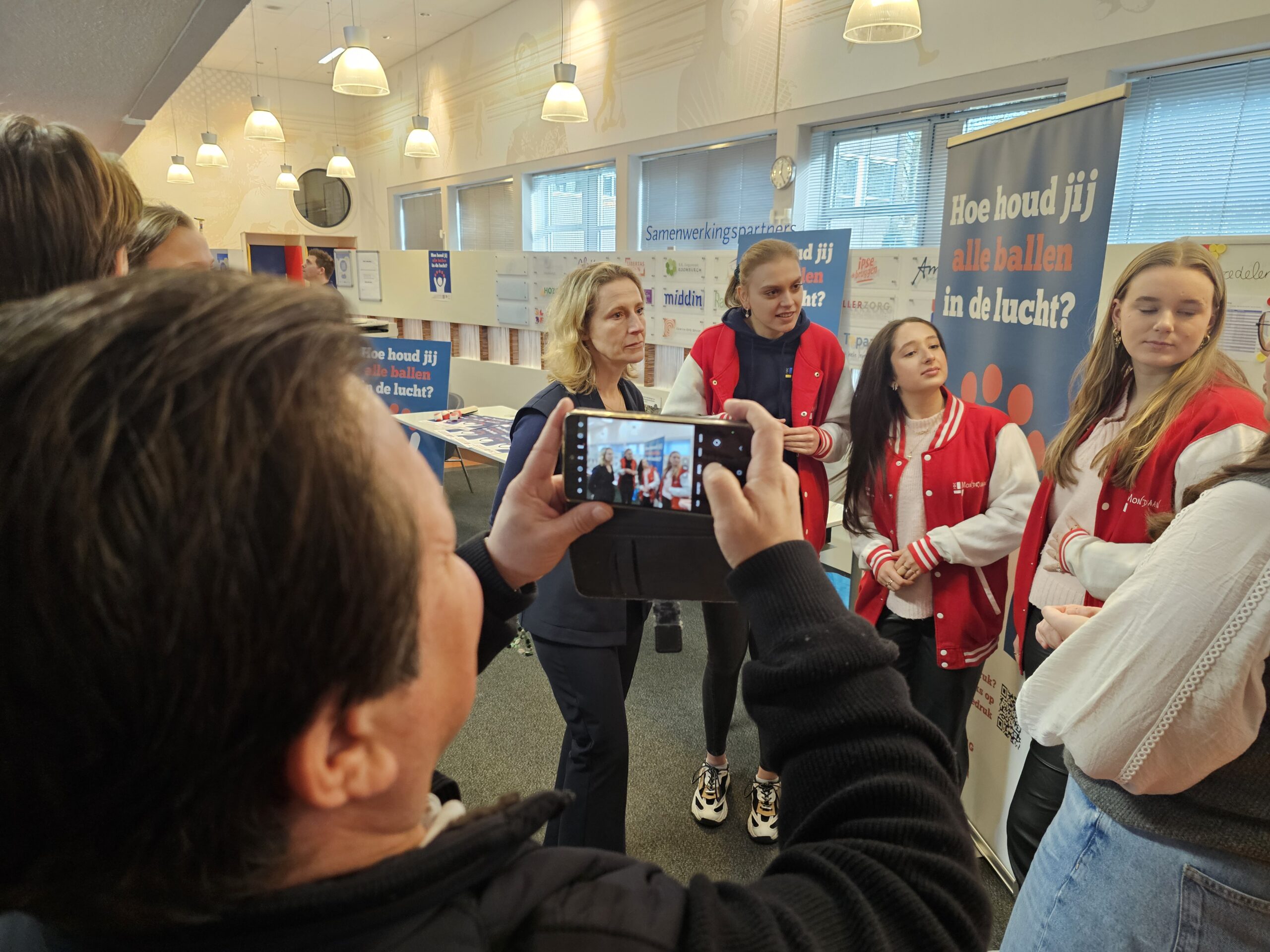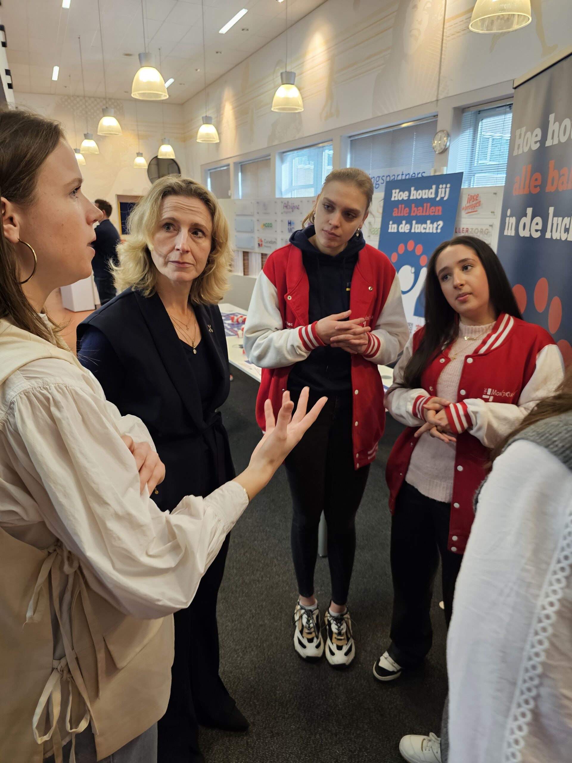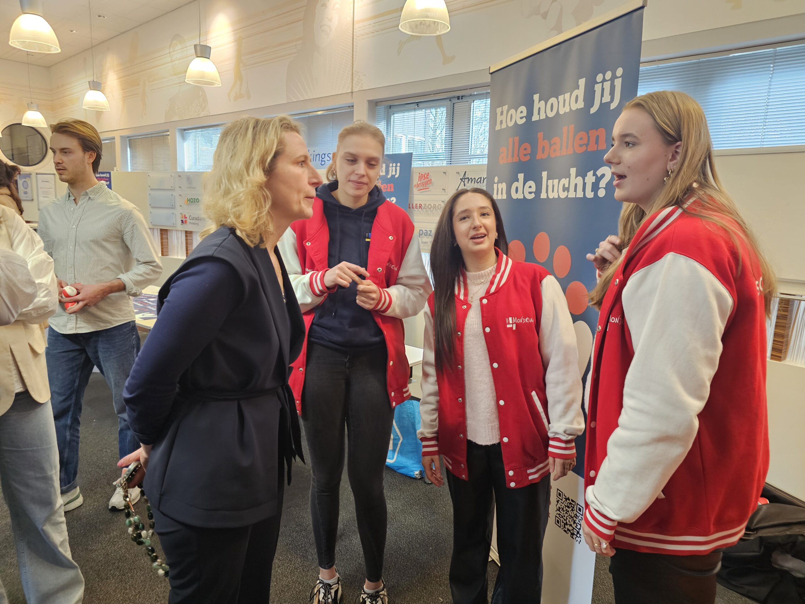 De nieuwe kenniswethouder Wietske Veltman kwam ook een kijkje nemen bij de campagnestart en ging uitgebreid in gesprek met een aantal studenten van ROC Mondriaan die stuk voor stuk bevestigen dat de druk soms wel erg hoog is. “School, stage, een bijbaantje en dan ook nog tijd zien te vinden om leuke dingen te doen met vrienden. Het is allemaal wel eens teveel”, vertellen bijna alle studenten.