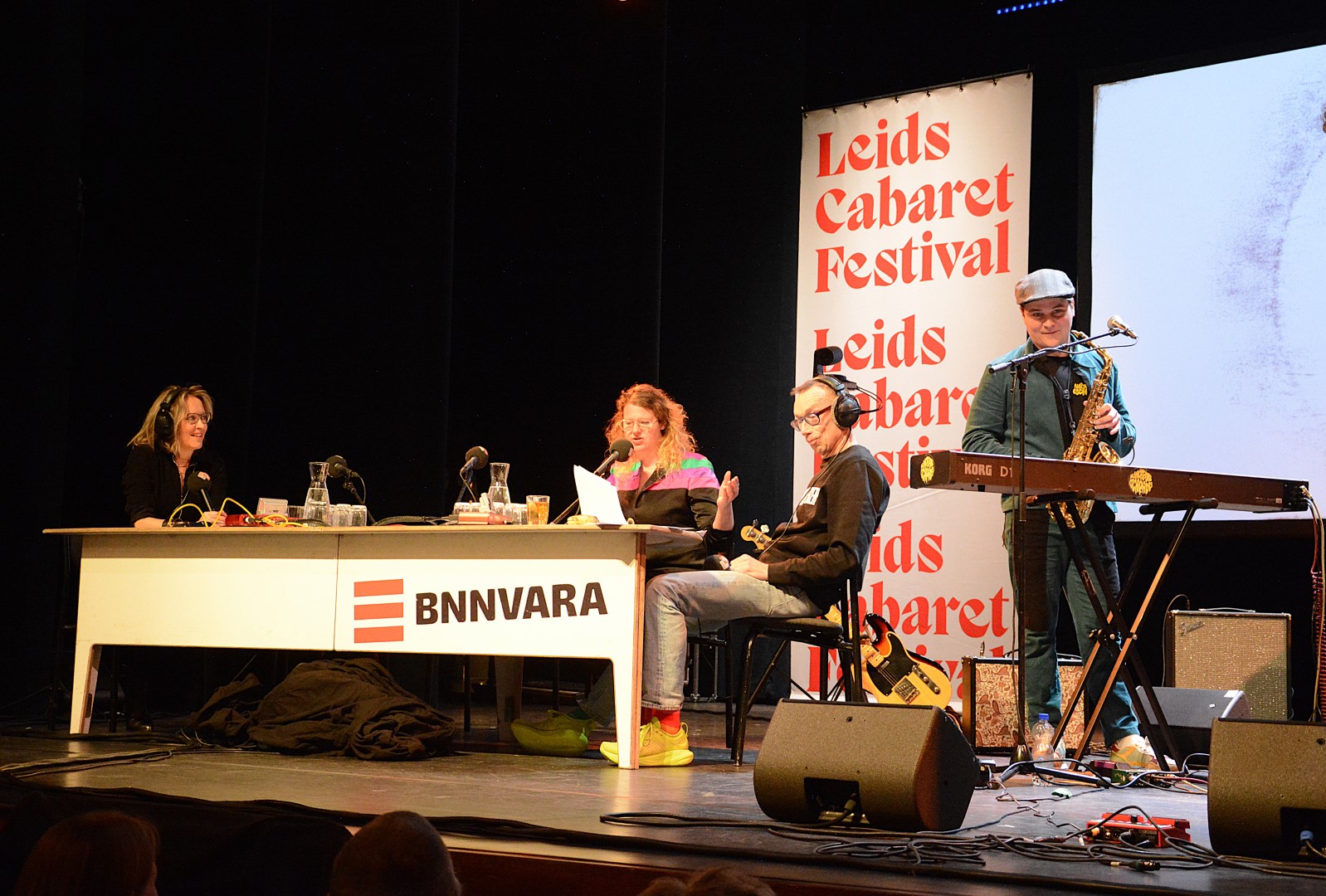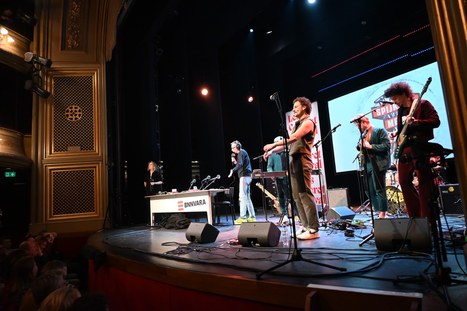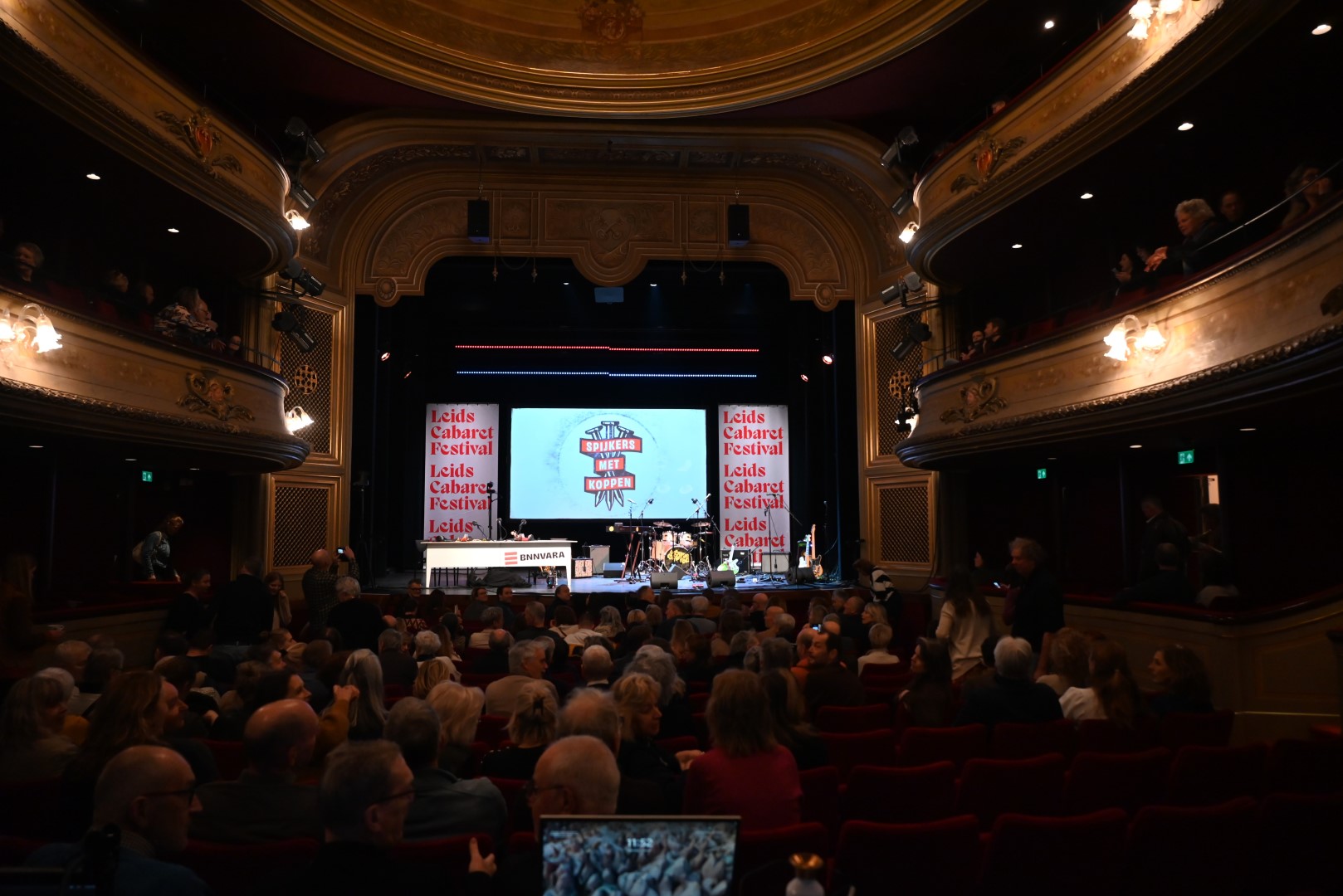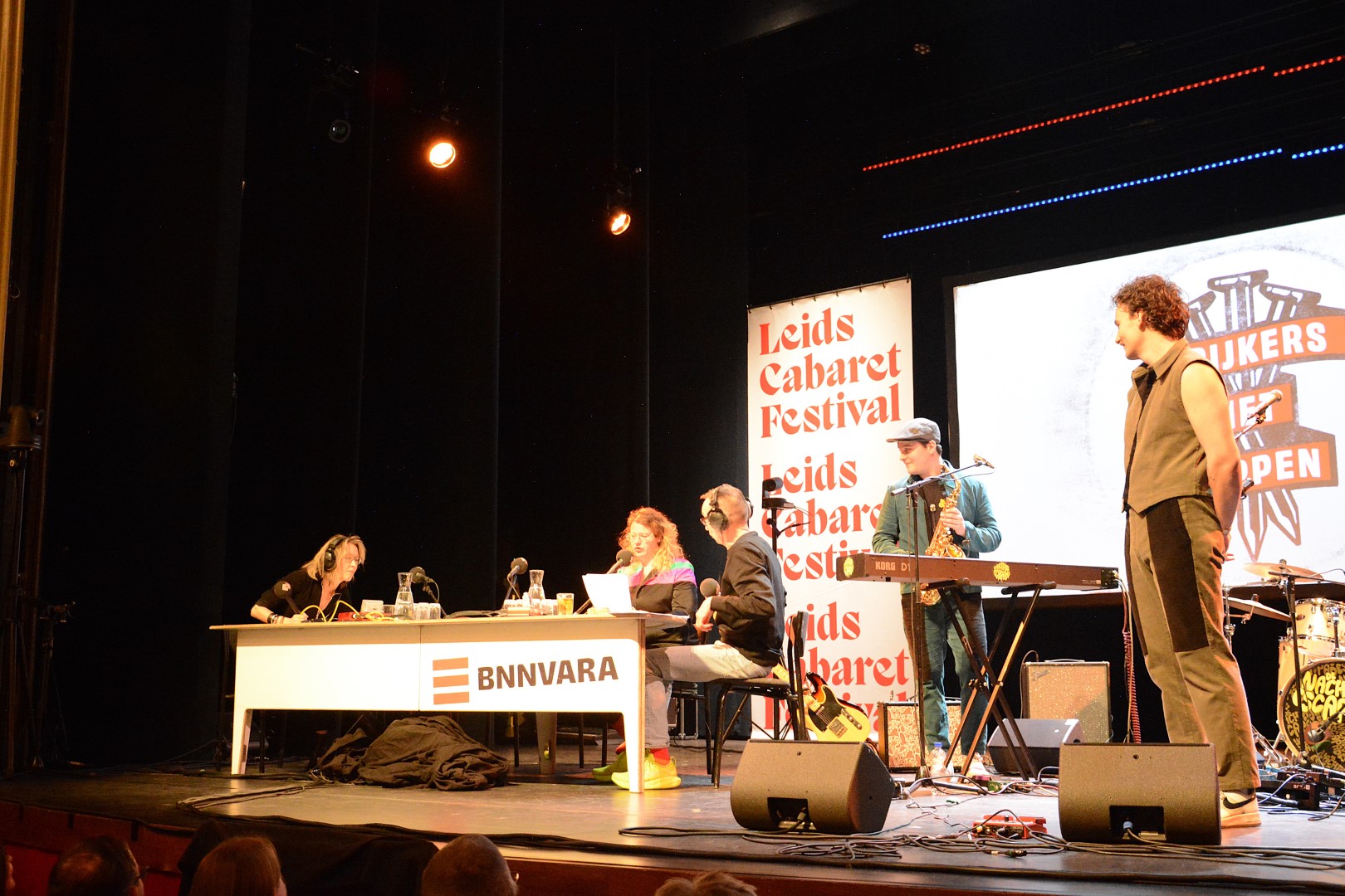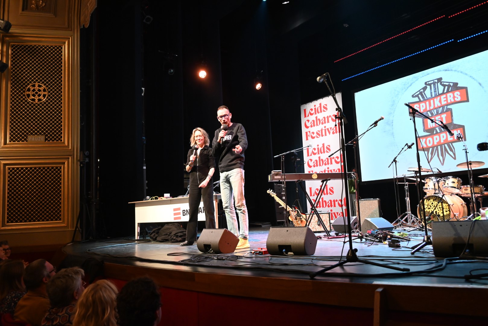 Ondertussen traditioneel komt het satirische BNNVARA radioprogramma ‘Spijkers met Koppen’ op de finaledag van het Leids Cabaret Festival vanuit de Leidse Schouwburg. Dat was afgelopen zaterdag niet anders. Presentatoren Willemijn Veenhove en Dolf Jansen hadden er in de vijf minuten voor aanvang geen moeite mee de zaal met een paar goeie grappen in de juiste stemming te brengen zodat er klokslag 12.00 uur een razend enthousiast publiek in de zaal zat.