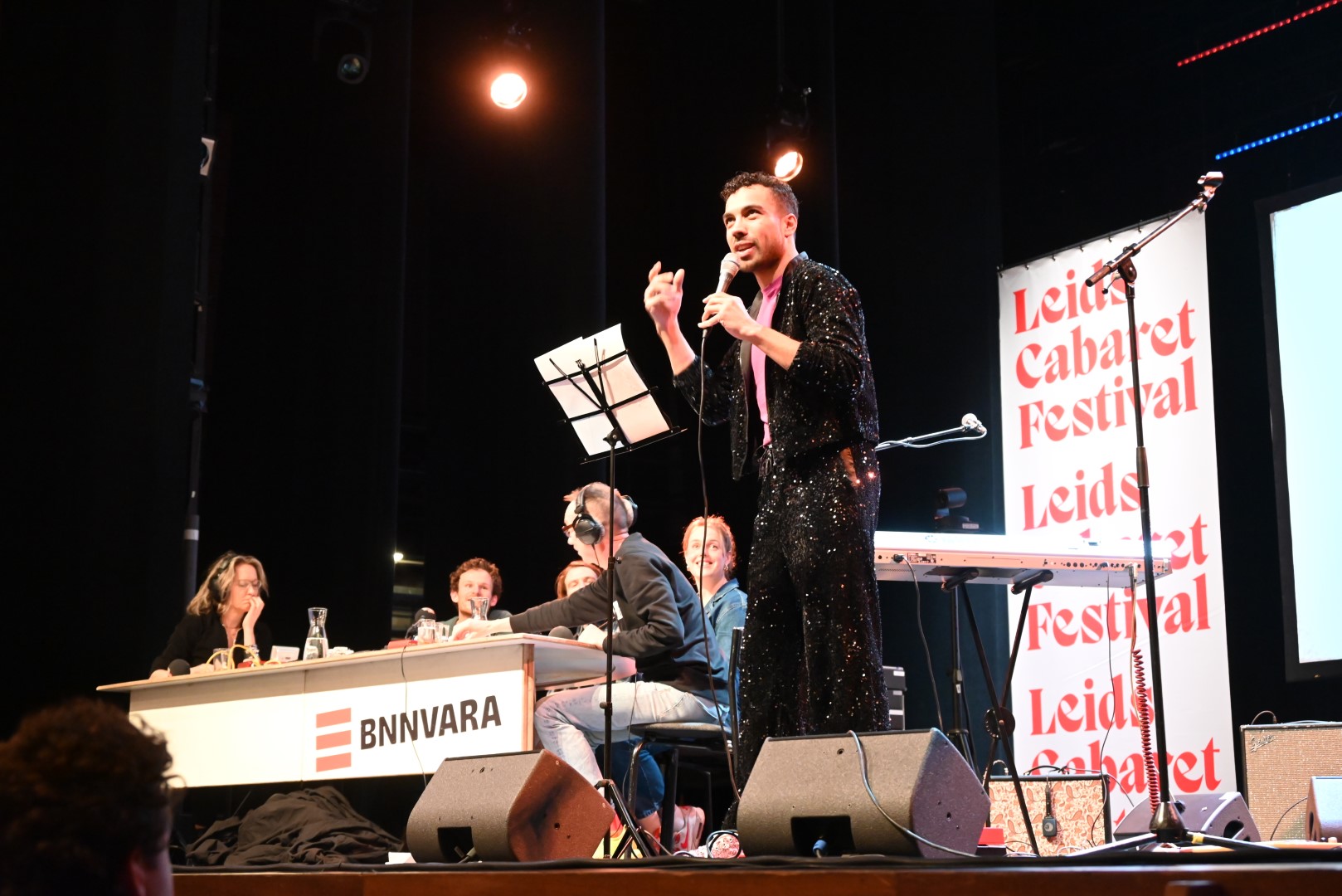 De finalisten van het Leids Cabaret Festival sloten het programma af en waren toen nog in spanning wie van hen ’s avonds de winnaar zou gaan worden.