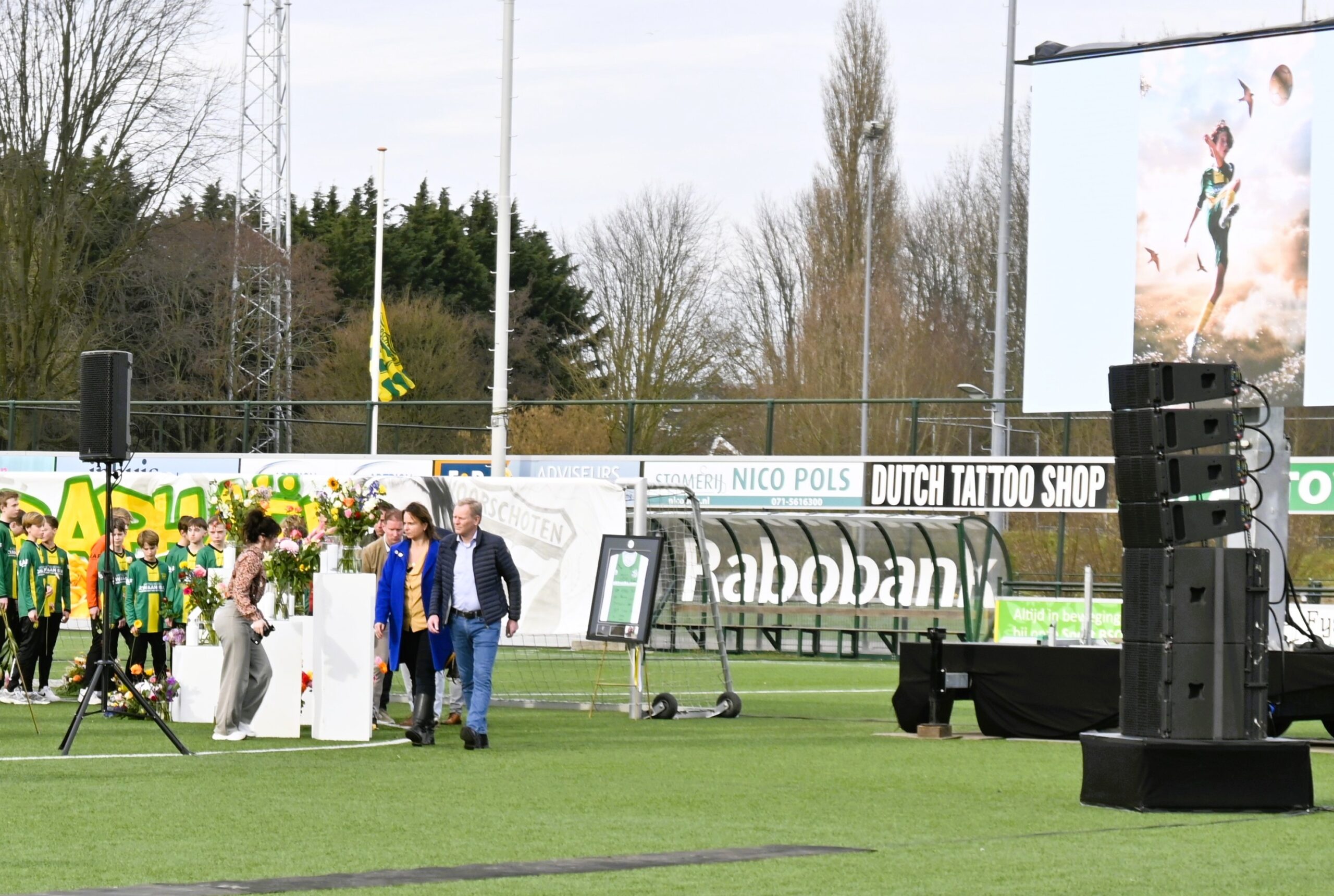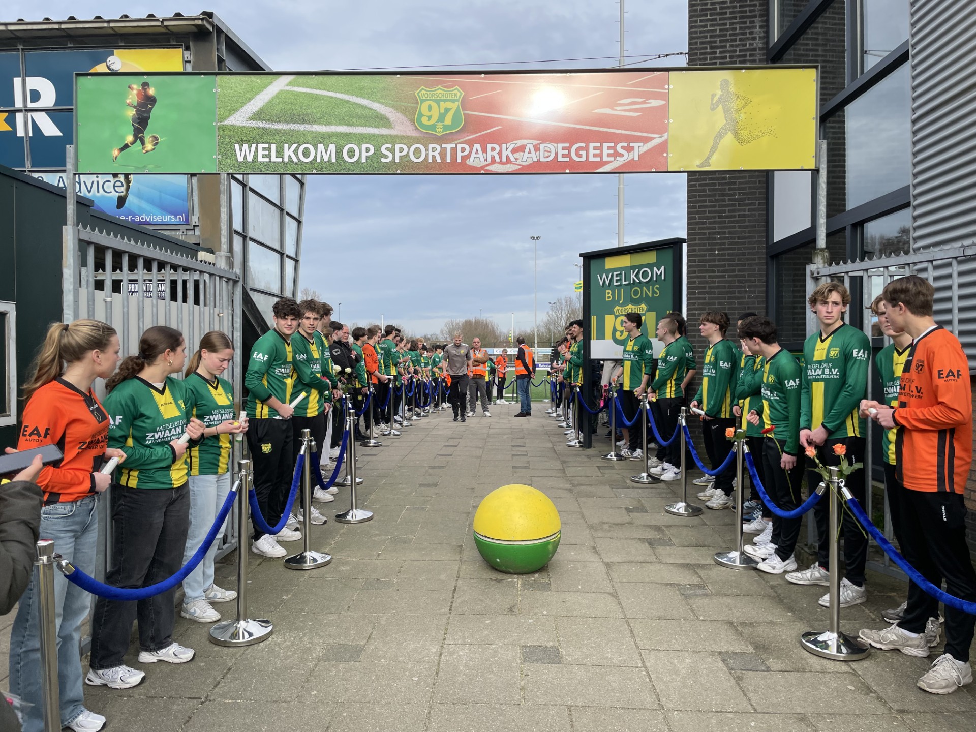 Als eerbetoon schoten twee spelers van SJZ Zoeterwoude aan de ene kant van het veld en twee spelers van Voorschoten’97 aan de andere kant van het veld, een bal in het doel.