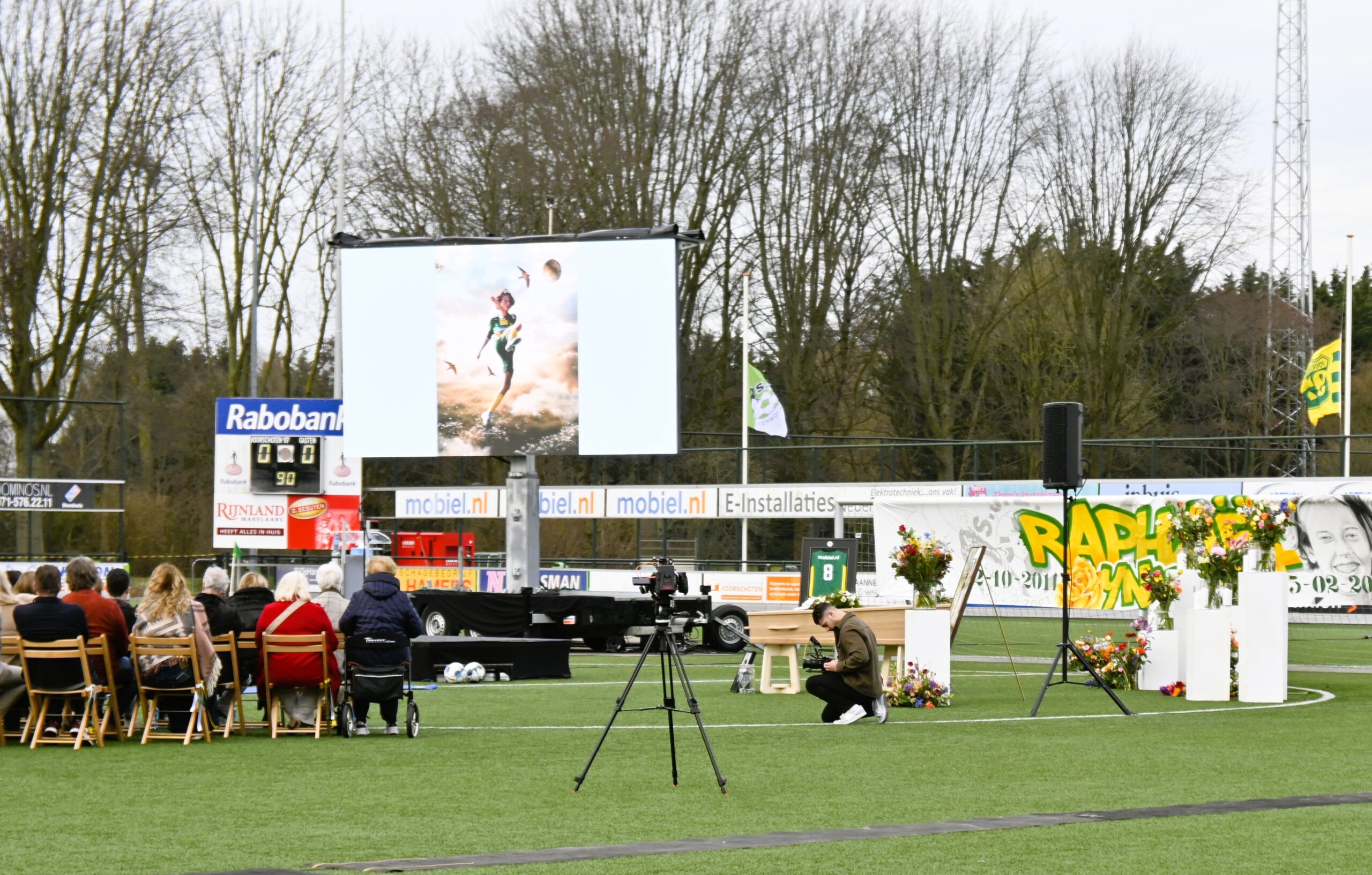 Zo’n 1.500 mensen waren aanwezig bij het afscheid. De kist van Raphael werd binnengeleid door zijn teammaten met groengele fakkels, gevolgd door alle aanwezigen die een bloem bij de kist mochten leggen. Het is muisstil op het veld, het verdriet is groot. Op schermen worden foto’s en filmpjes van de speler uit Zoeterwoude getoond.