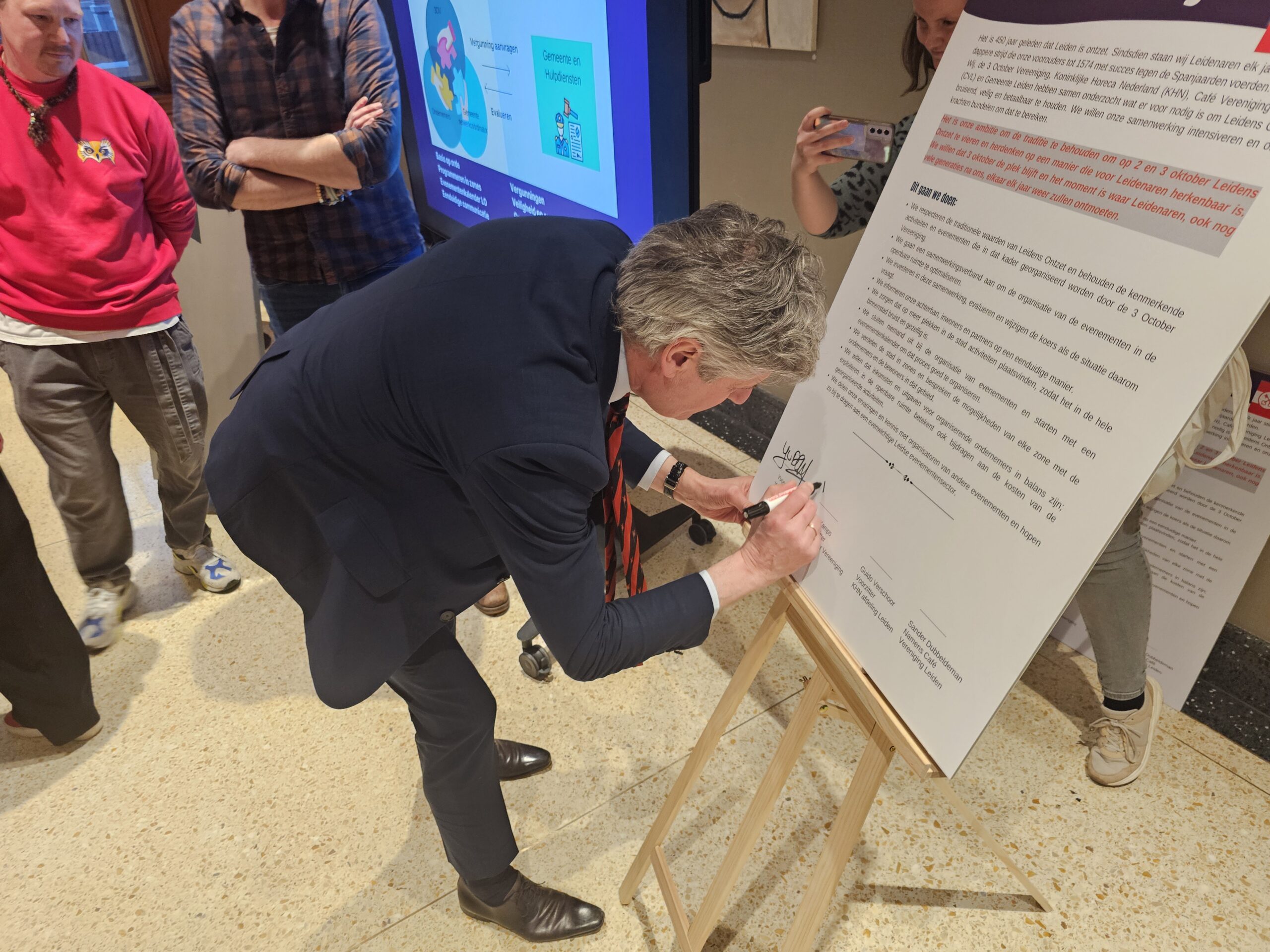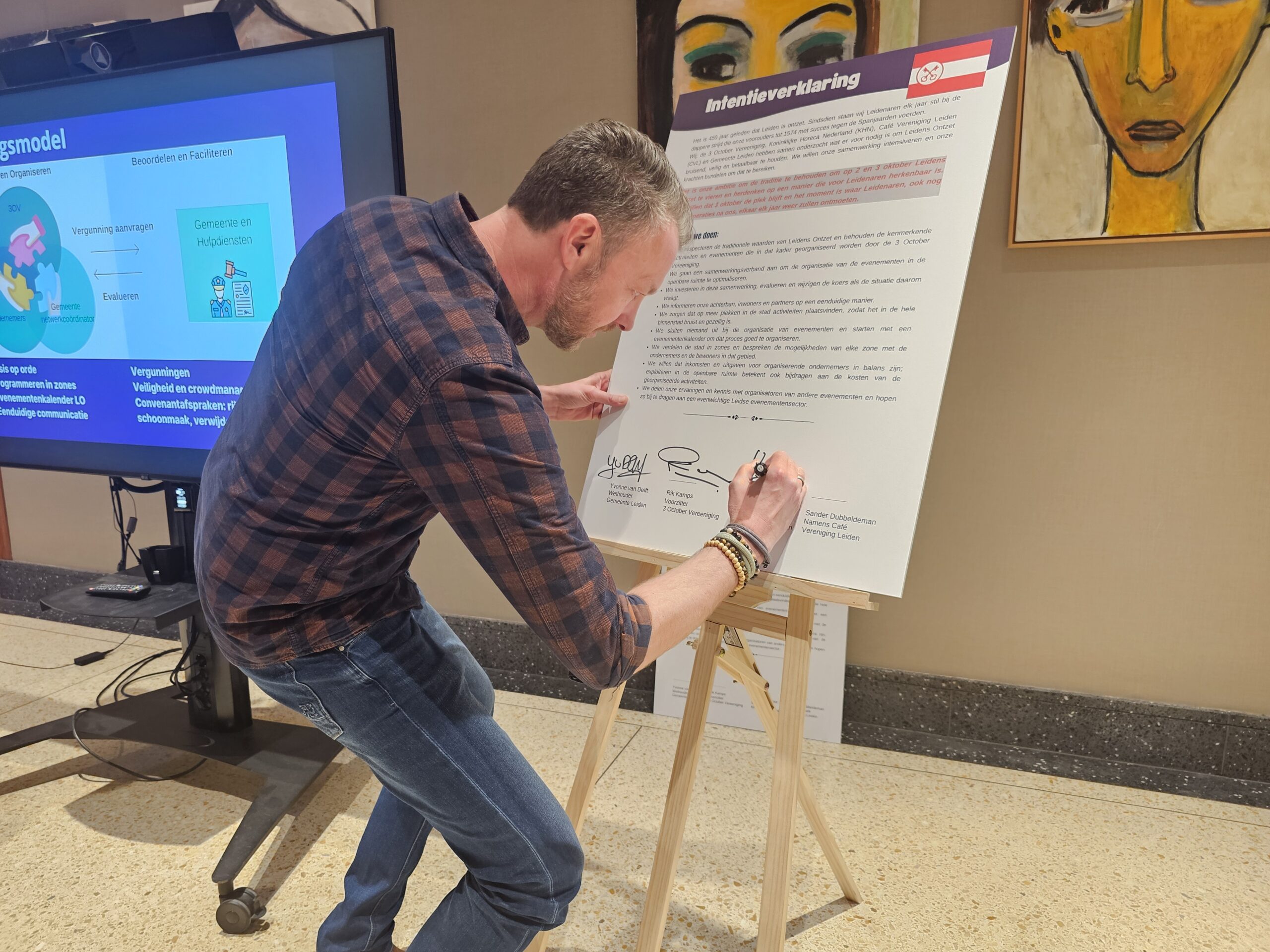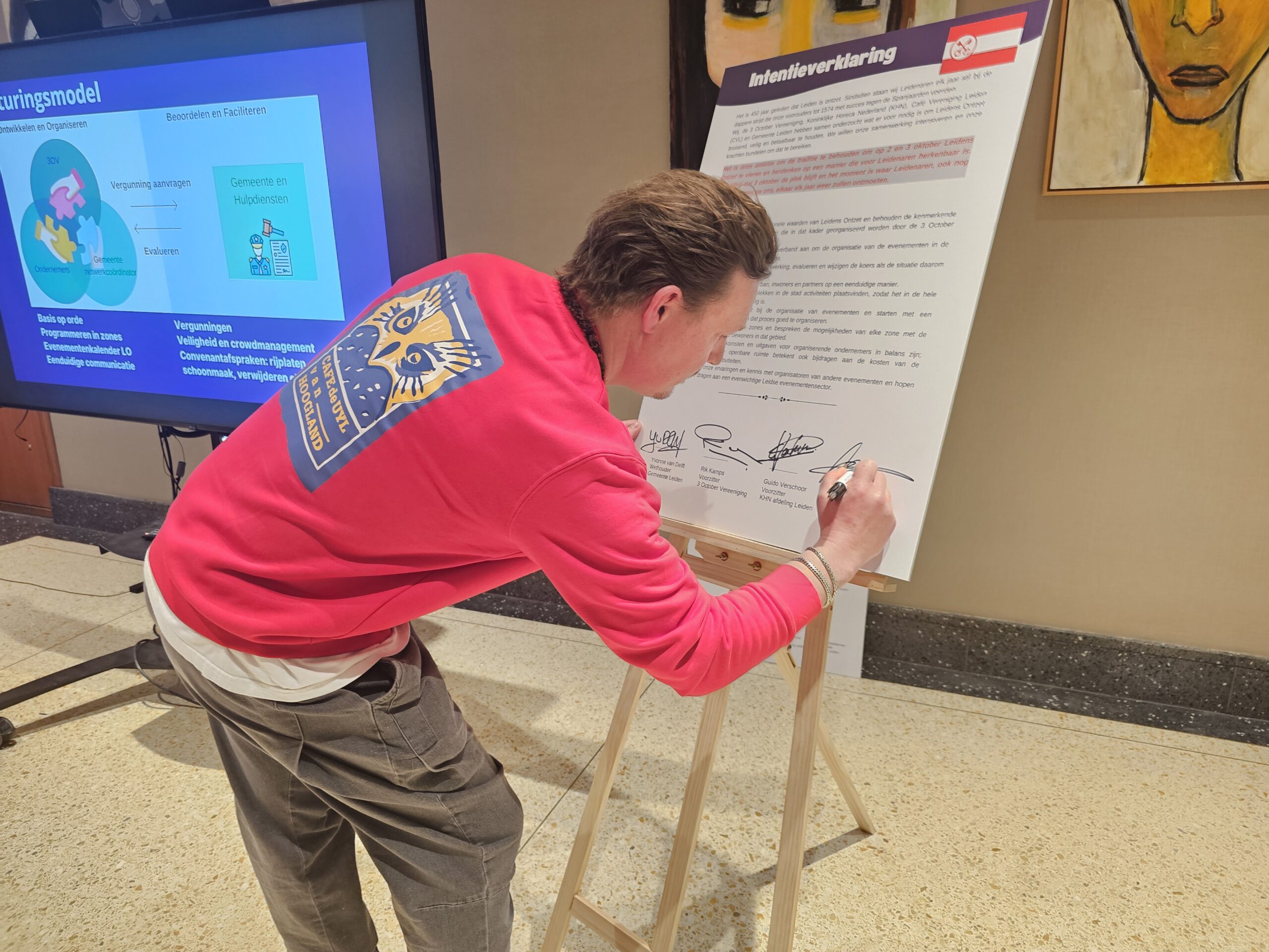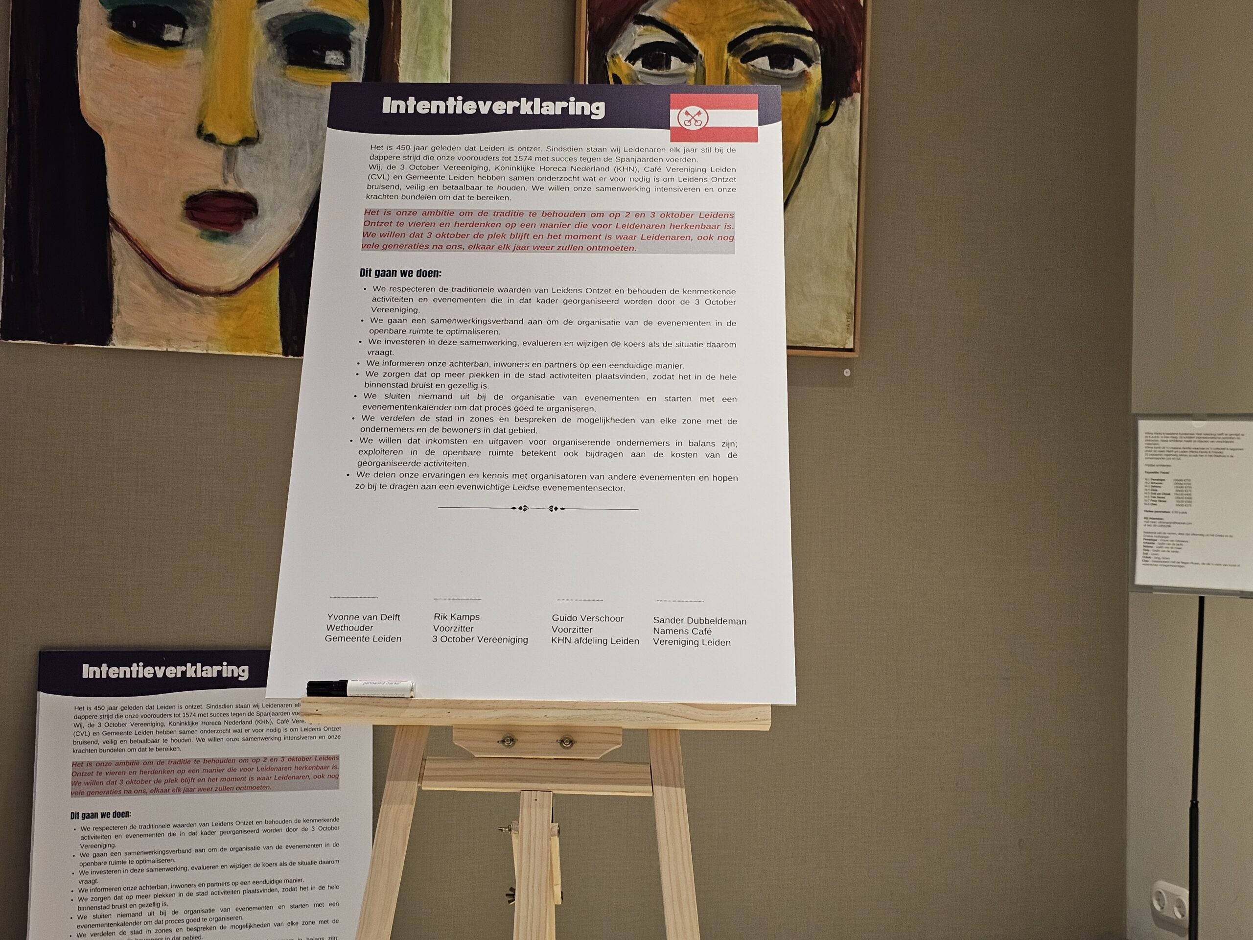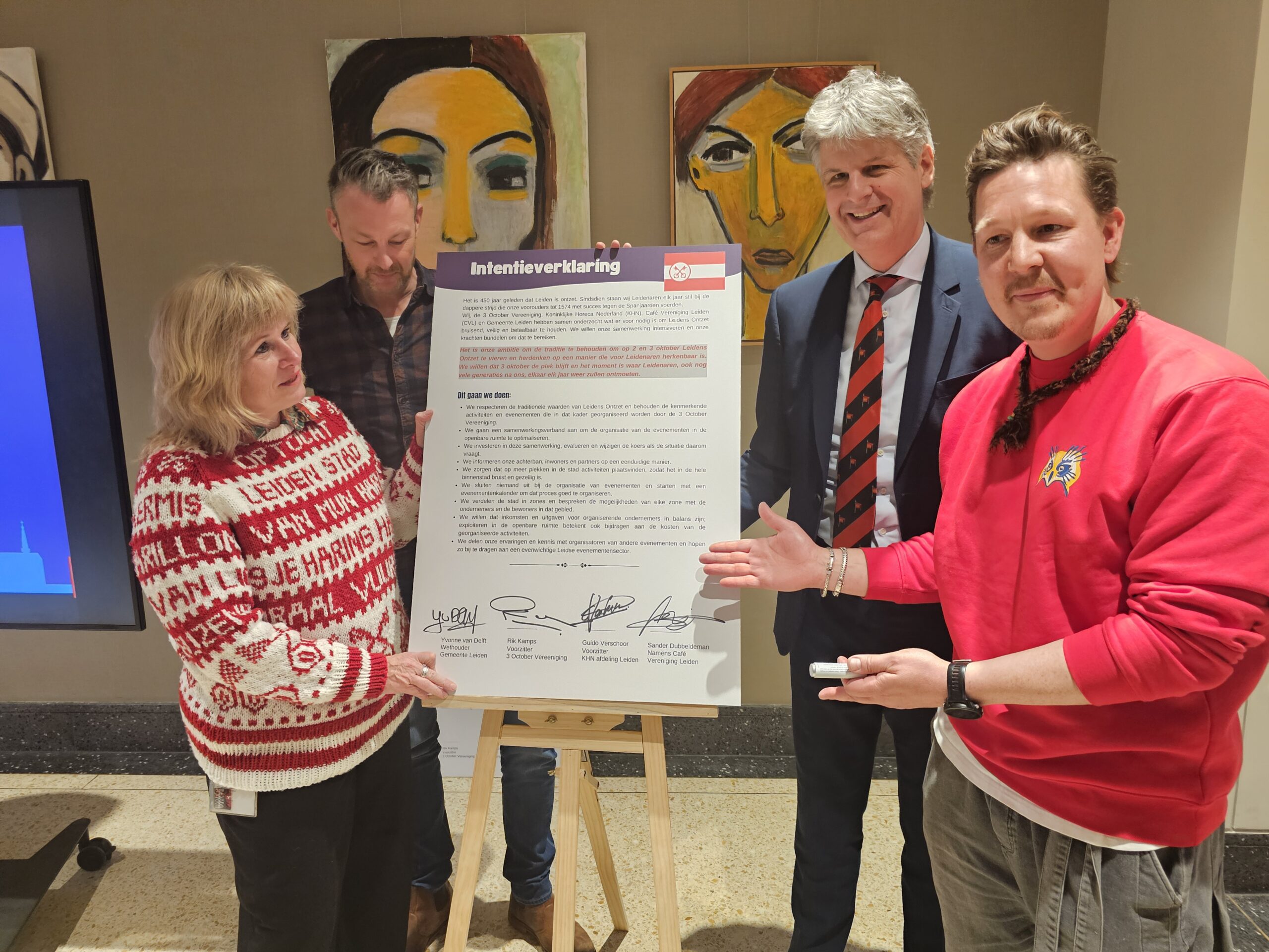 Op 10 maart werd de intentieovereenkomst feestelijk ondertekend. De gekozen datum was geen toeval: omgedraaid verwijst 10/03 naar 3 oktober, een knipoog naar de viering. Dit symboliseert ook de kern van de gemaakte afspraken: de vier partijen willen het feest toekomstbestendig houden en belangrijke tradities van zowel de viering als de herdenking behouden.