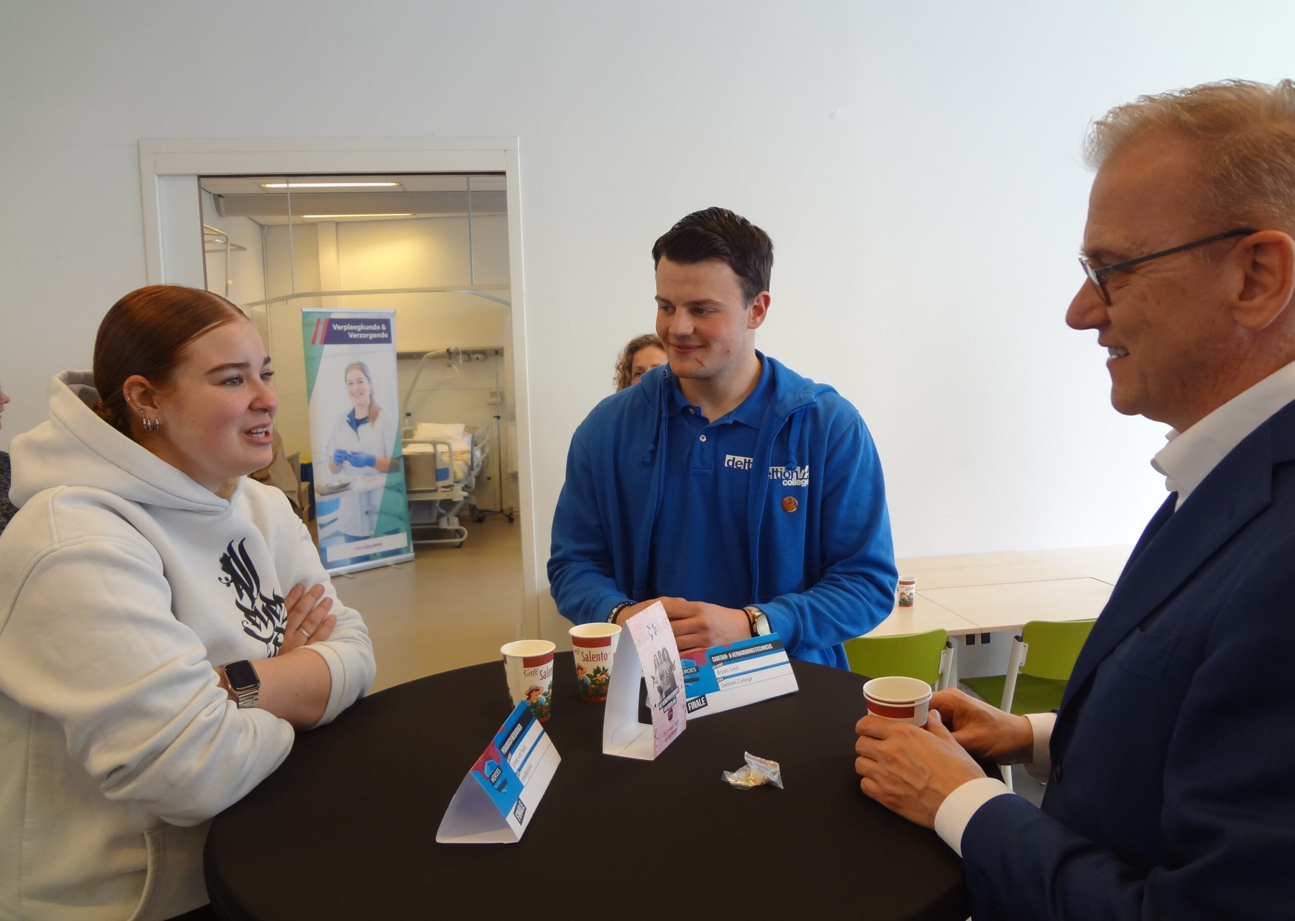 Lisa van der Burg en Esmee van Twist waren finalisten die vanuit mboRijnland in gesprek gingen met de minister. Saskia Schenning (mboRijnland) en Erik van der Zwan (WorldSkills Netherlands) heetten de minister en de finalisten van harte welkom. Aansluitend gaf Lisa (opleiding Verpleegkundige), die ook nog eens jarig was, eerst een demonstratie van een medische handeling en beantwoordde vragen van de minister. Daarna ging de minister met iedere finalist even in gesprek. Lisa vond het leuk om met de minister in gesprek te gaan. “Hij was erg geïnteresseerd. Ik heb veel zin in de finales, maar ik heb alleen niet superveel extra kunnen oefenen, omdat ik ook druk ben met mijn examens, maar dat is natuurlijk ook oefenen.”