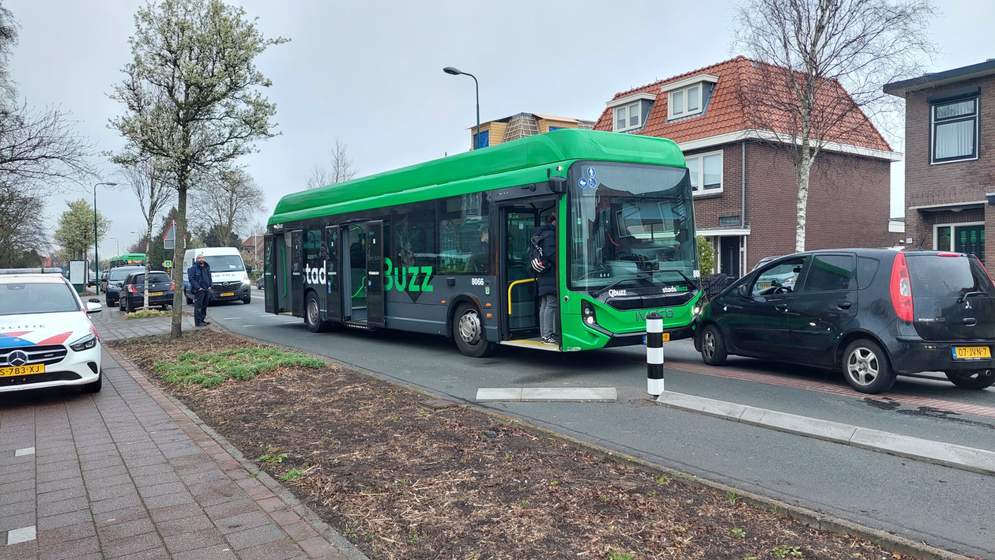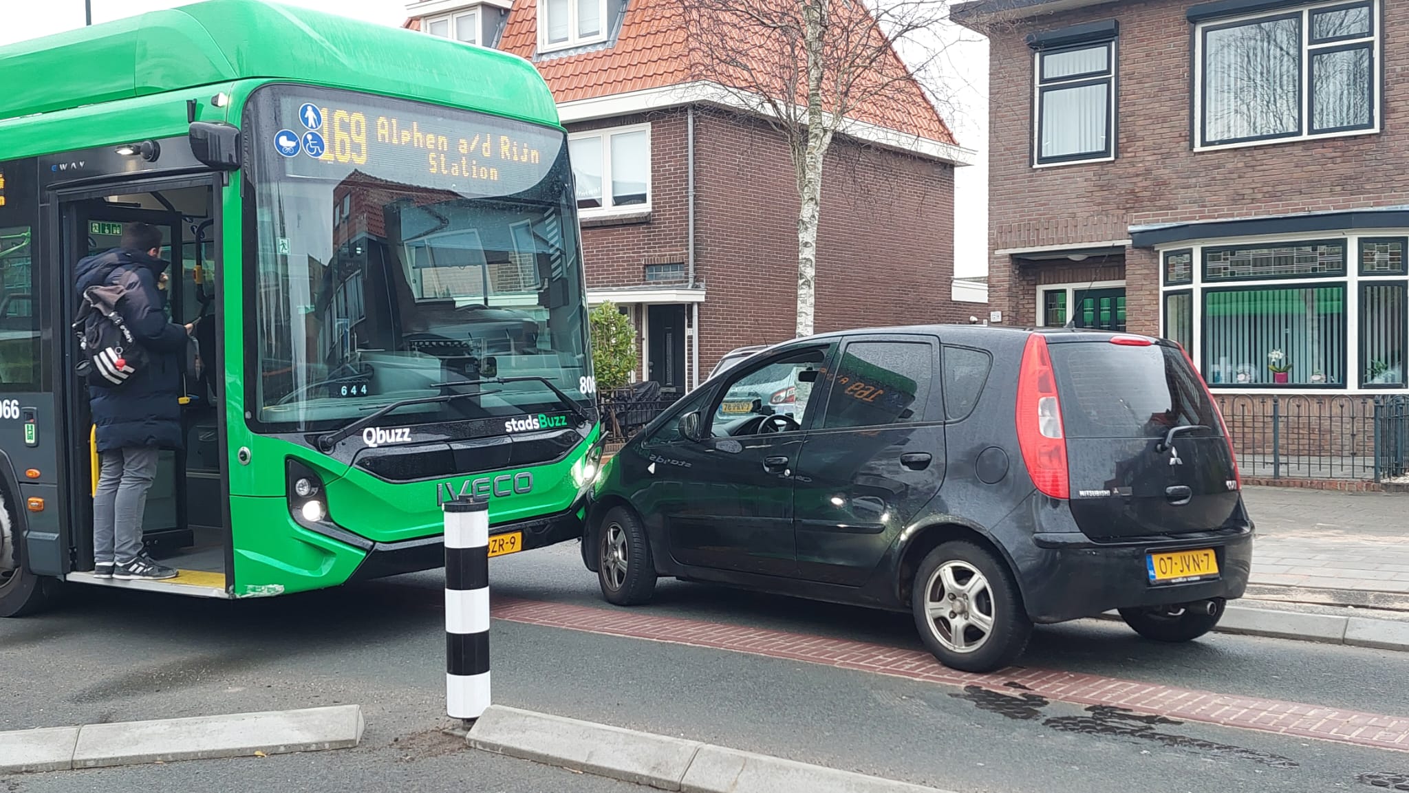 Bij een botsing tussen een stadsbus van Qbuzz en een personenauto is rond 17.30 uur alleen materiële schade ontstaan. De bus en de auto botsen op elkaar bij de nieuwe wegversmalling op de Hoge Rijndijk in Zoeterwoude-Rijndijk. Niemand raakte gewond. De passagiers van de bus werden door medewerkers van Qbuzz naar een andere bus geleid.
