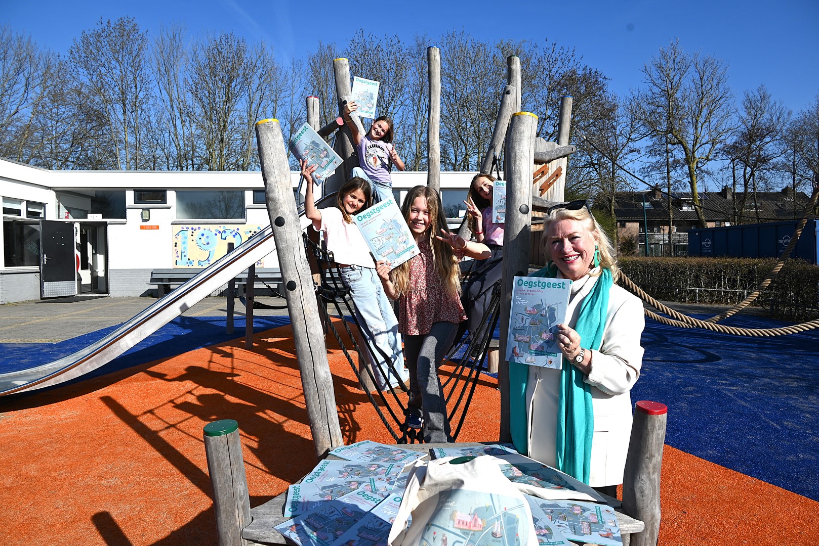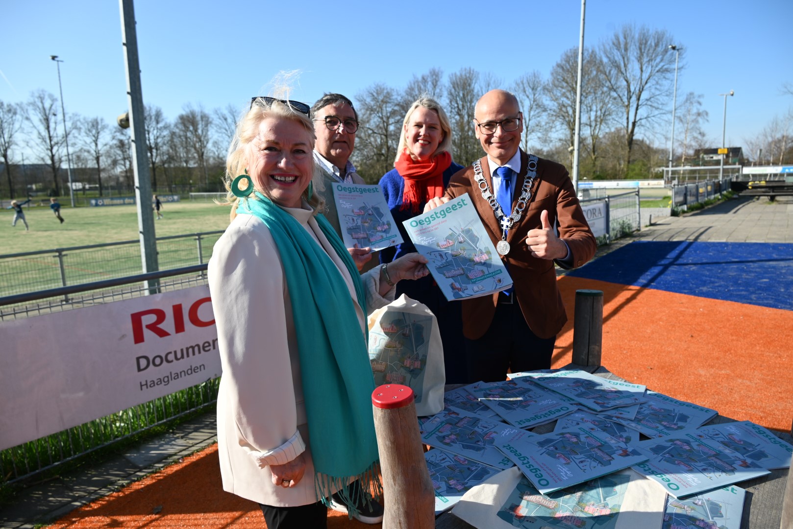 Donderdagmiddag heeft dorpsmarketeer Marjolijn van der Jagt namens Dorpsmarketing Oegstgeest de eerste drie exemplaren overhandigd aan achtereenvolgens burgemeester Emile Jaensch, illustrator Katrina Stronkhorst die de tekening op de cover maakte en Paul Klinkhamer. Die laatste is een zeer betrokken vrijwilliger van Christelijke Korfbalvereniging Fiks. Leden van de vereniging gaan het magazine verspreiden. In ruil daarvoor krijgt de club een financiële bijdrage.