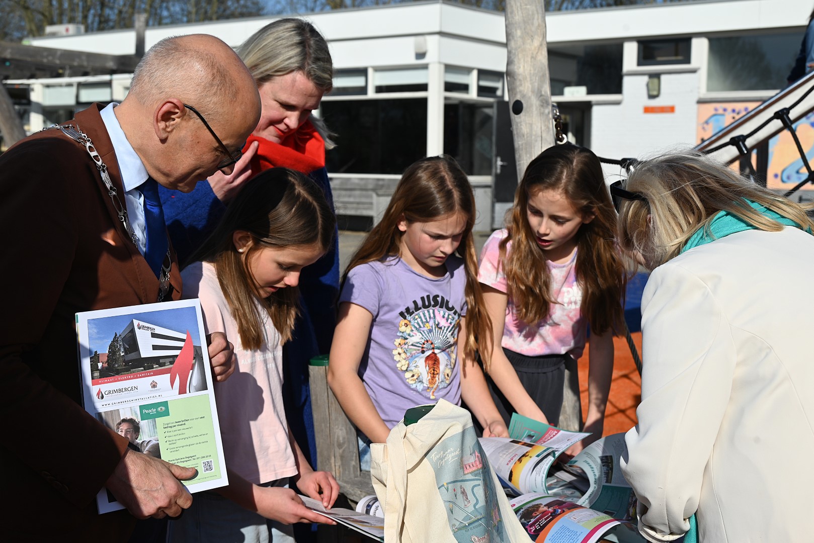 Dinand de La Rie in gesprek met dorpsmarketeer Marjolein van der Jagt, burgemeester Emile Jaensch en illustrator Katrina Stronkhorst.