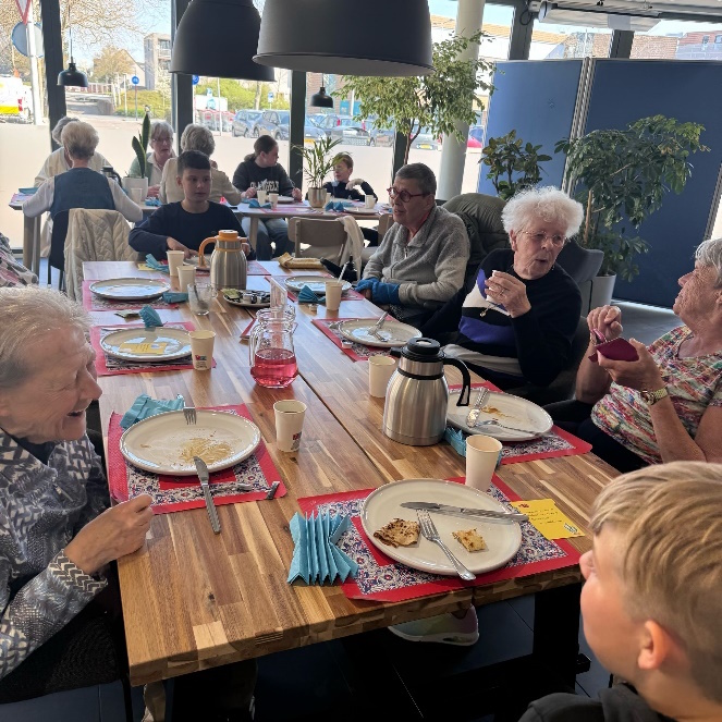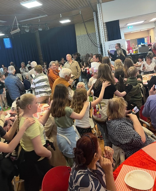 Van iedere groep waren twee leerlingen ingezet voor de bediening. In een lange polonaise liepen de leerlingen door het ‘restaurant’ om het Pannenkoekenlied van Kinderen voor Kinderen te zingen. Aan het eind van het bezoek kregen de opa’s en oma’s nog een kijkje in de klas te kijken. Daarna was het tijd voor de kinderen zelf om zich tegoed te doen aan de pannenkoeken.