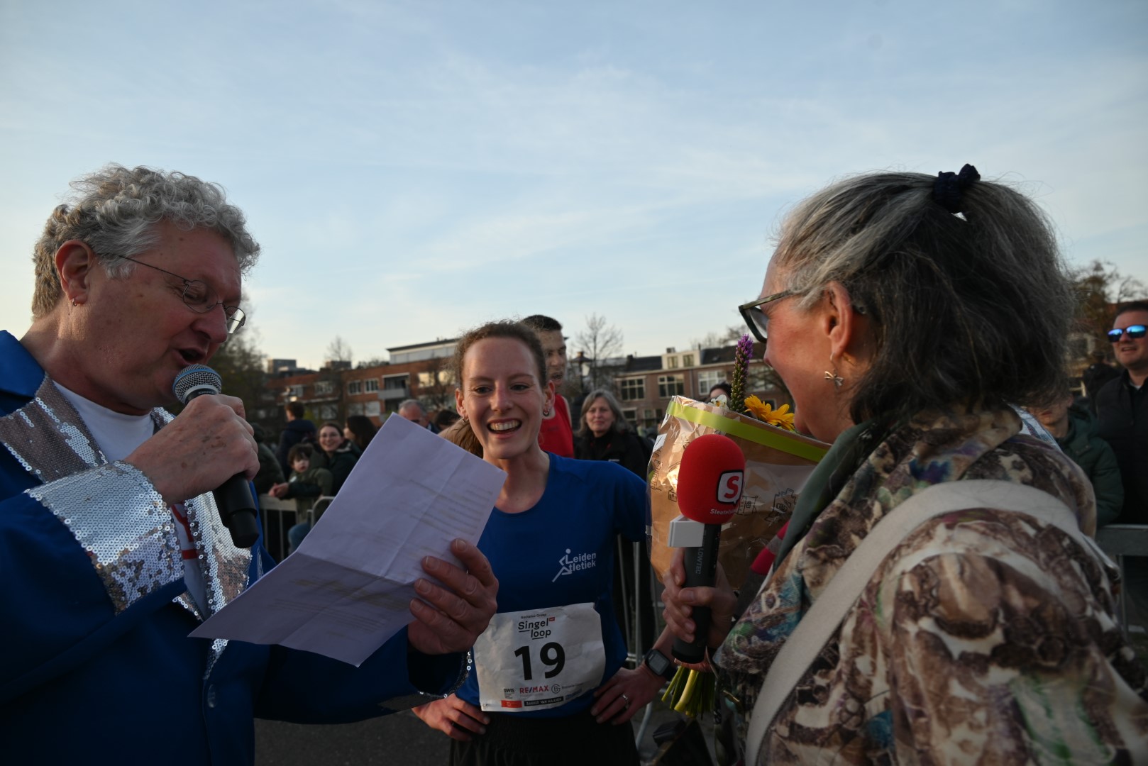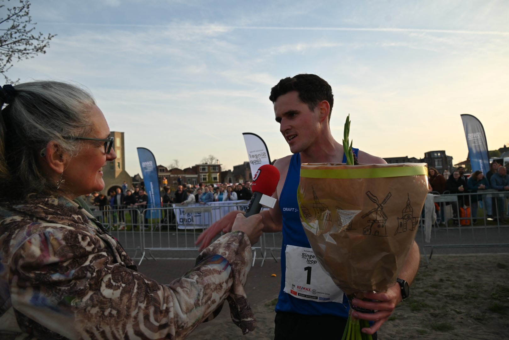 Verslaggeefster Gerry van Bakel sprak met de winnaar, de winnares, de organisator, de burgemeester en deelnemers van de Singelloop 2025.