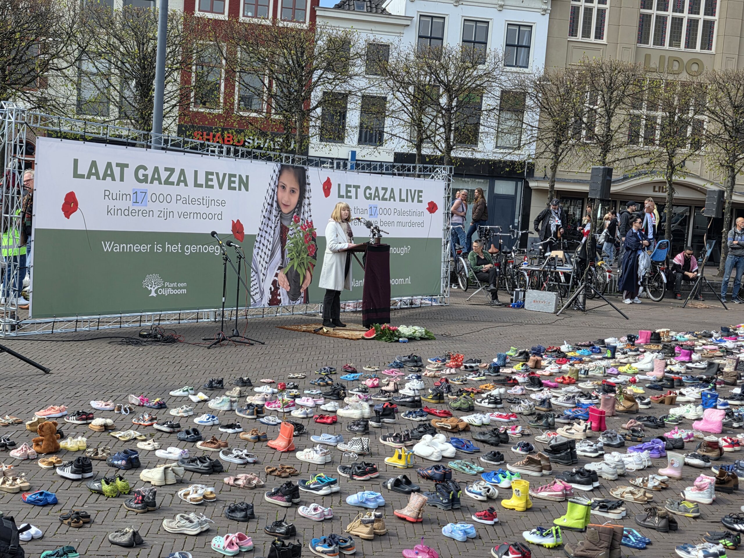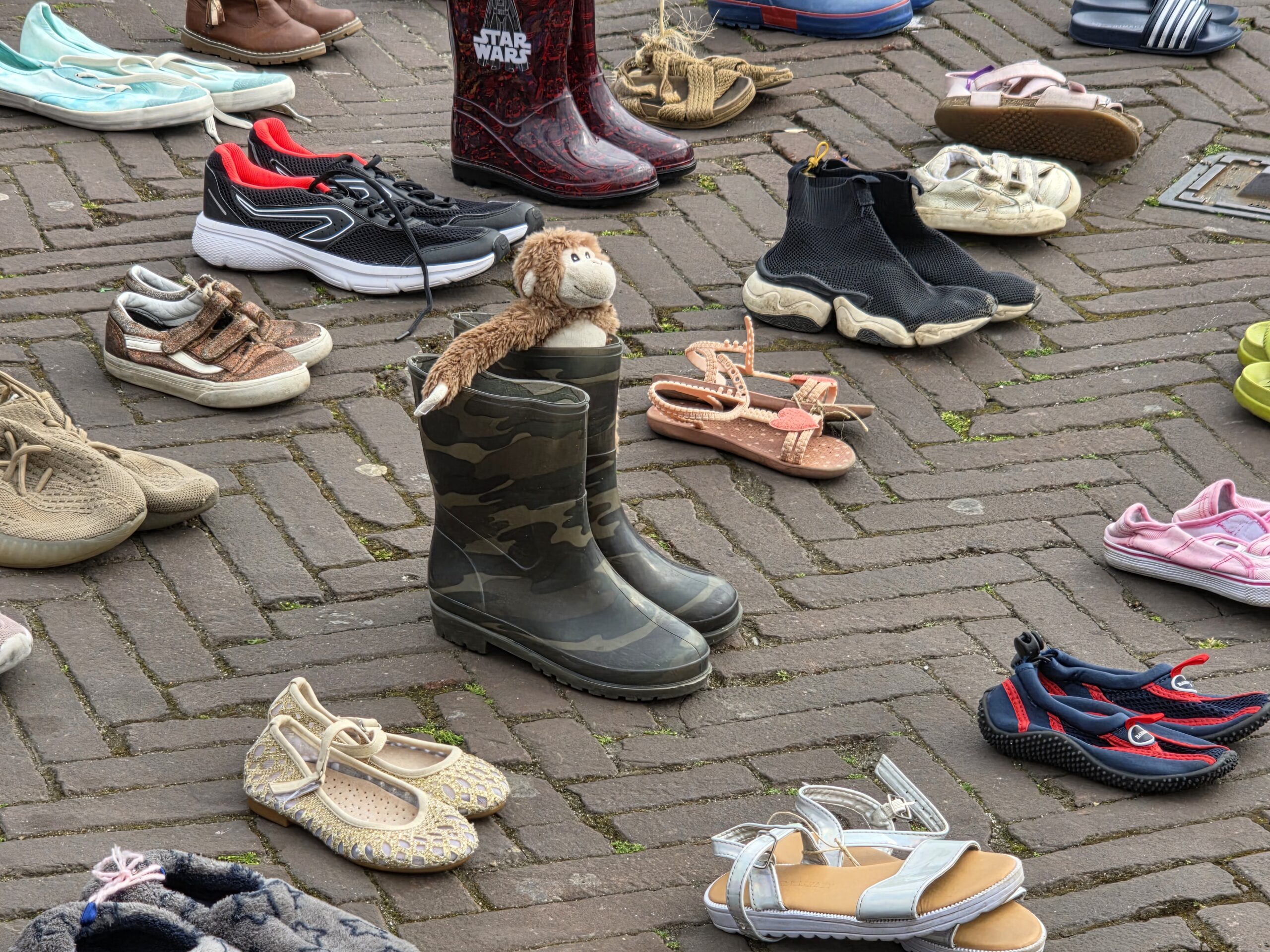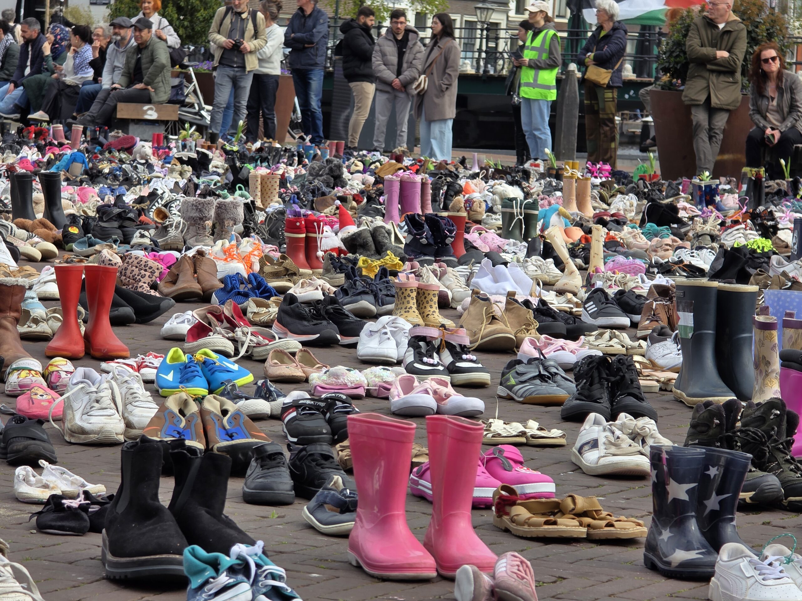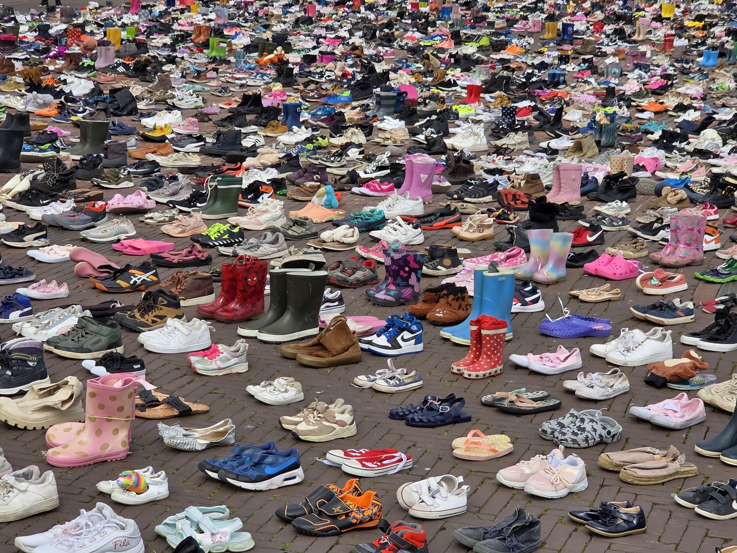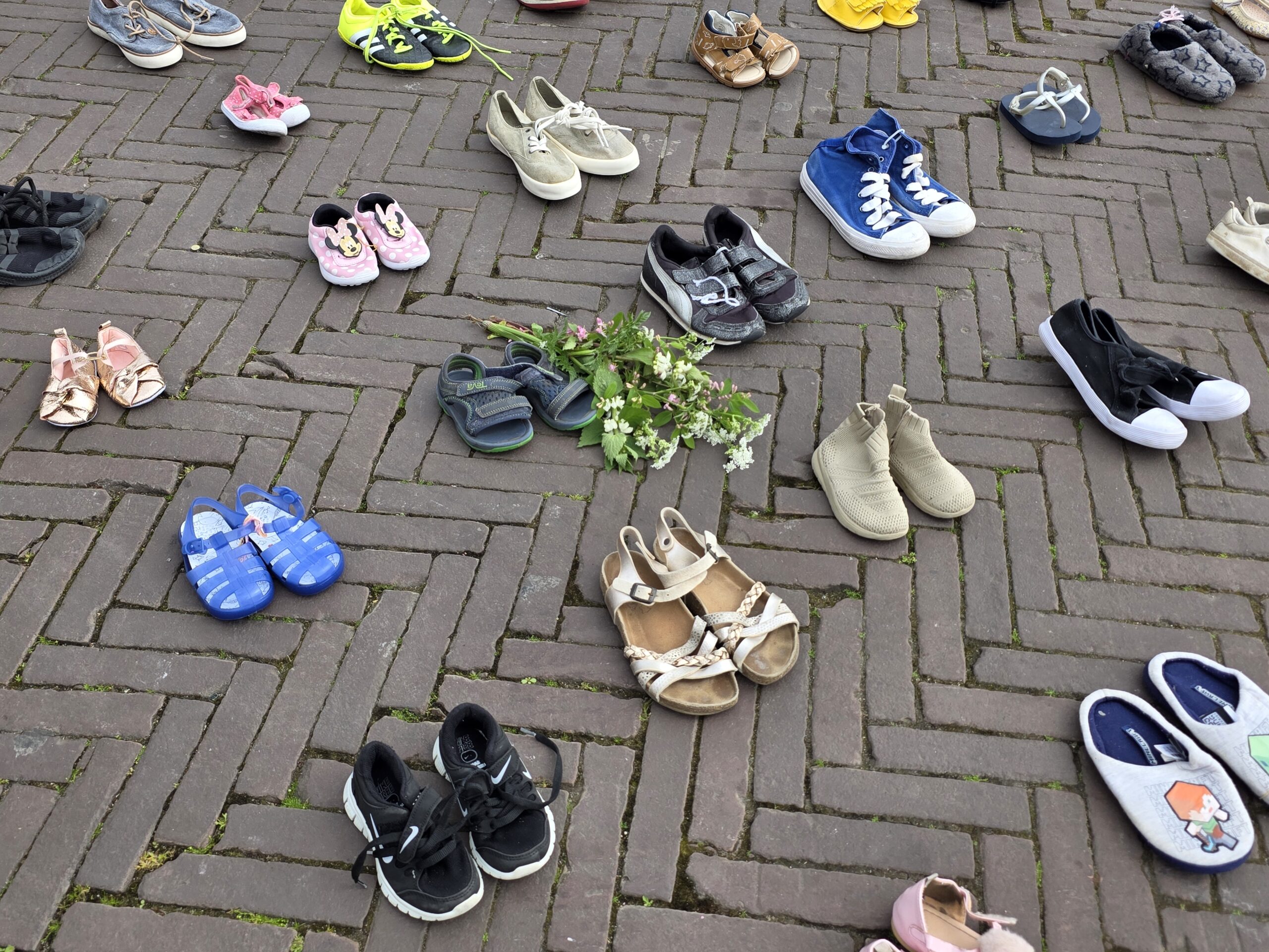 Het plein was gevuld met duizenden kinderschoentjes. Sommige met een knuffel, andere met een bloem. Ook kinderen die met hun ouders bij de manifestatie aanwezig waren, zetten schoentjes neer op het plein.