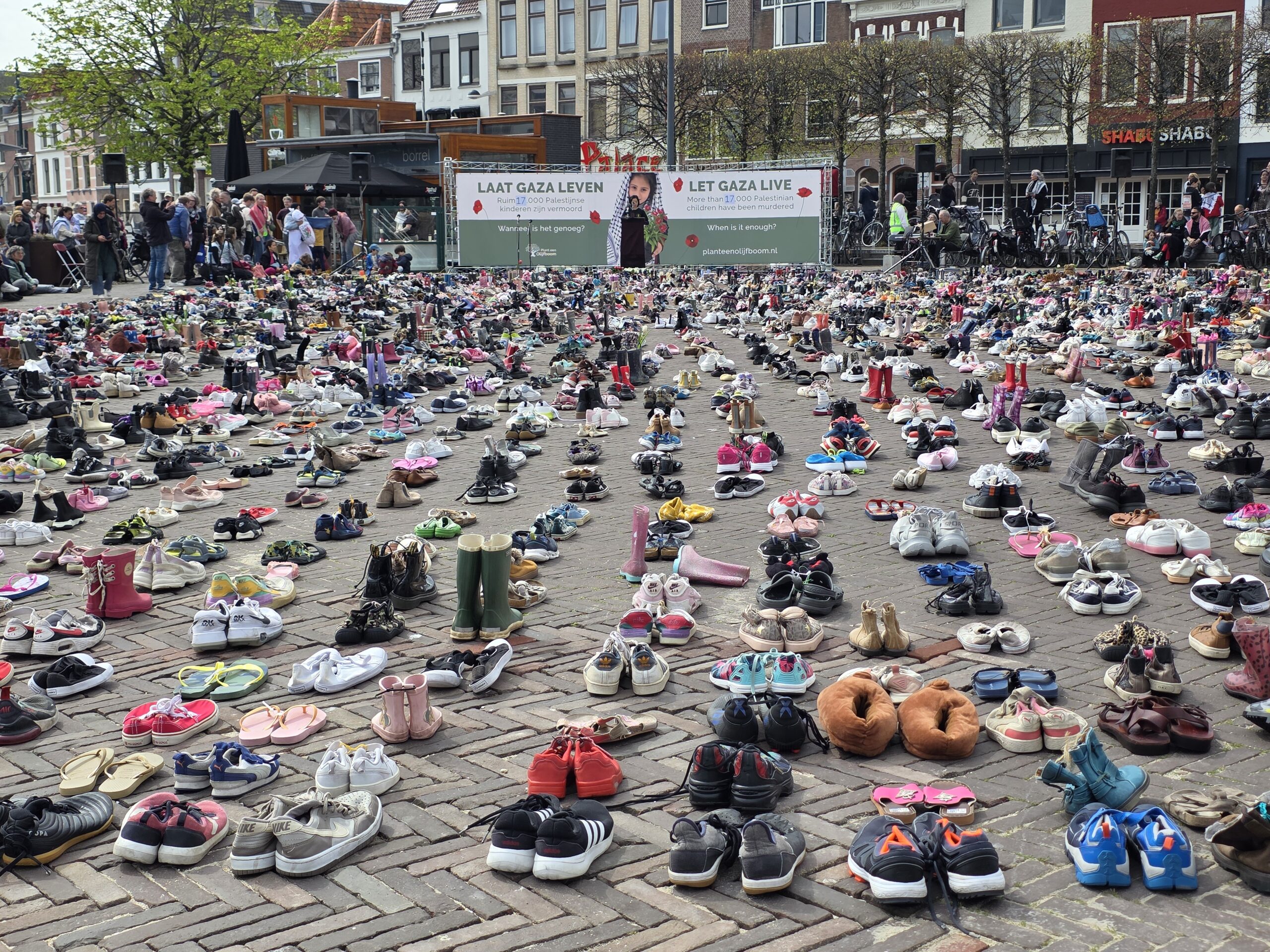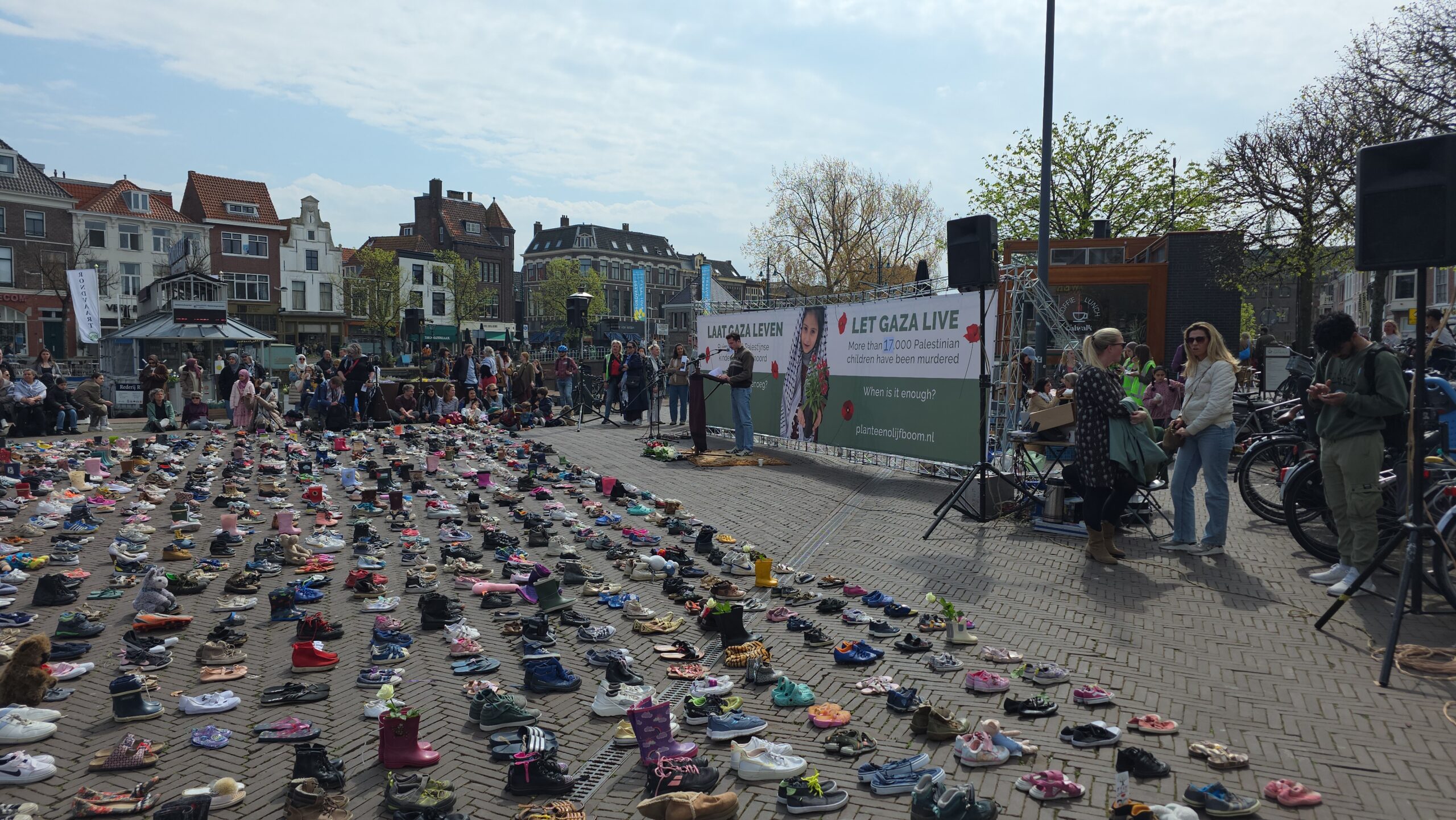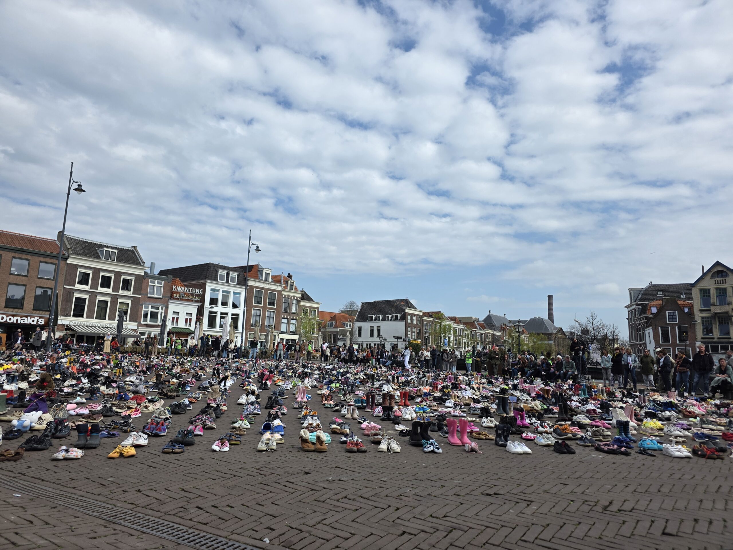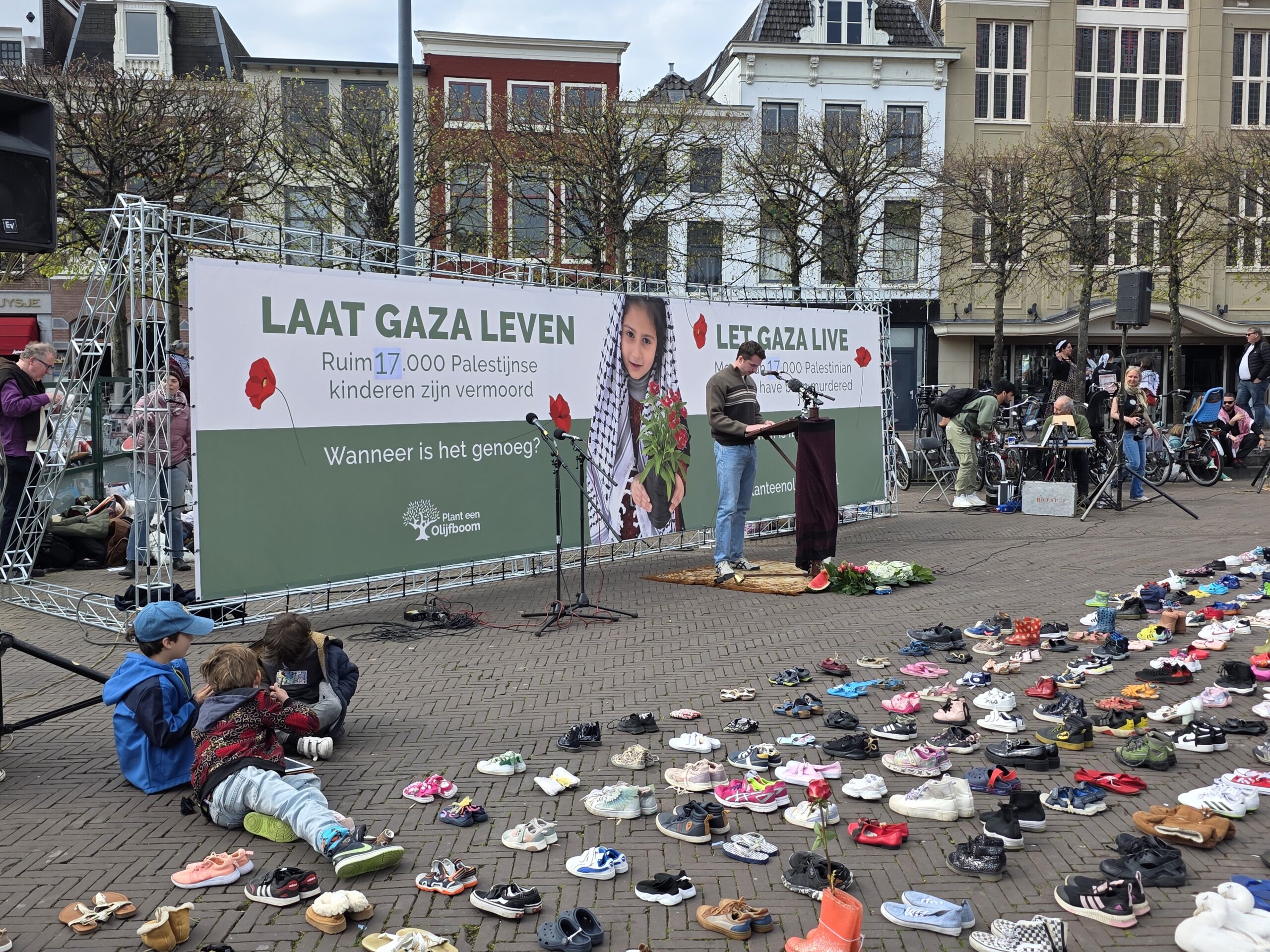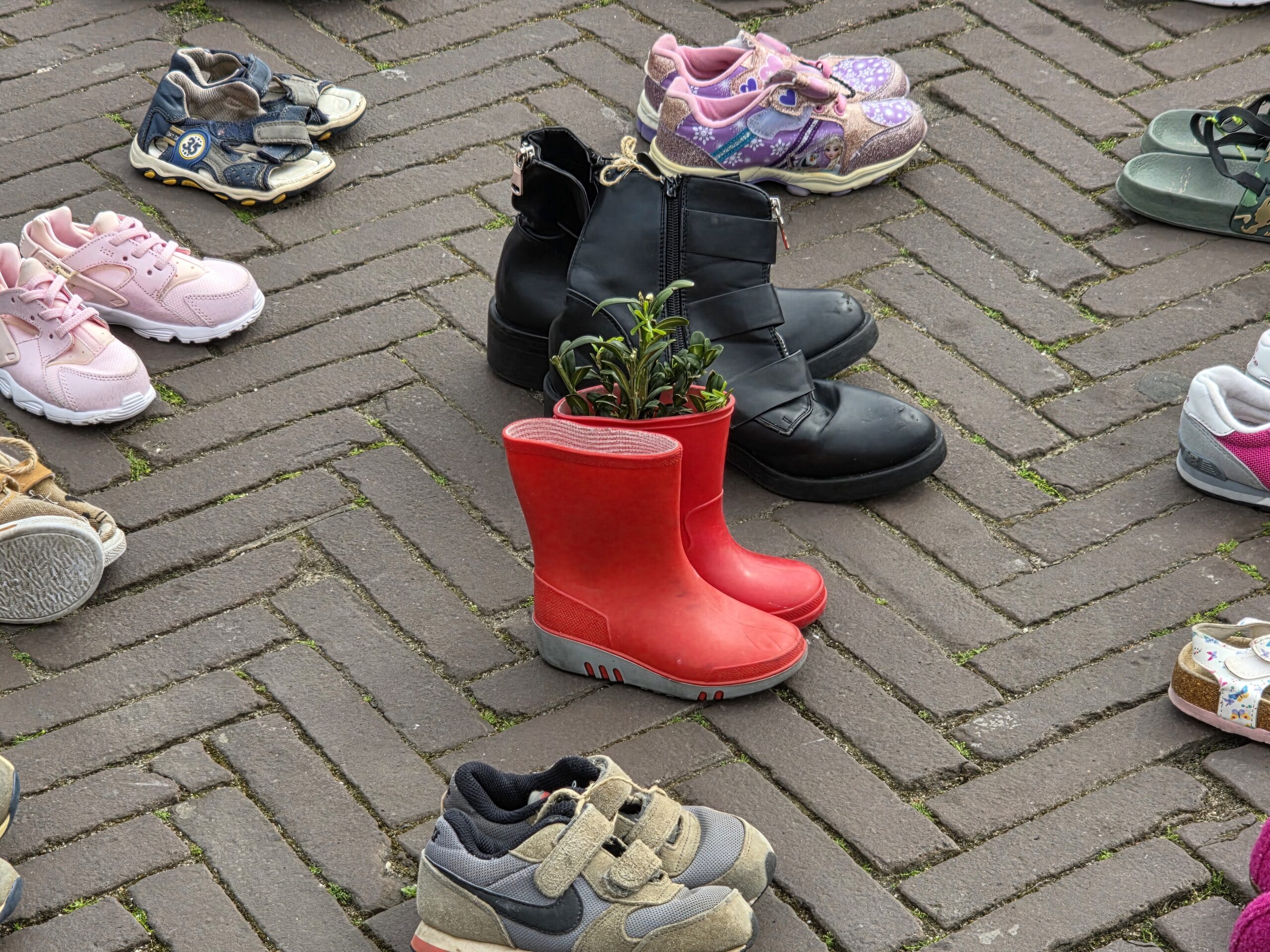 Het plein was gevuld met duizenden kinderschoentjes. Sommige met een knuffel, andere met een bloem. Ook kinderen die met hun ouders bij de manifestatie aanwezig waren, zetten schoentjes neer op het plein.