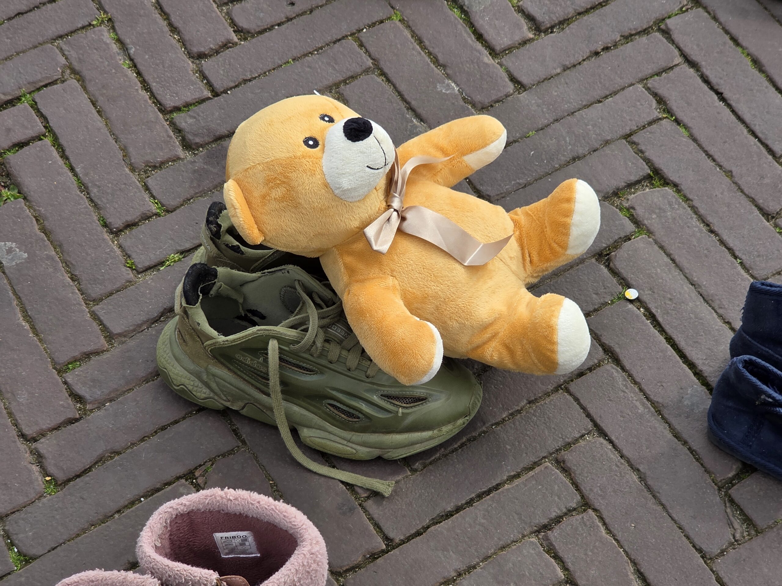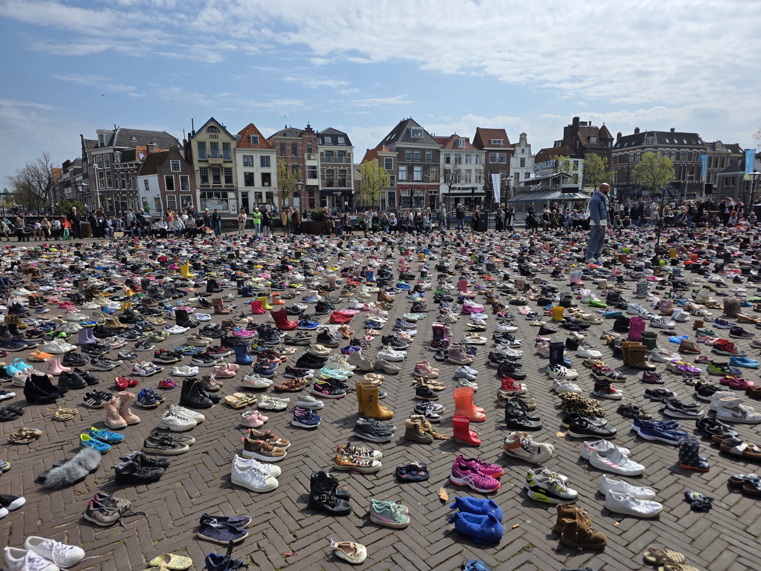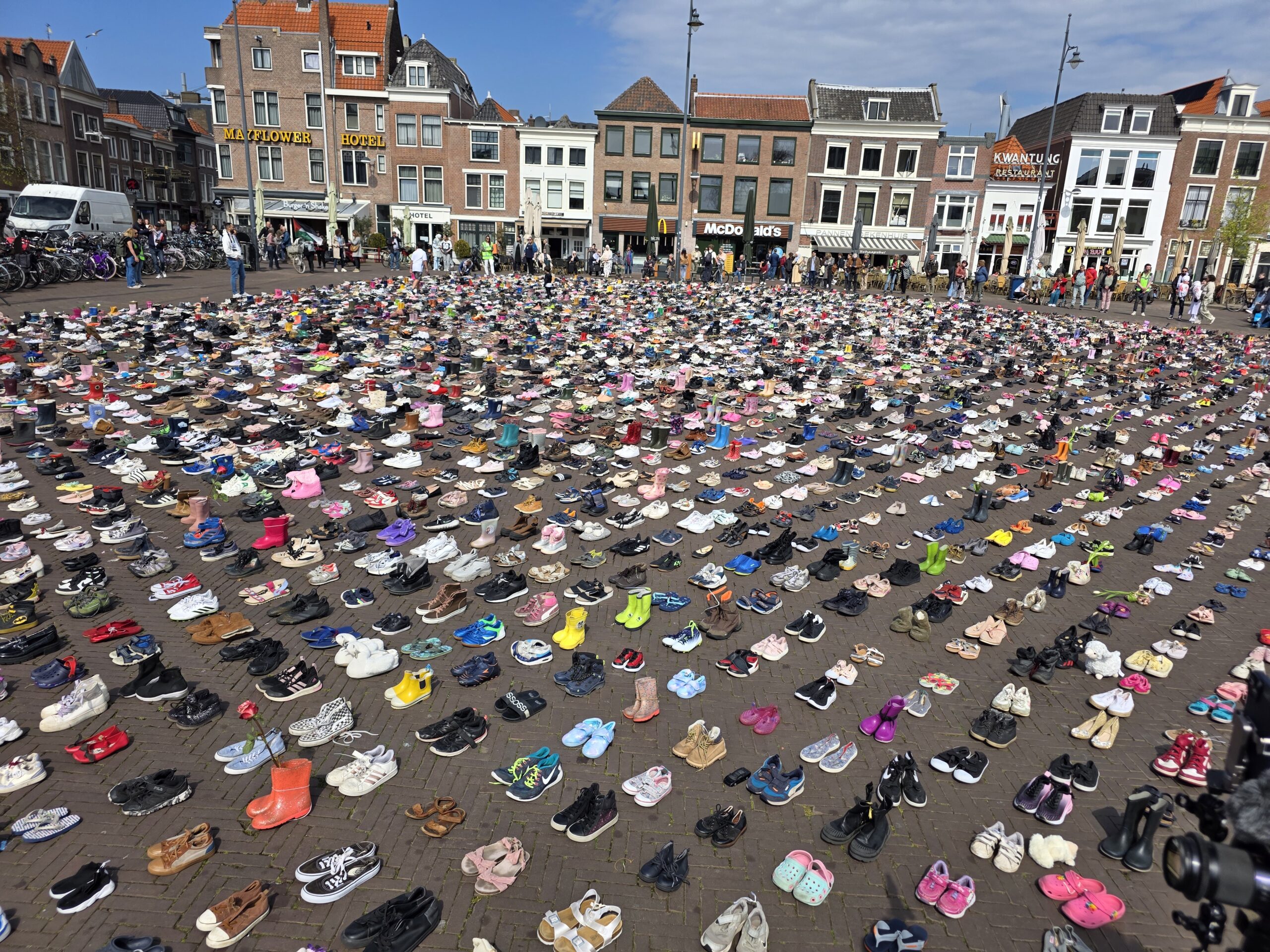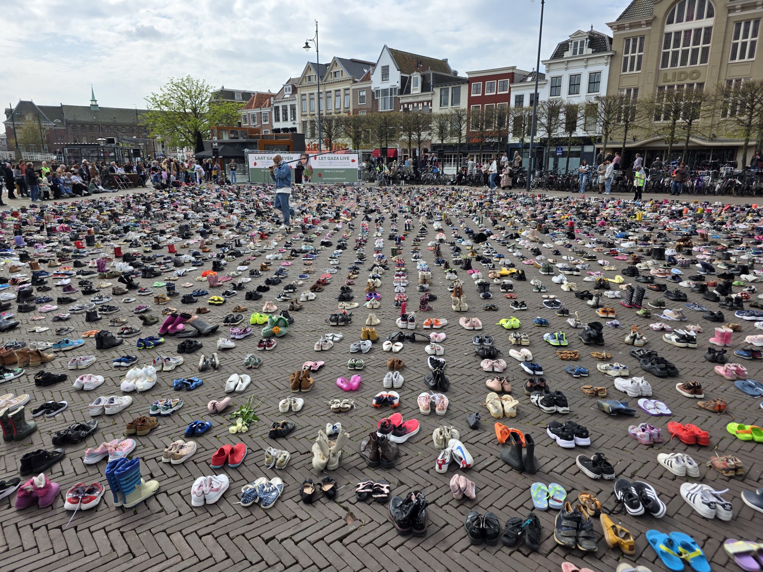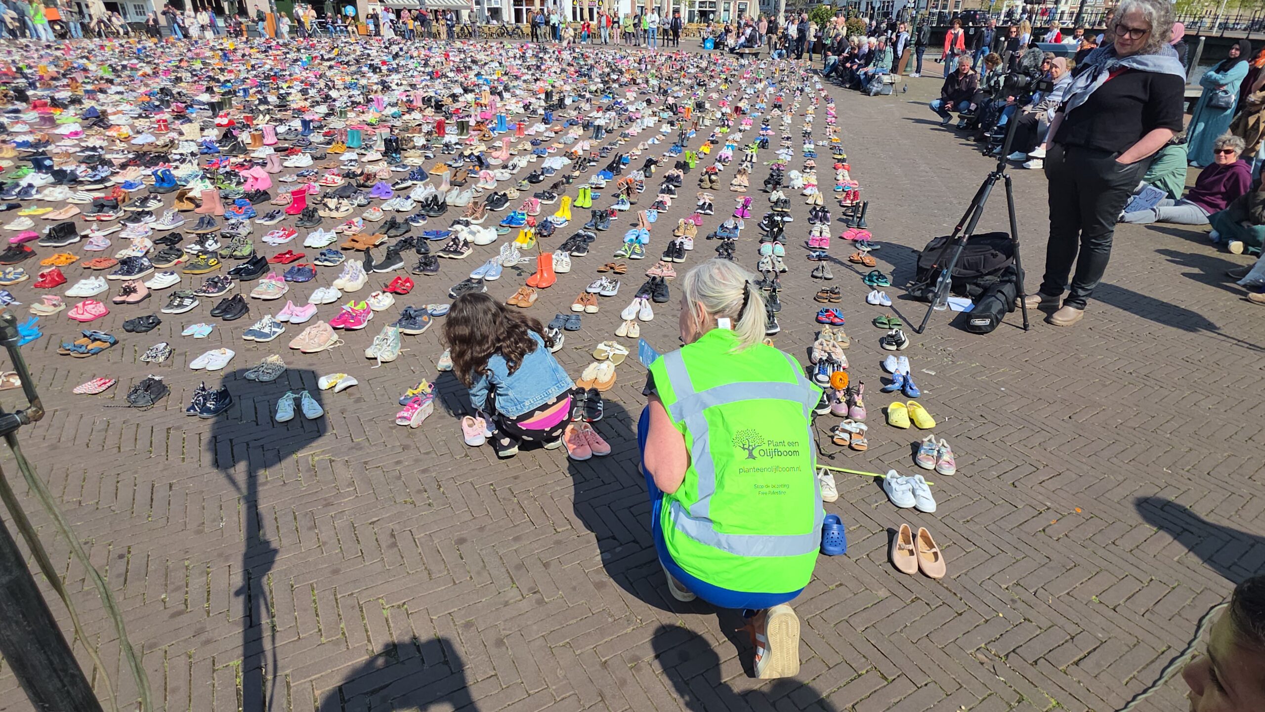 Het plein was gevuld met duizenden kinderschoentjes. Sommige met een knuffel, andere met een bloem. Ook kinderen die met hun ouders bij de manifestatie aanwezig waren, zetten schoentjes neer op het plein.